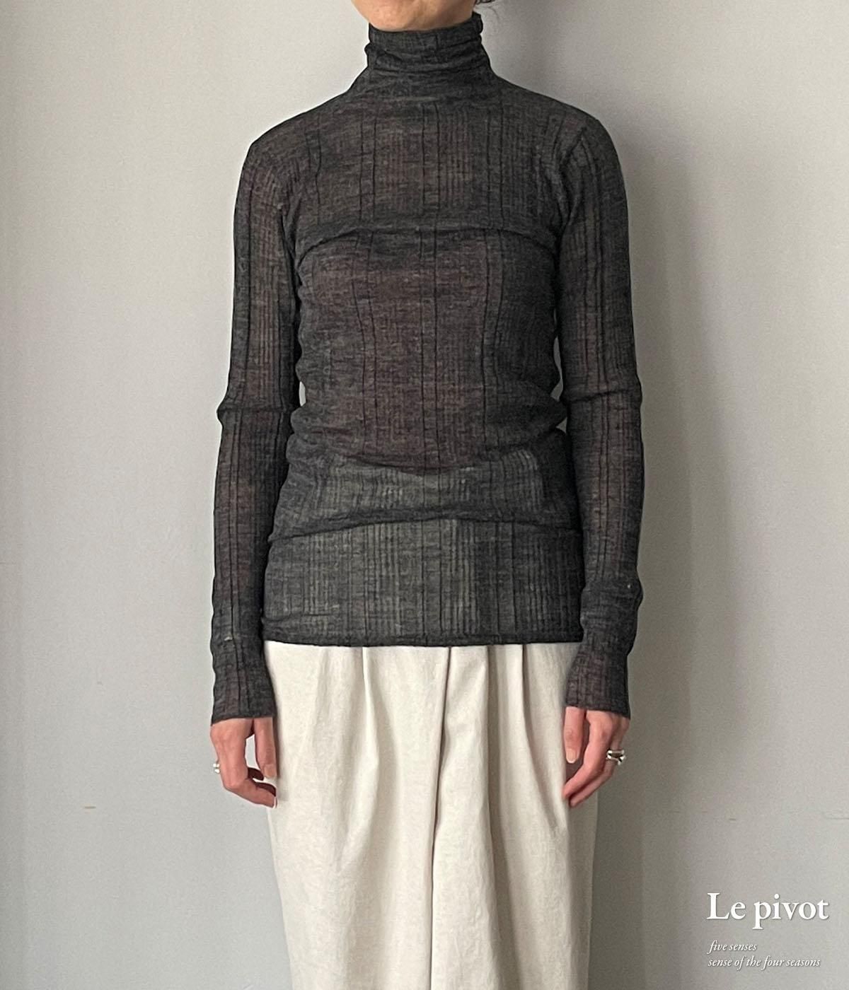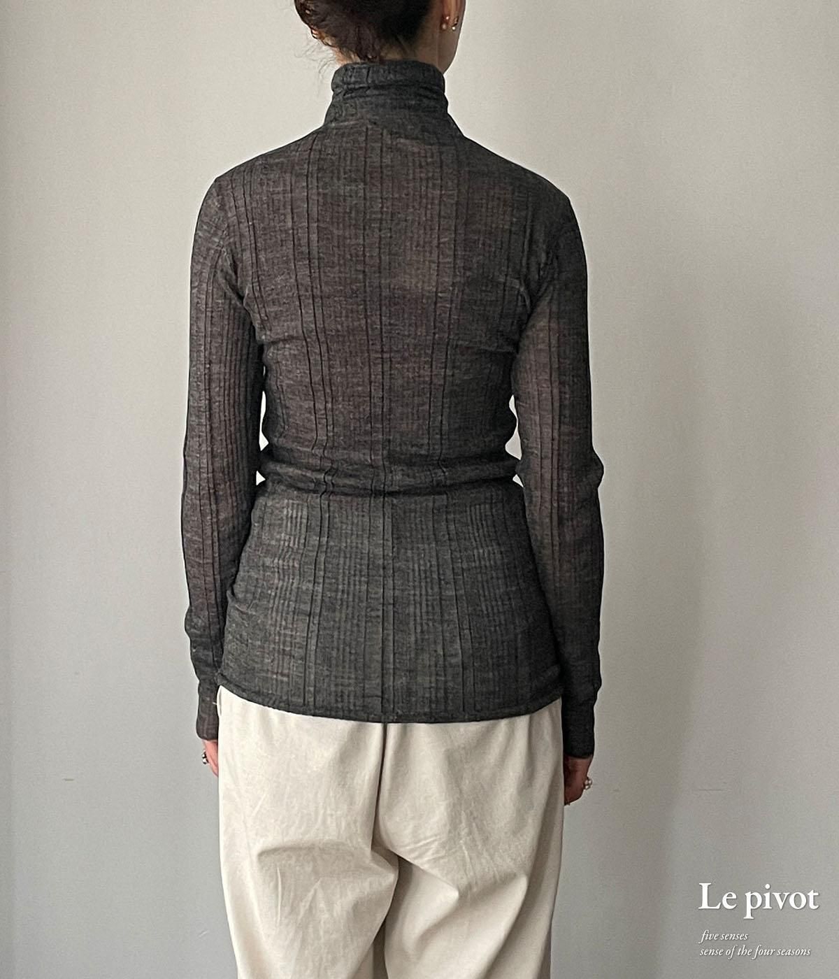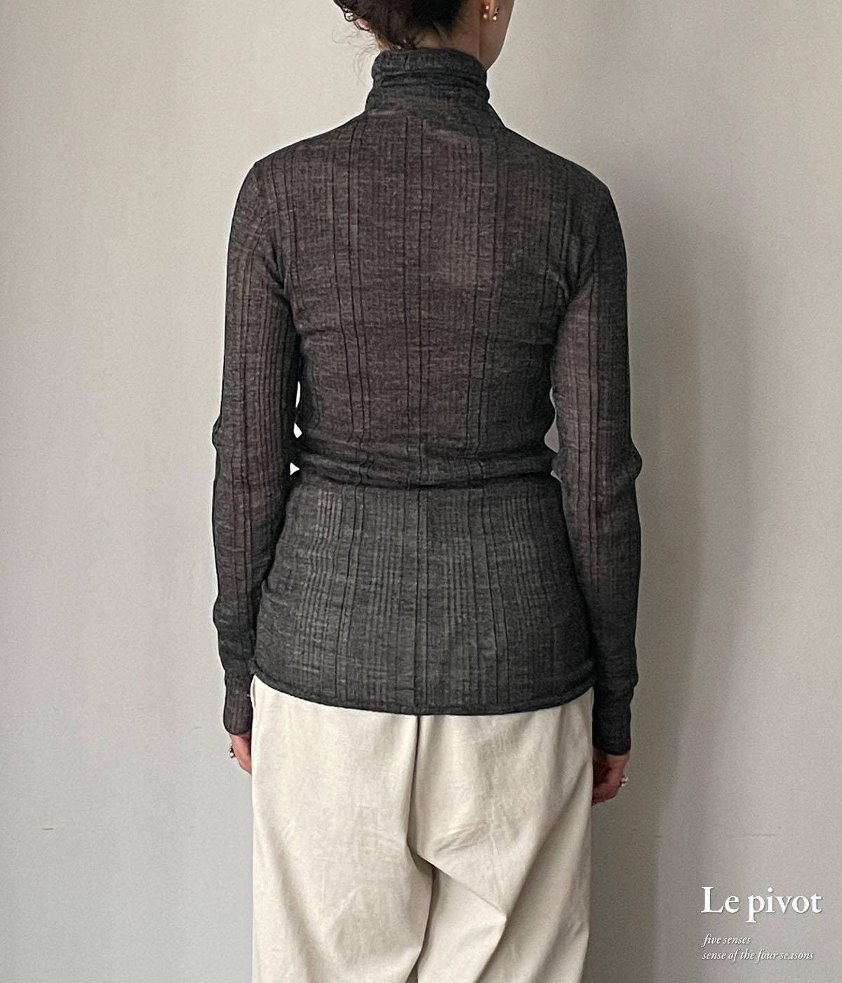 編地は変則的な針抜きのリブで、インナーとして重ねた時に少しだけ見えるバランスが新鮮な表情に。 衿から肩、袖にかけてきれいなラインで包んでくれて、長めの着丈・袖丈も嬉しいポイントです。
