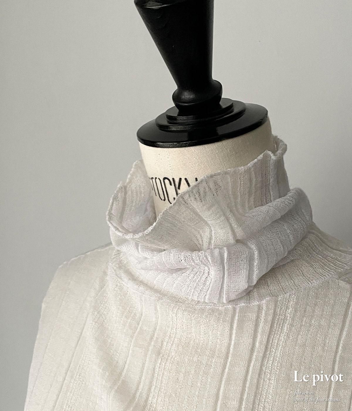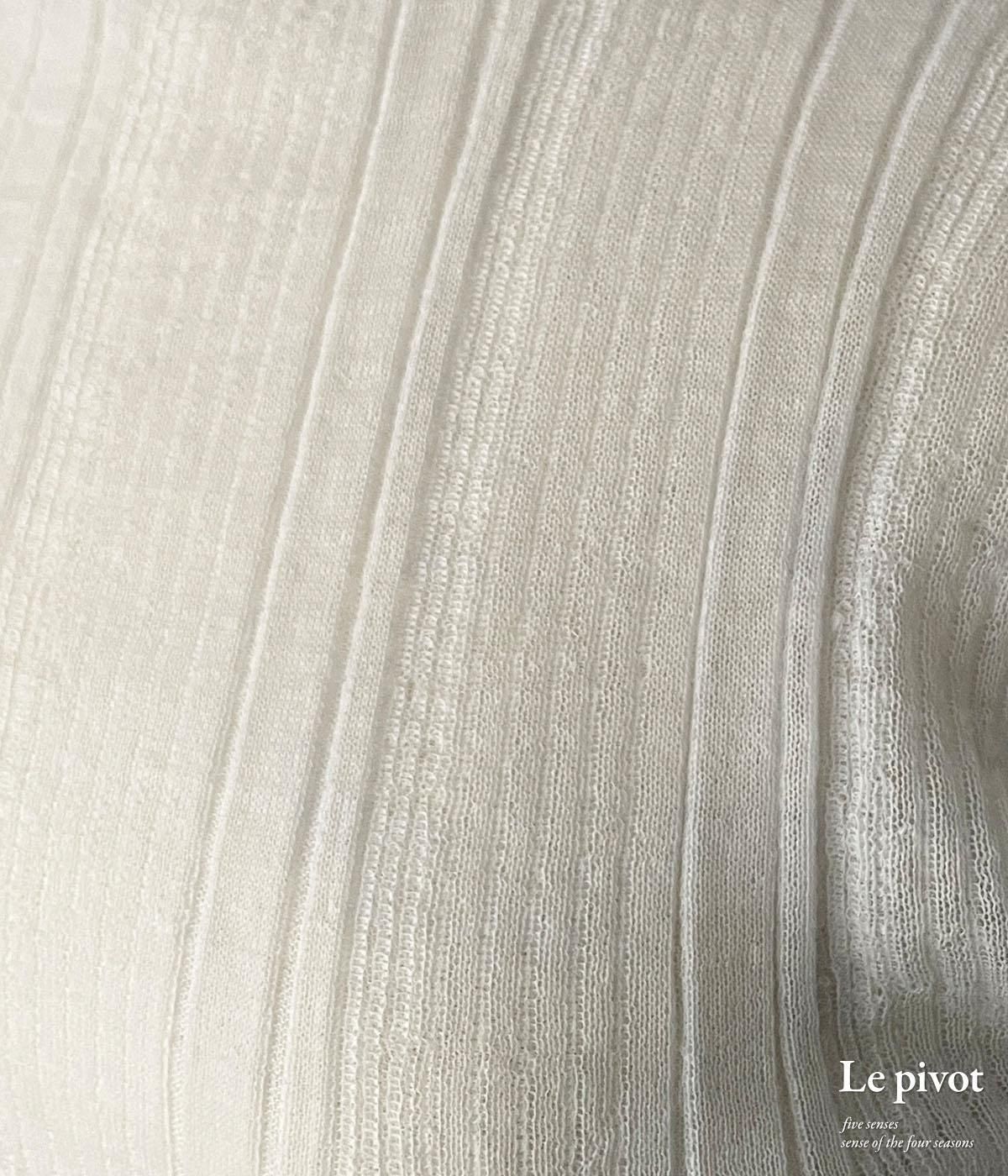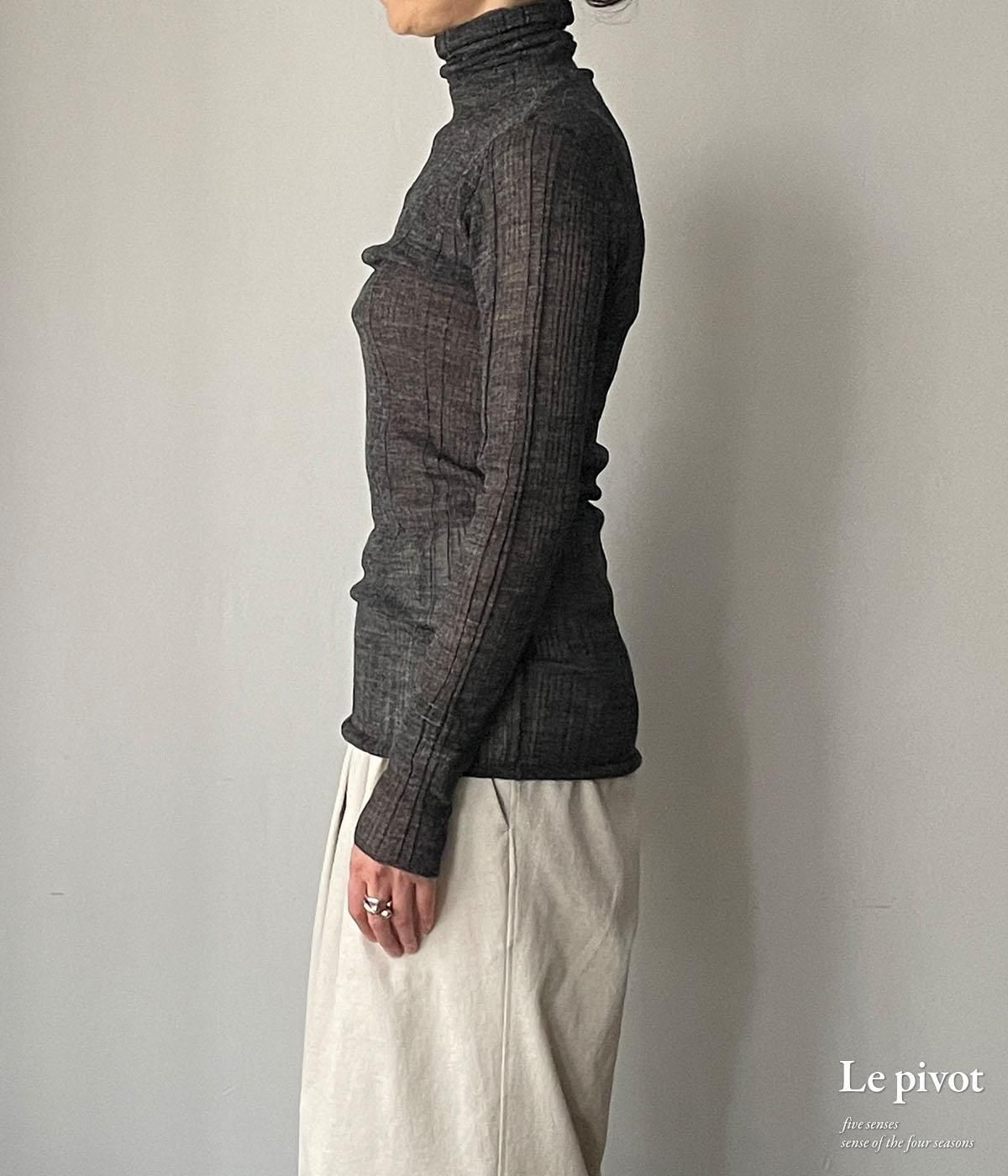 編地は変則的な針抜きのリブで、インナーとして重ねた時に少しだけ見えるバランスが新鮮な表情に。 衿から肩、袖にかけてきれいなラインで包んでくれて、長めの着丈・袖丈も嬉しいポイントです。