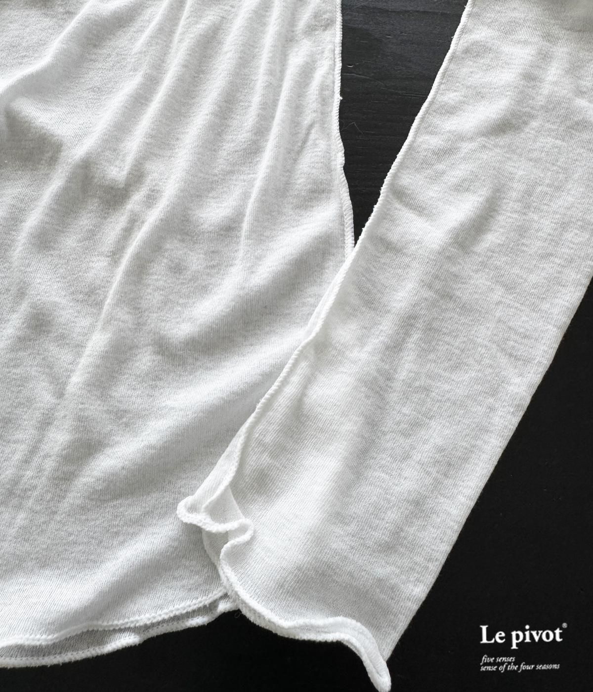 重ね着の際に、もたつかないようなサイズ感にしており、ネックや袖口からインナーを少し出すのも素敵です。袖下から脇にかけてはゴムロックが表に出るデザインになっています。そのため着用時の袖下から脇の縫い代が身体にあたるストレスがありません。綿だけとは思えないほどの伸縮性がありますので、とても心地よく着ていただけます。ワンピースやニット、シャツなど何にでも相性の良い1枚。ベーシックカラーに加え、サックス・ヌーディー・クリームなどのニュアンスカラーも揃えました。