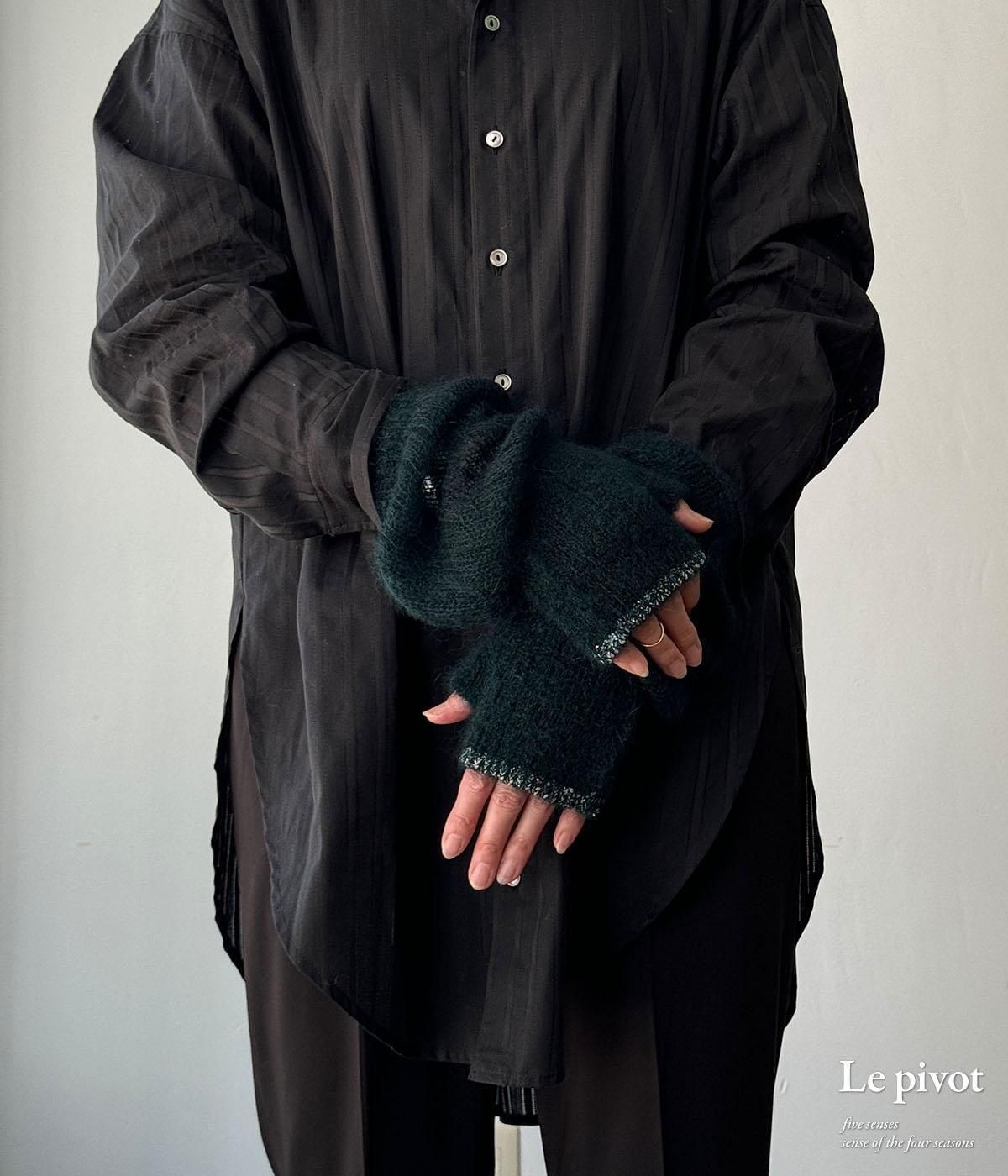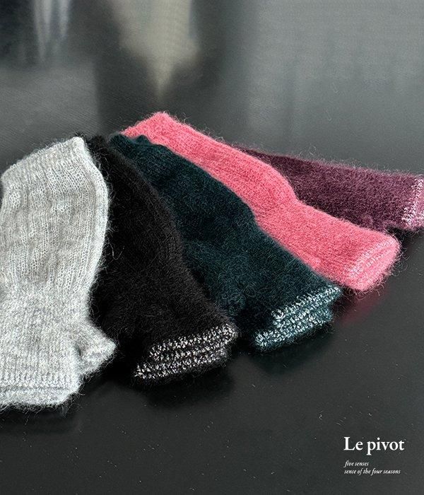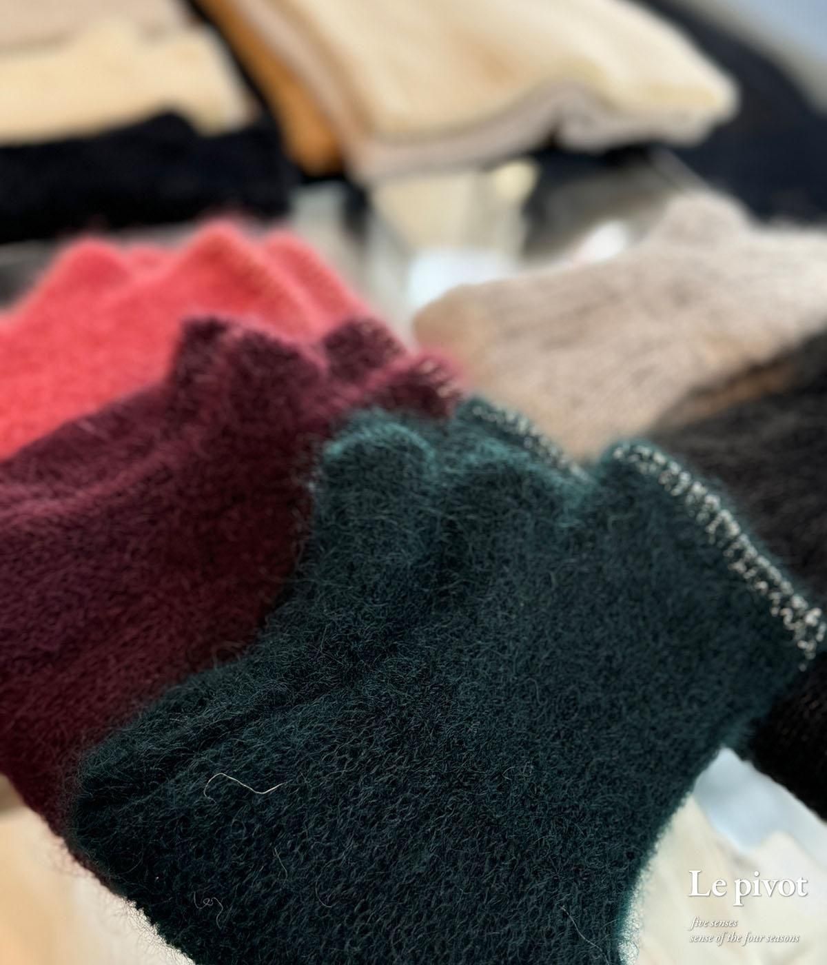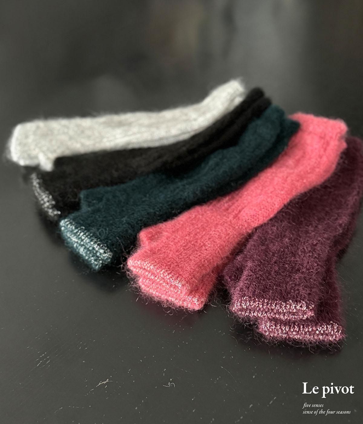 柔らかなキッドモヘアにポイントでラメ系をミックスしました。 2種類の編み地がポイントで、甲部分は度目を詰めてしっかり暖かく。 手首ラインはテンションを変えて、とてもゆるくふわっとした仕上がりにしています。