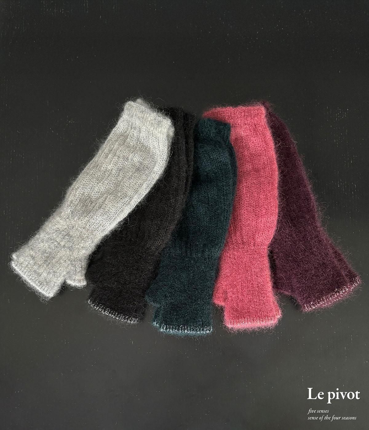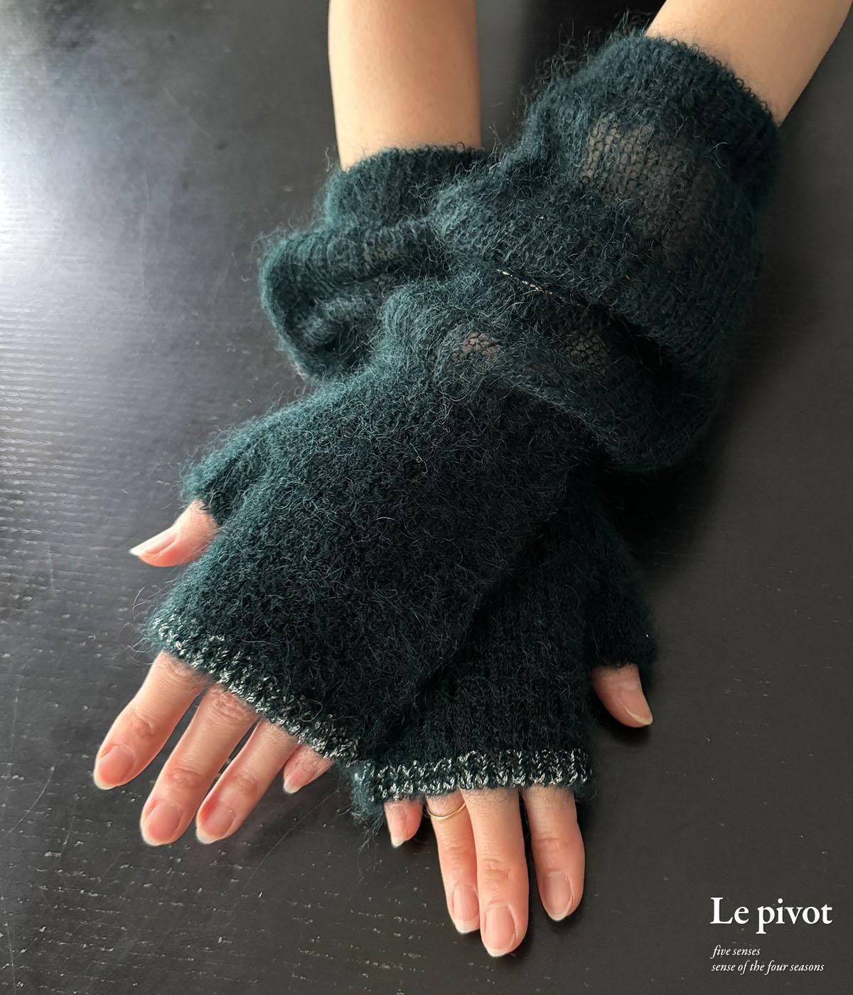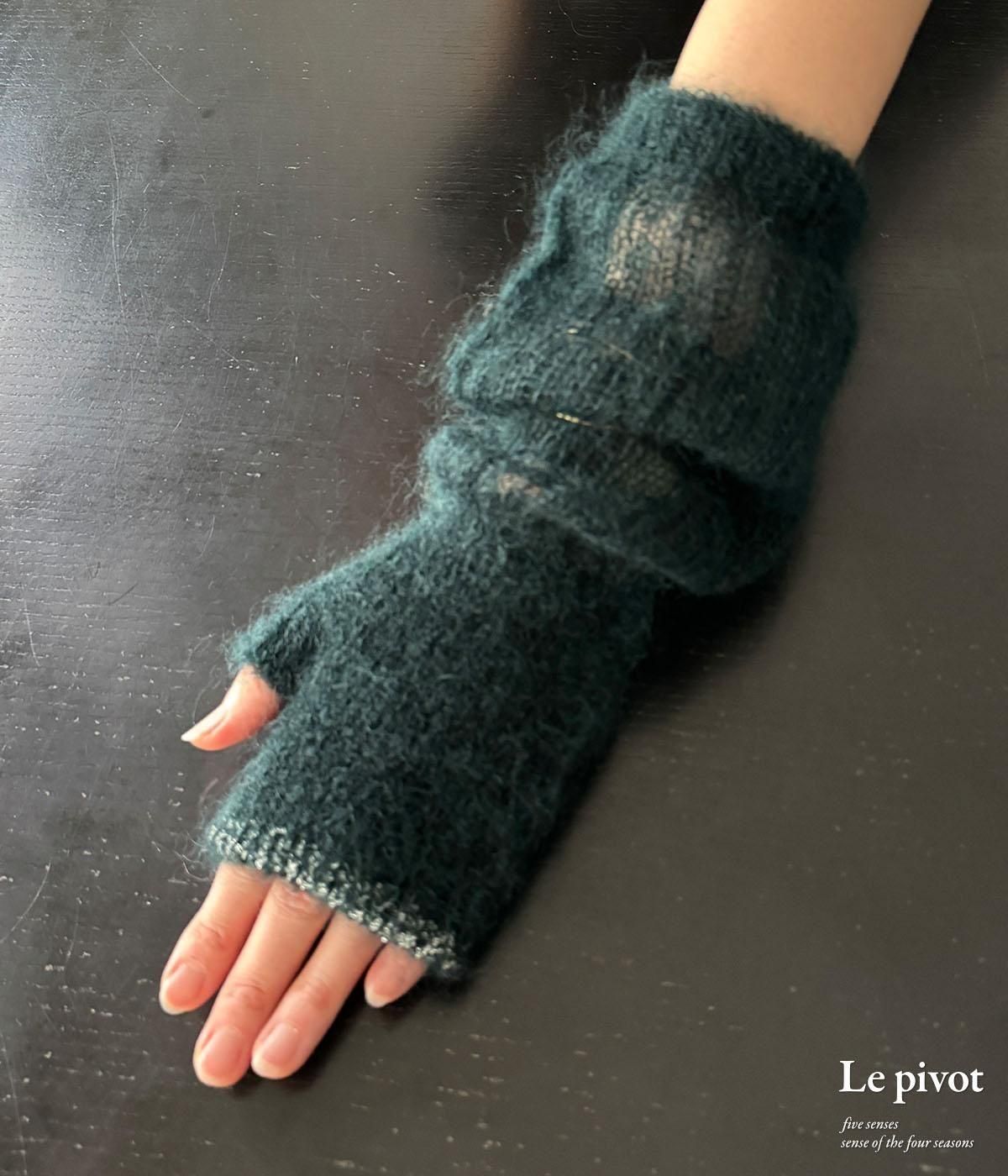 柔らかなキッドモヘアにポイントでラメ系をミックスしました。 2種類の編み地がポイントで、甲部分は度目を詰めてしっかり暖かく。 手首ラインはテンションを変えて、とてもゆるくふわっとした仕上がりにしています。