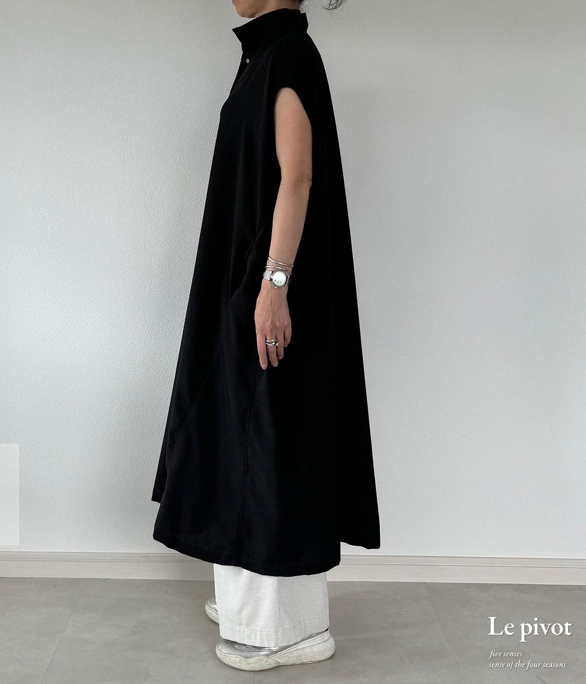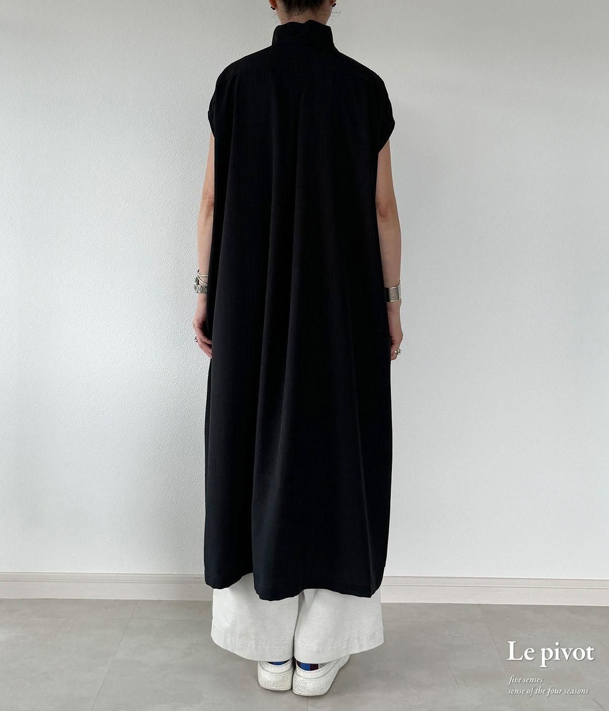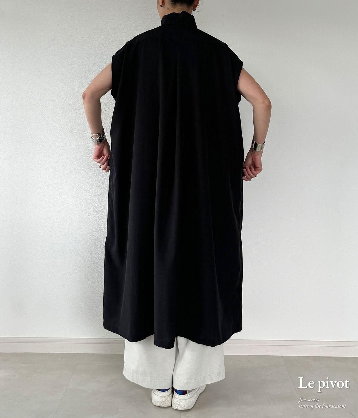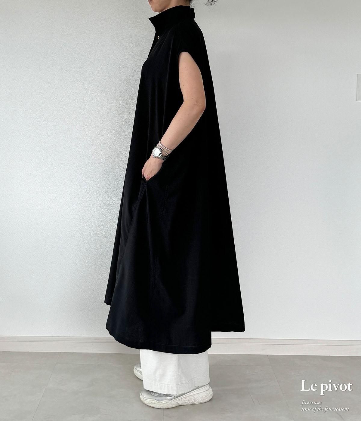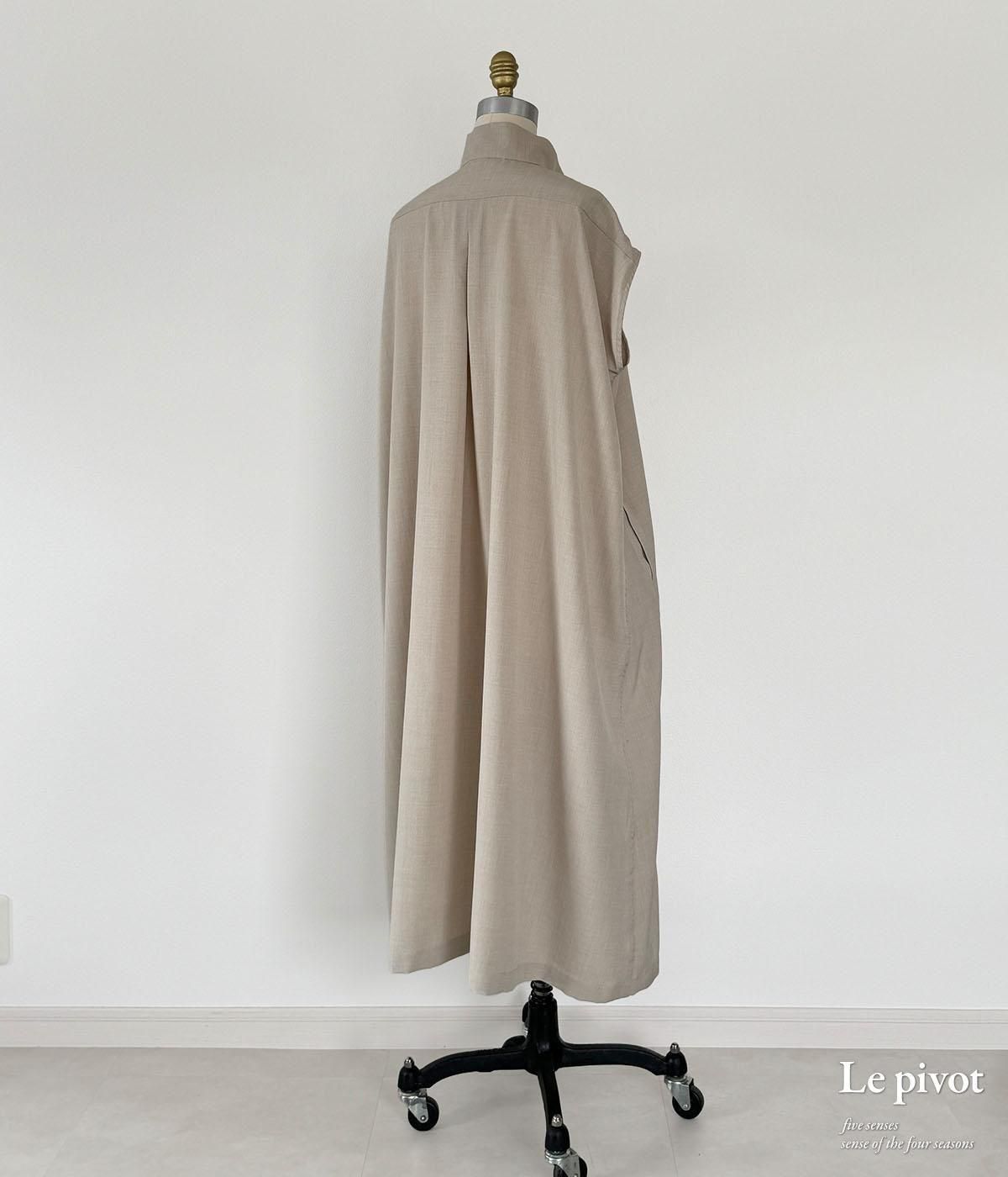 オーバーサイズのワンピースですが、素材がしなやかなので、落ち着いたボリューム感に。平らなシルエットにならないように、脇ハギを斜めにしています。肩周りもカバー力のあるサイジングです。