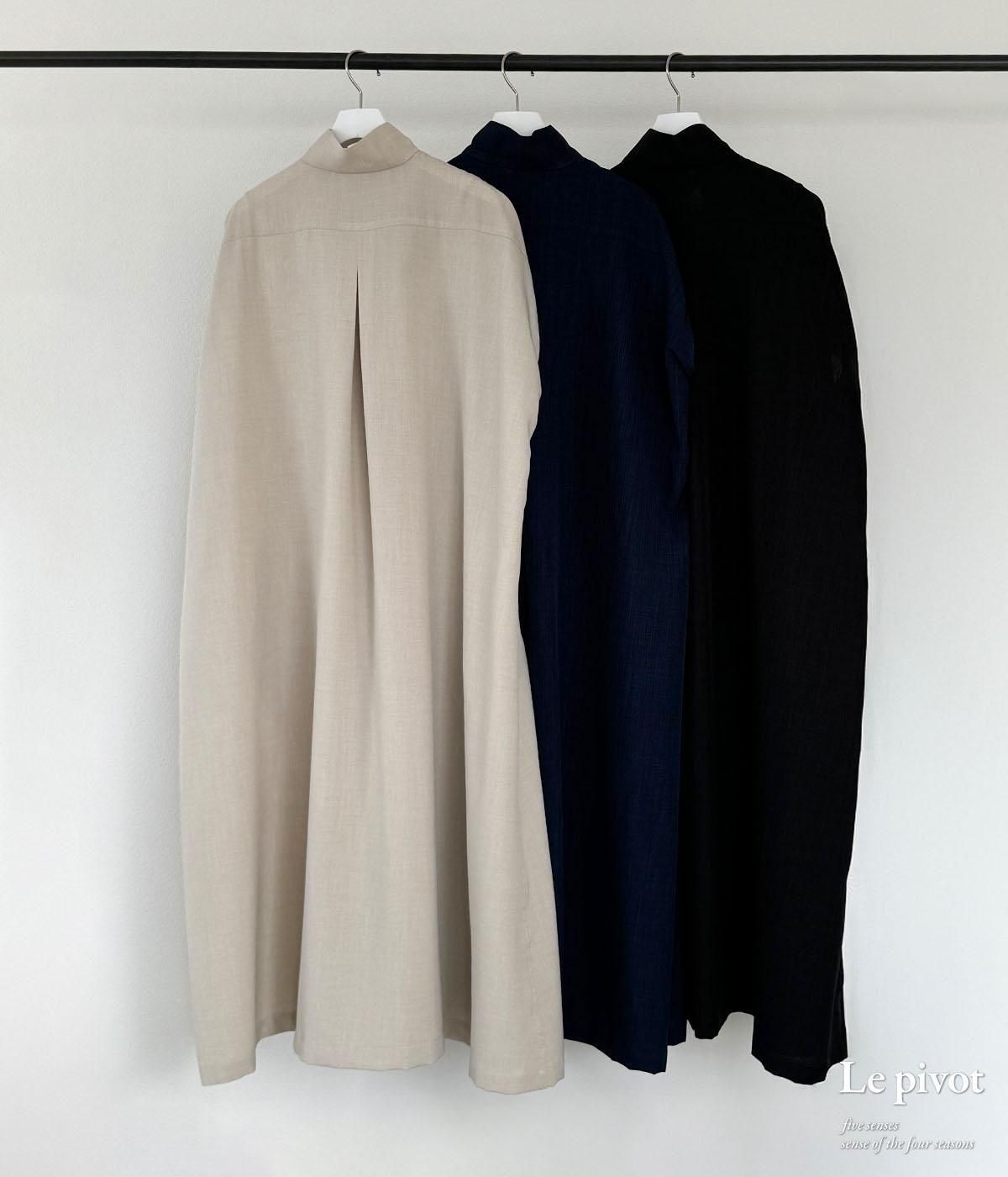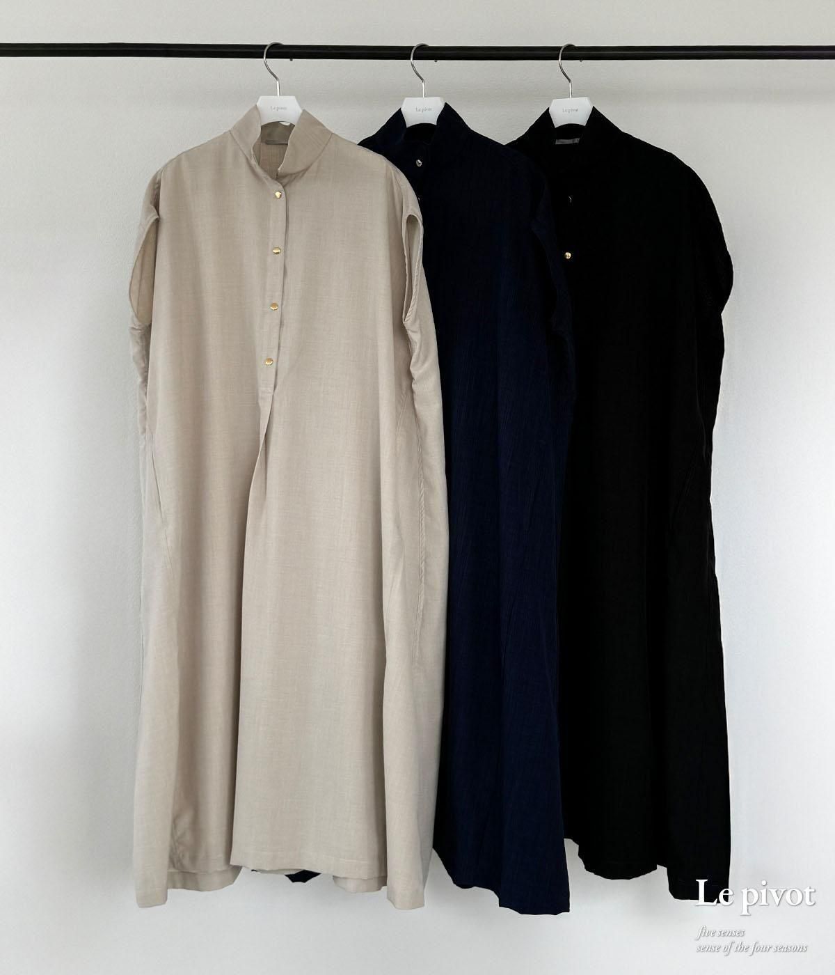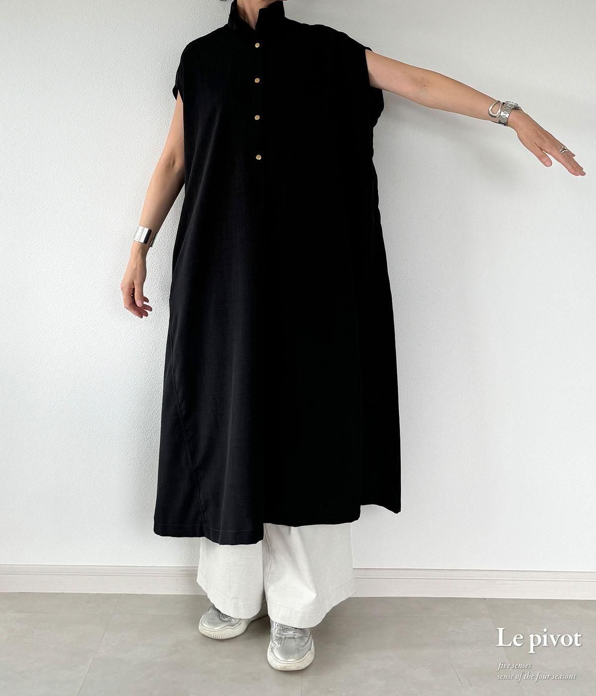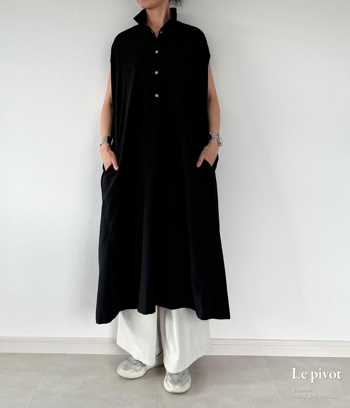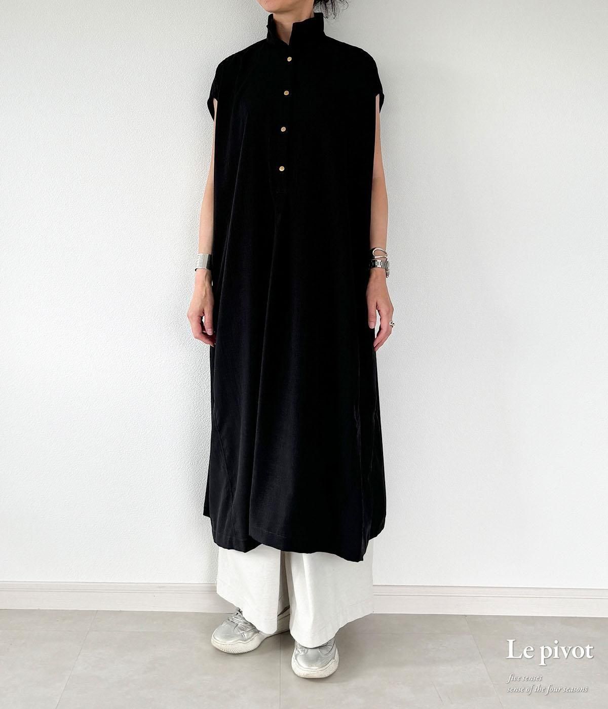 オーバーサイズのワンピースですが、素材がしなやかなので、落ち着いたボリューム感に。平らなシルエットにならないように、脇ハギを斜めにしています。肩周りもカバー力のあるサイジングです。