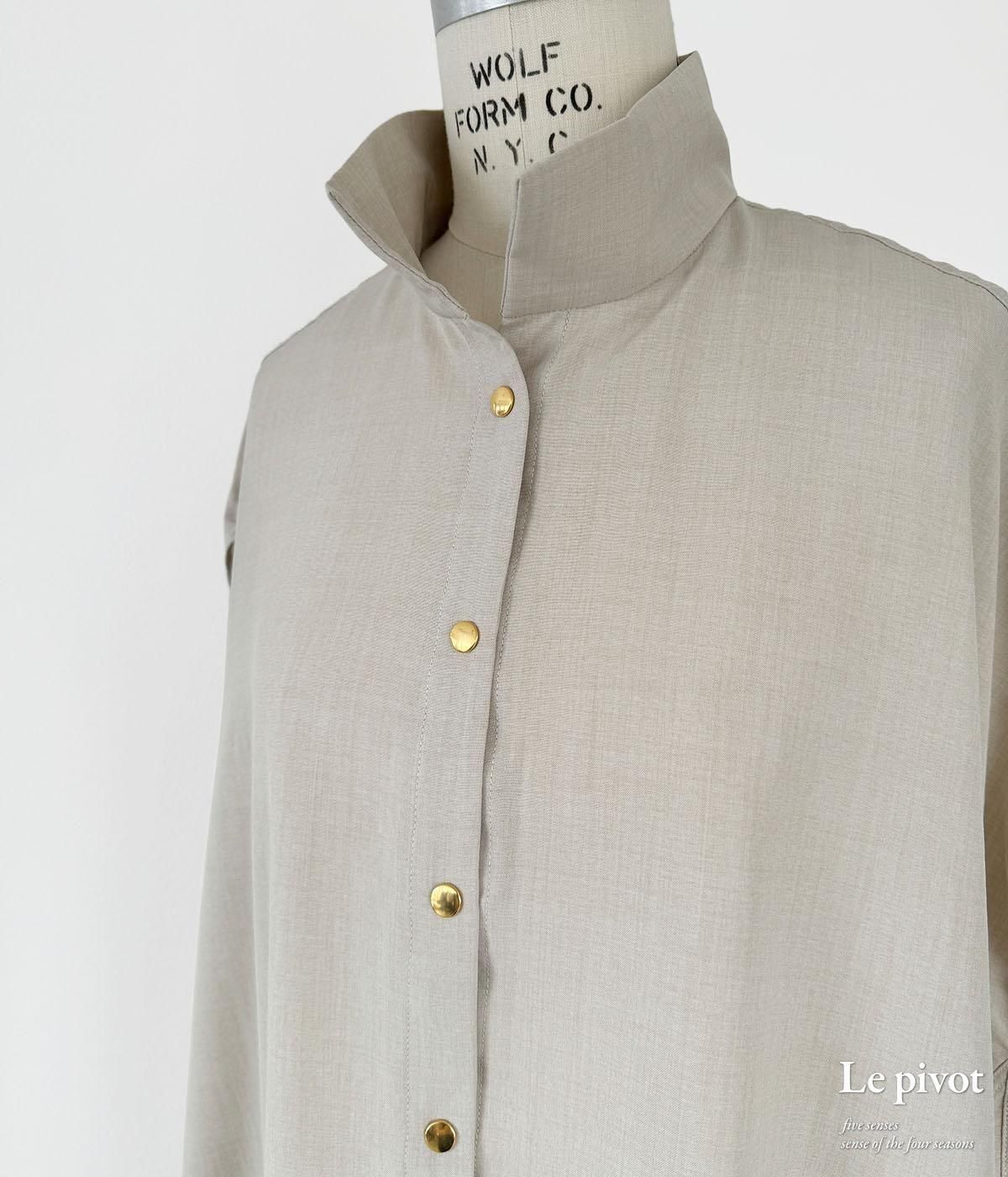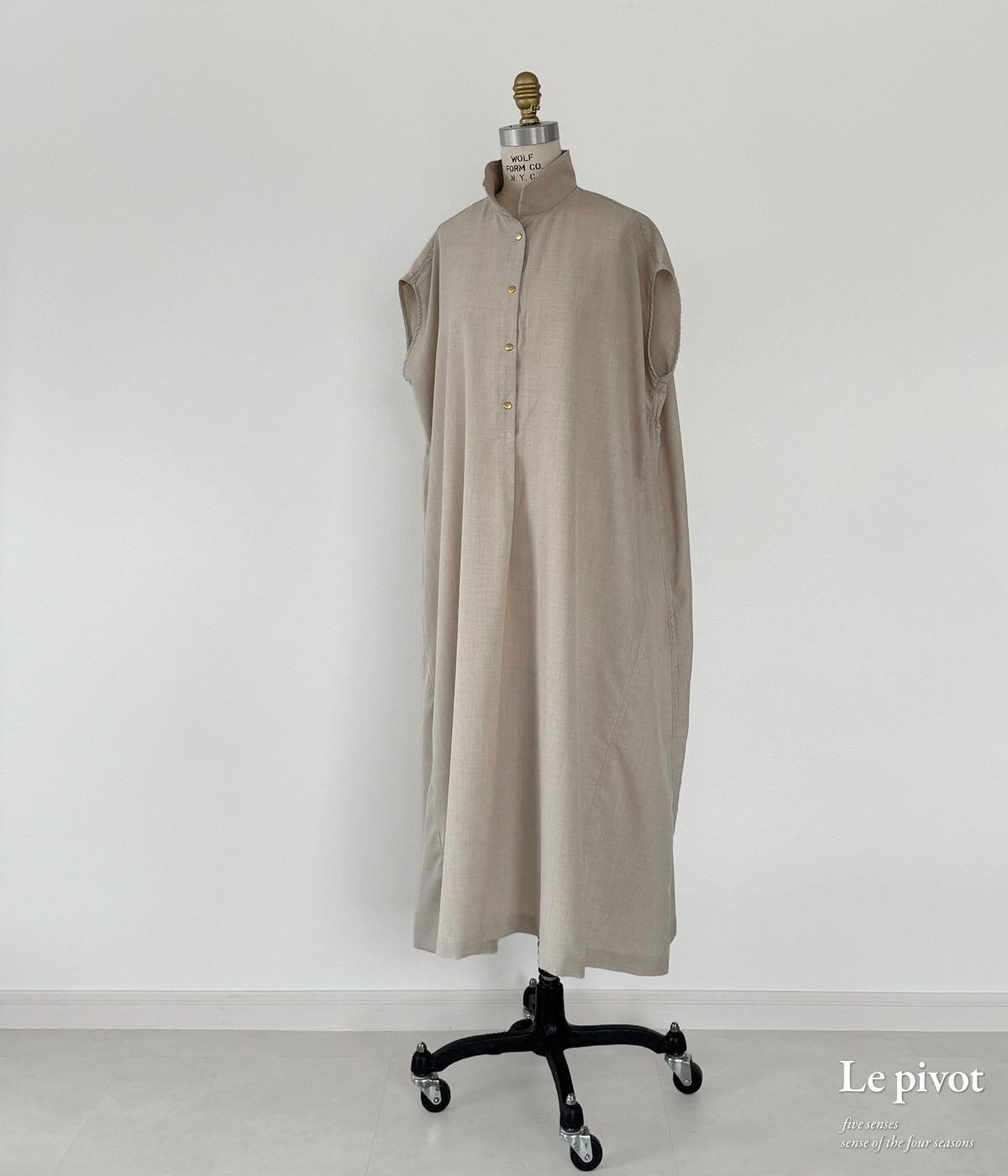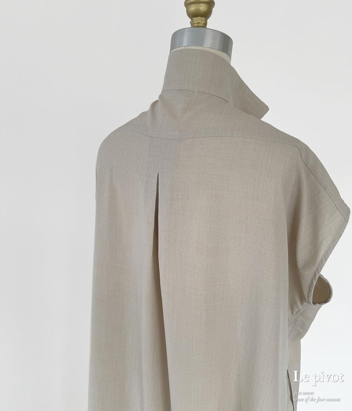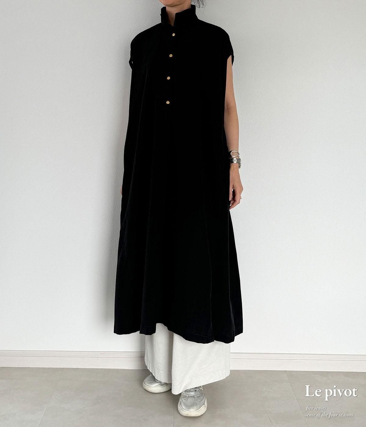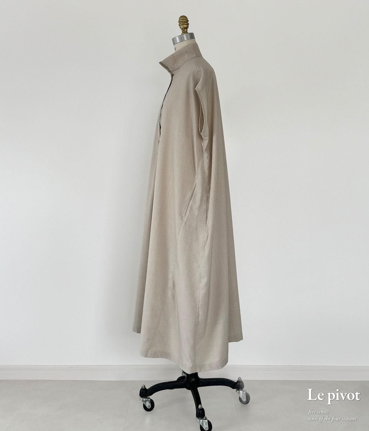 オーバーサイズのワンピースですが、素材がしなやかなので、落ち着いたボリューム感に。平らなシルエットにならないように、脇ハギを斜めにしています。肩周りもカバー力のあるサイジングです。