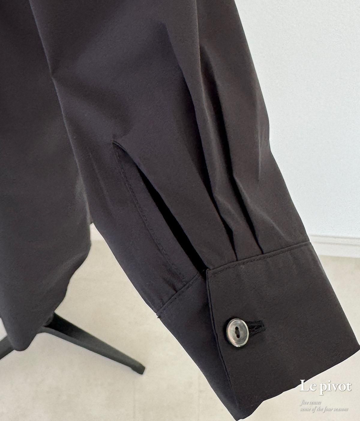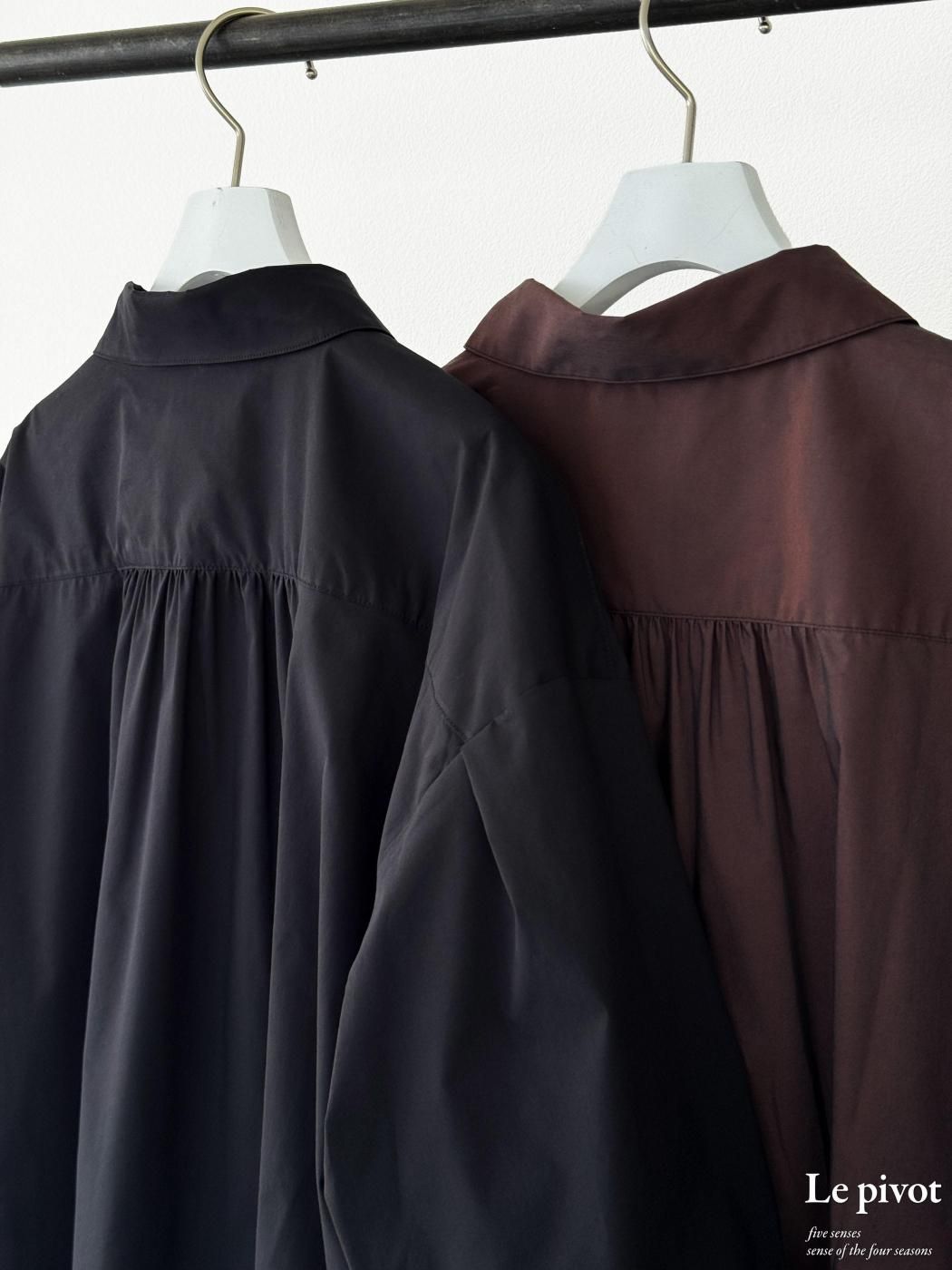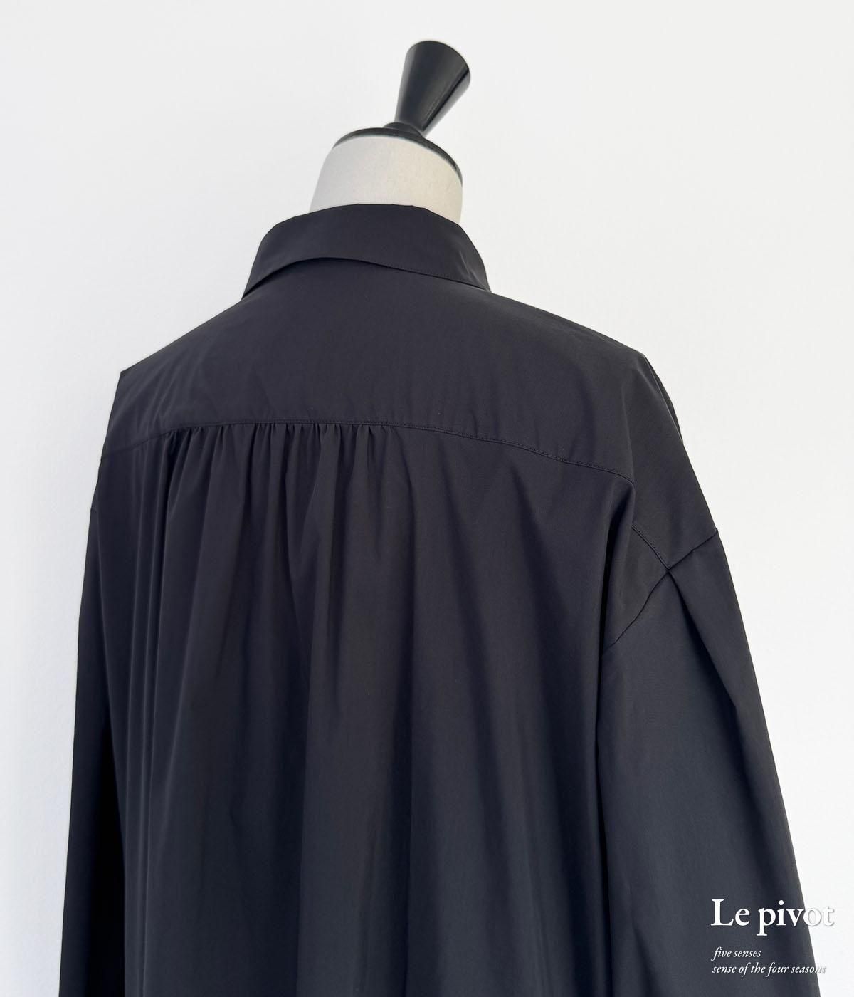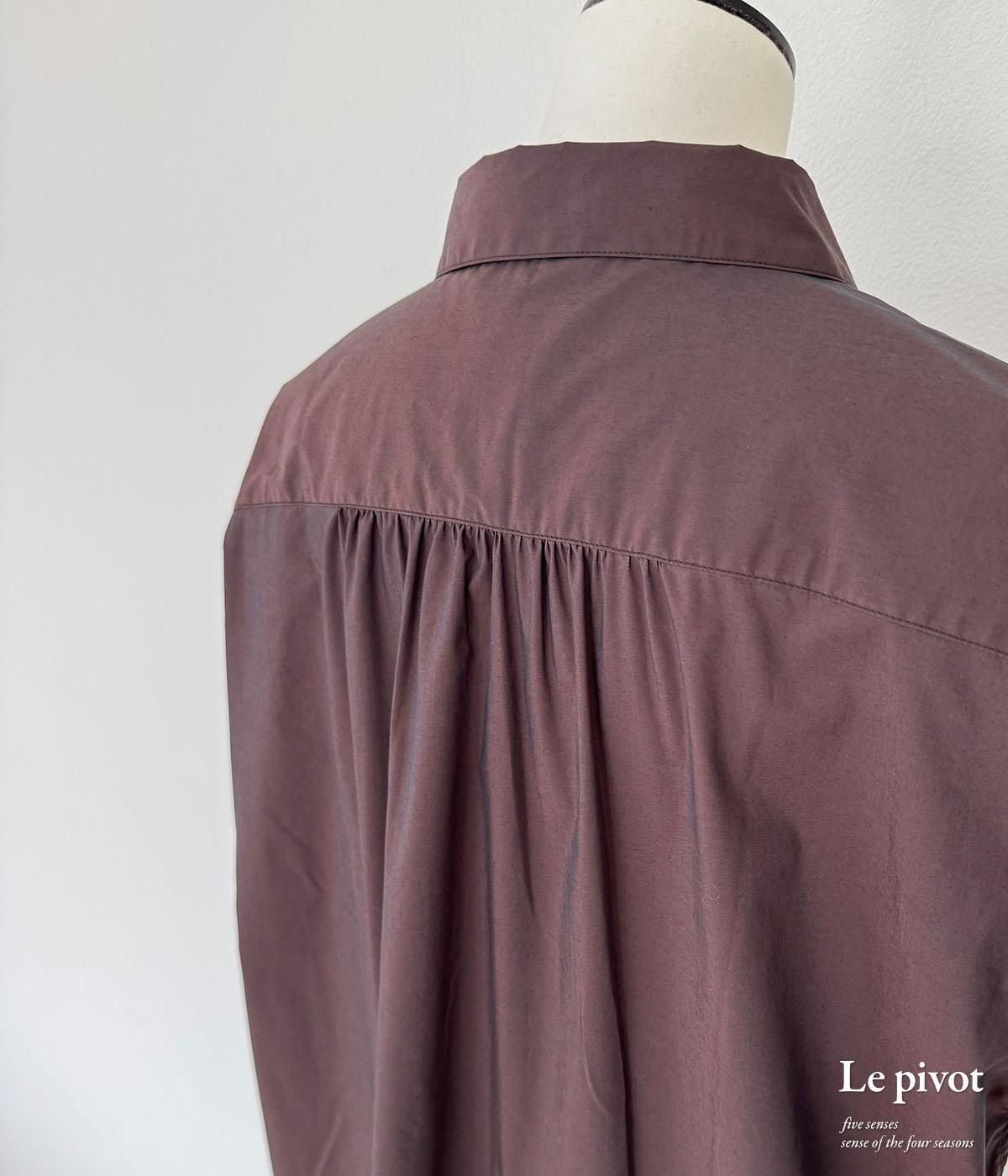アームホールの袖付け後ろ側に少しタックを入れることで立体的で動きやすく、後ヨークに少しギャザーを入れることで、シンプル過ぎない後ろ姿を見せてくれます。 また、両サイドの裾スリットを長めに取っているので、着た時に動きを出してくれます。