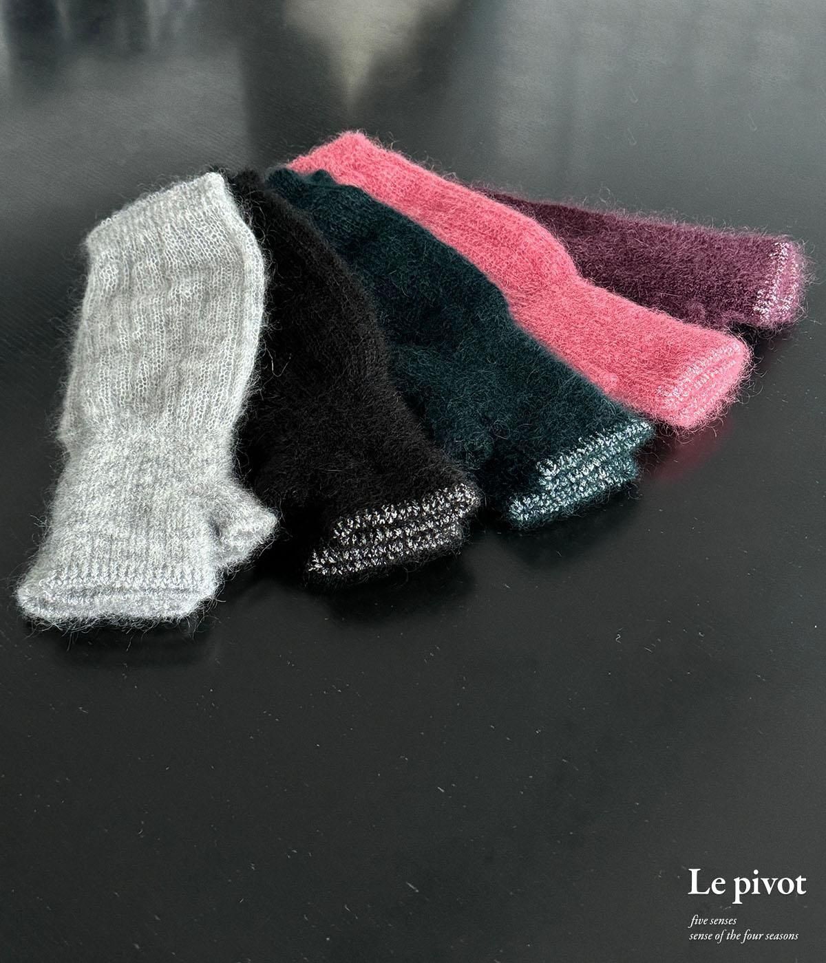 柔らかなキッドモヘアにポイントでラメ系をミックスしました。 2種類の編み地がポイントで、甲部分は度目を詰めてしっかり暖かく。 手首ラインはテンションを変えて、とてもゆるくふわっとした仕上がりにしています。