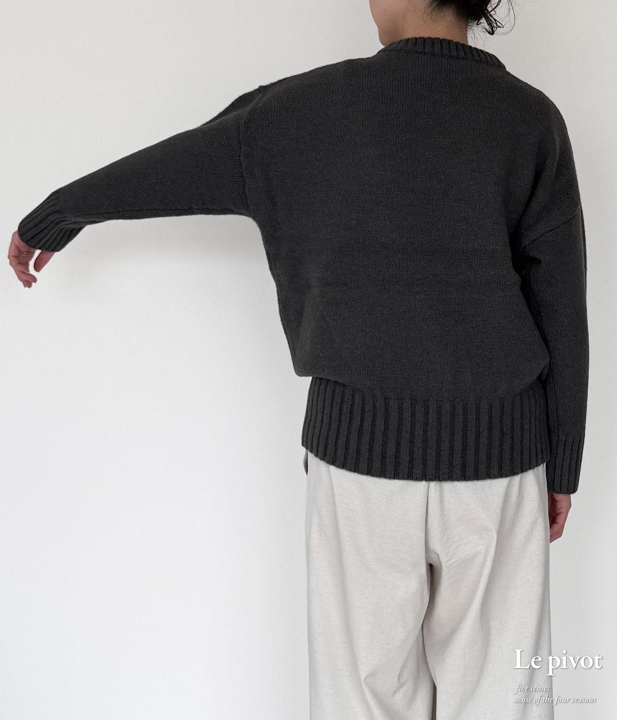 肩が少し落ち、袖口に向けて細くなるデザインは、腕が動かしやすく、アウターも選びません。衿ぐりは軽くゆとりを入れ、着用するとリブで少しだけ立ち上がります。