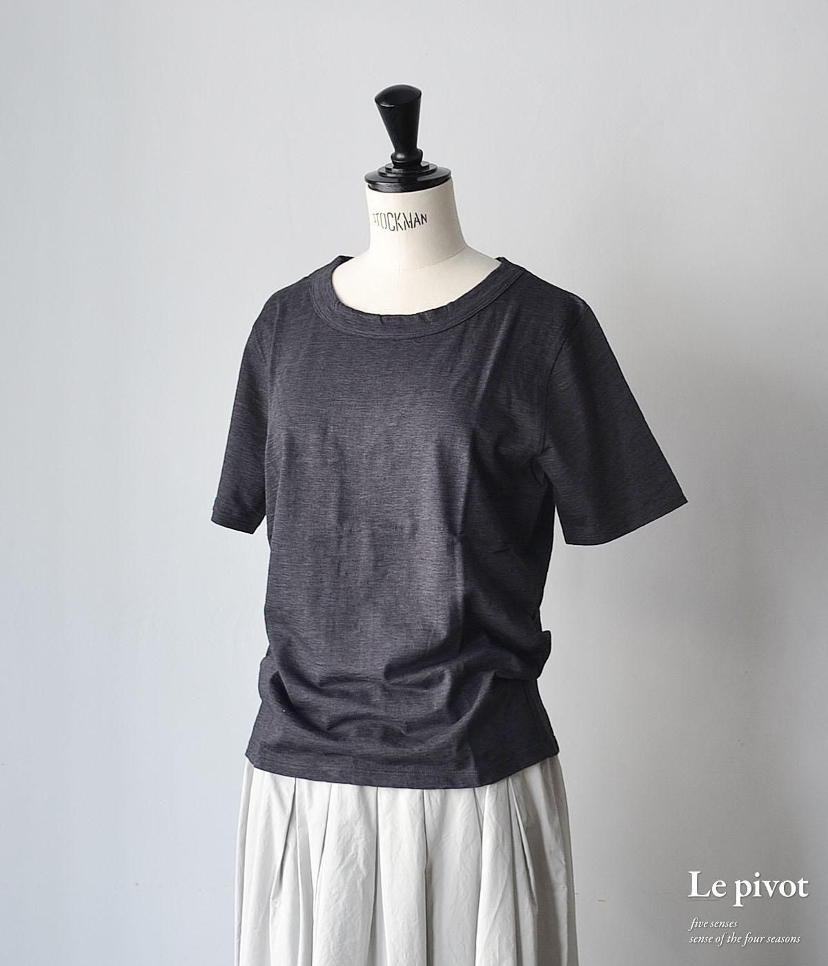 表面のムラ感で表情があり、とても柔らかく気持ちのよい素材です。衿ぐりの太めの共布がポイントで、共布なので、若干ヨレてきますがそれも特徴の1つです。やや横広がりのクルーネックT。袖山が高く、袖丈も少し長めにとってあるので、下着や脇の開きも気にならず、腕も綺麗に見えるTシャツです。