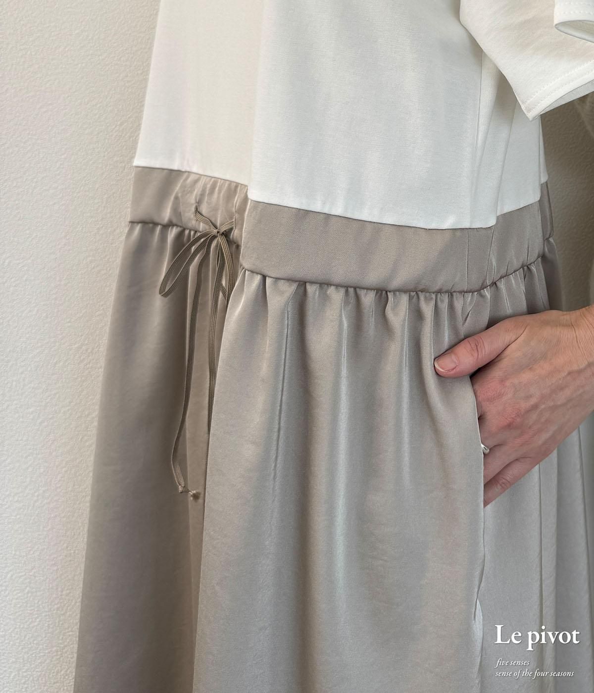 デザインは安心感のある、二の腕がしっかり隠れつつも、すっきりとしたネック周りのワンピース。ウエストの紐をしめることでシルエットに変化を持たせられます。