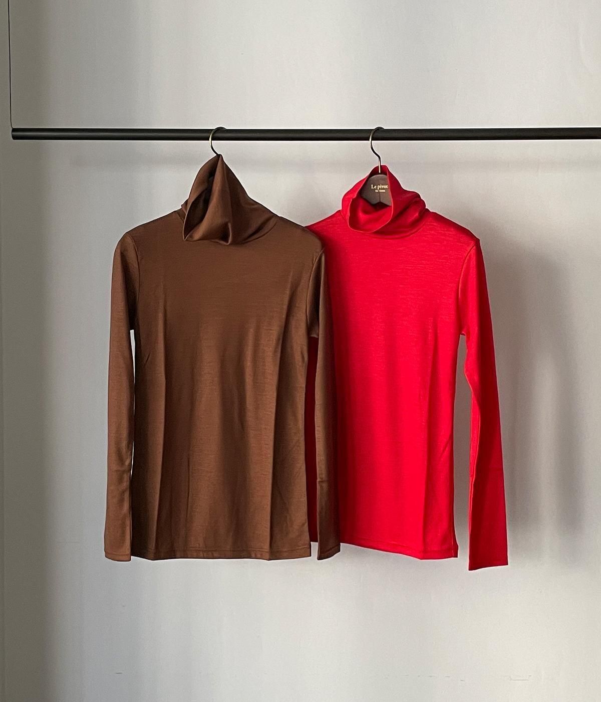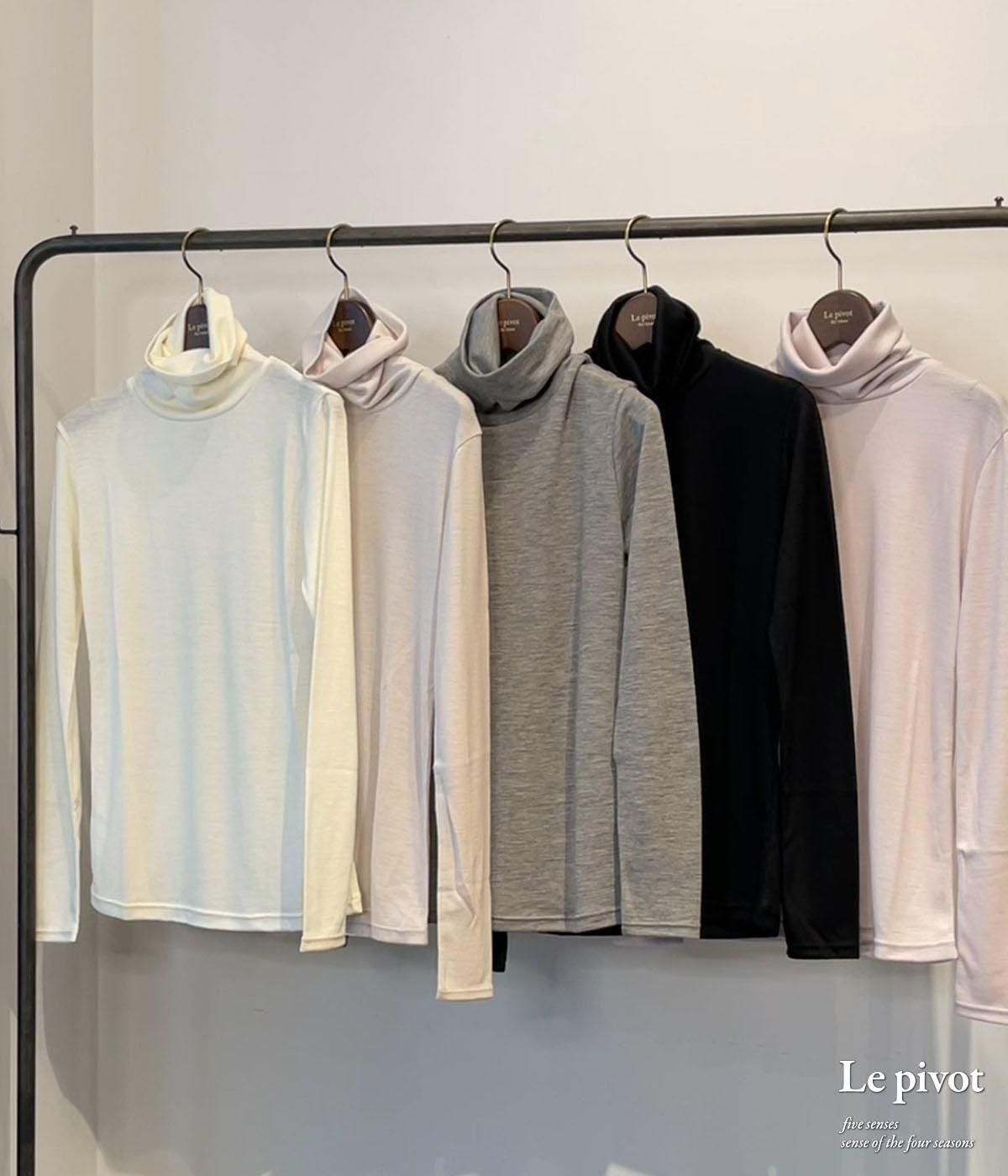 首周りに程よくフィットするテンションなので、タートル好きな方にはおすすめの1枚です。長めの衿はわからないくらいに、少しねじらせて付けています。2つ折りでも少し長め。 クシュクシュしても程よい長さです。 着丈が長いのもポイントです。