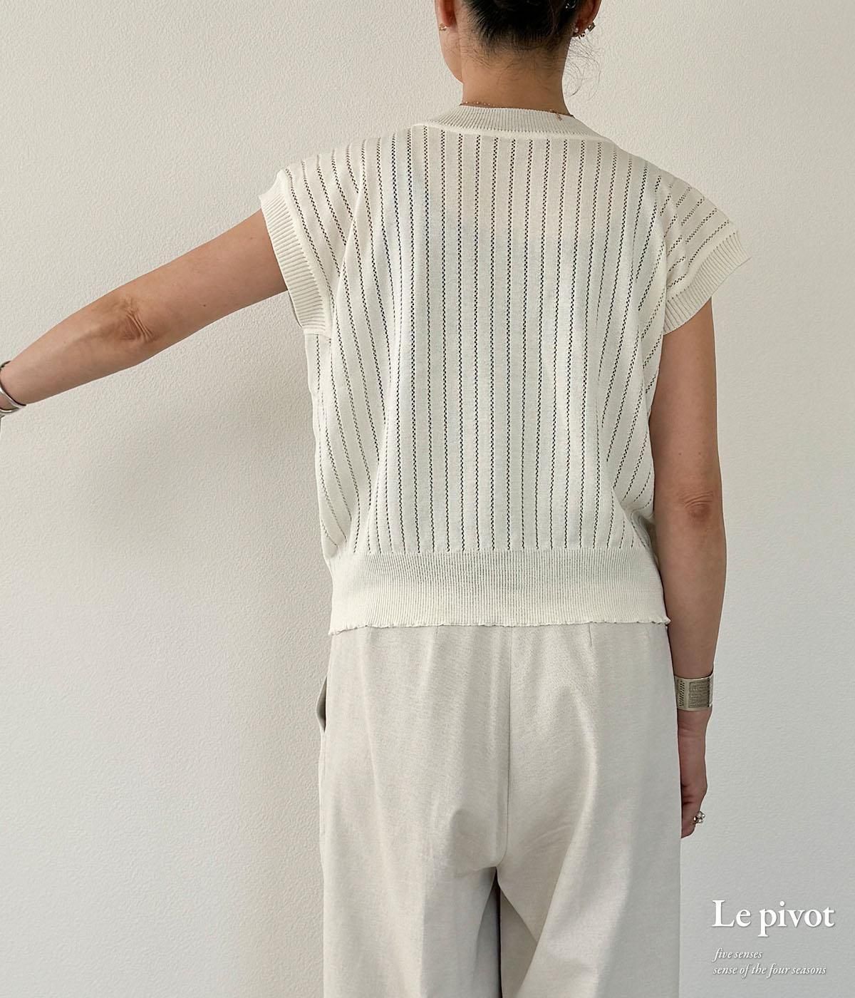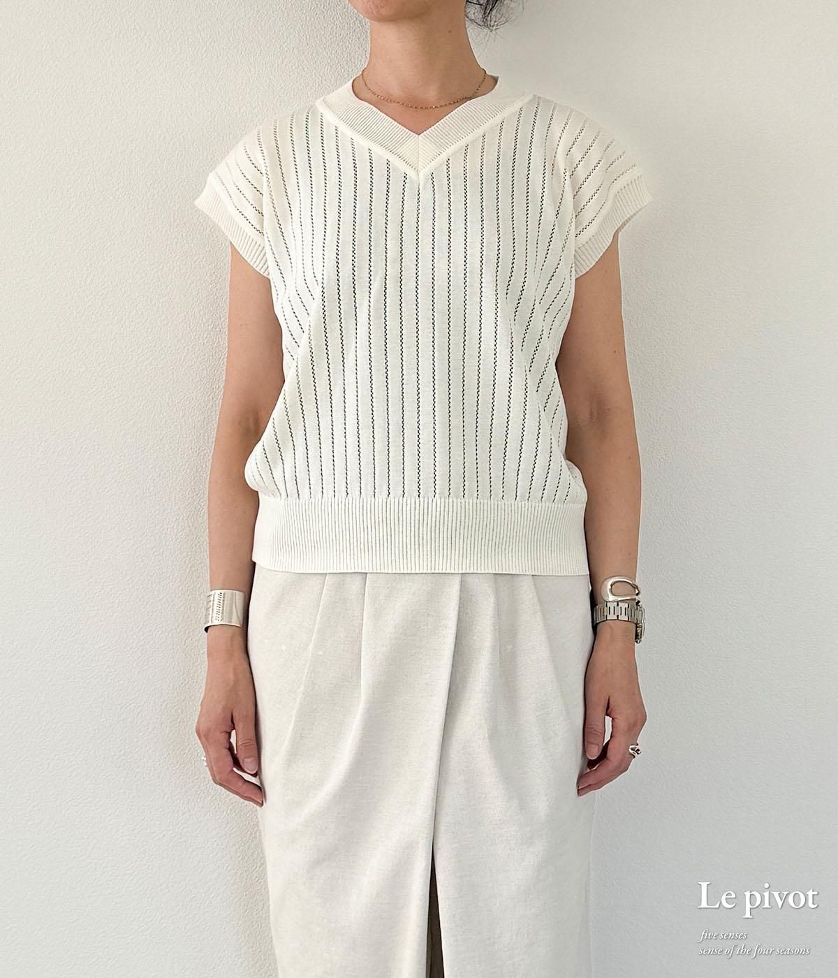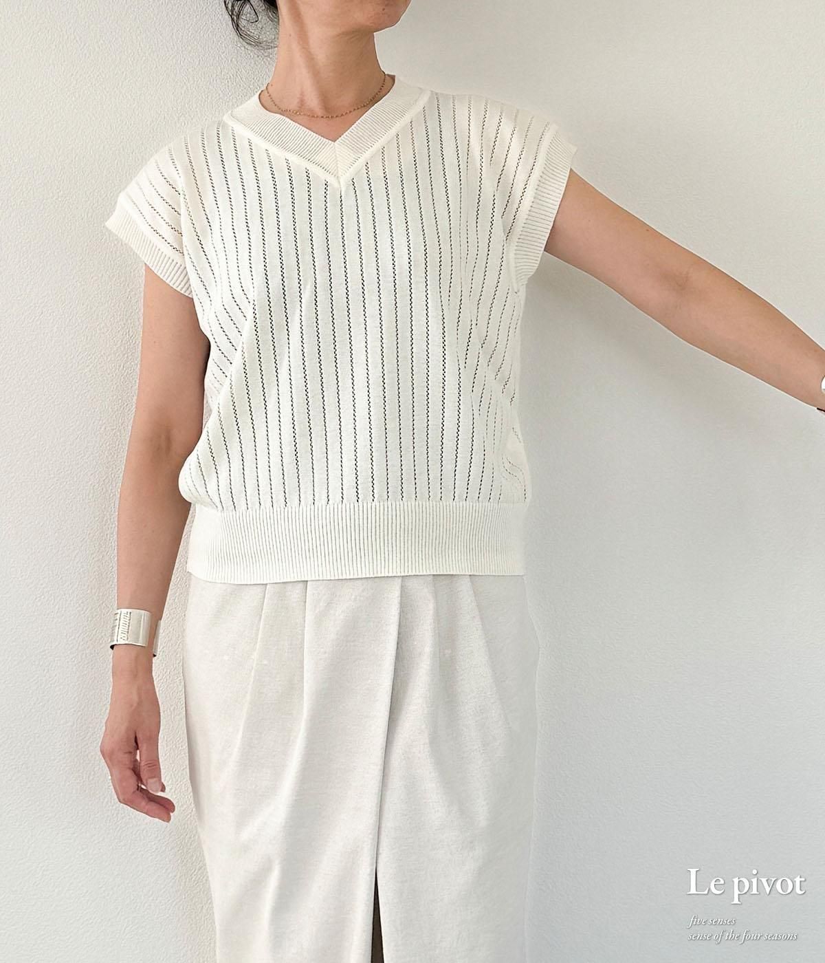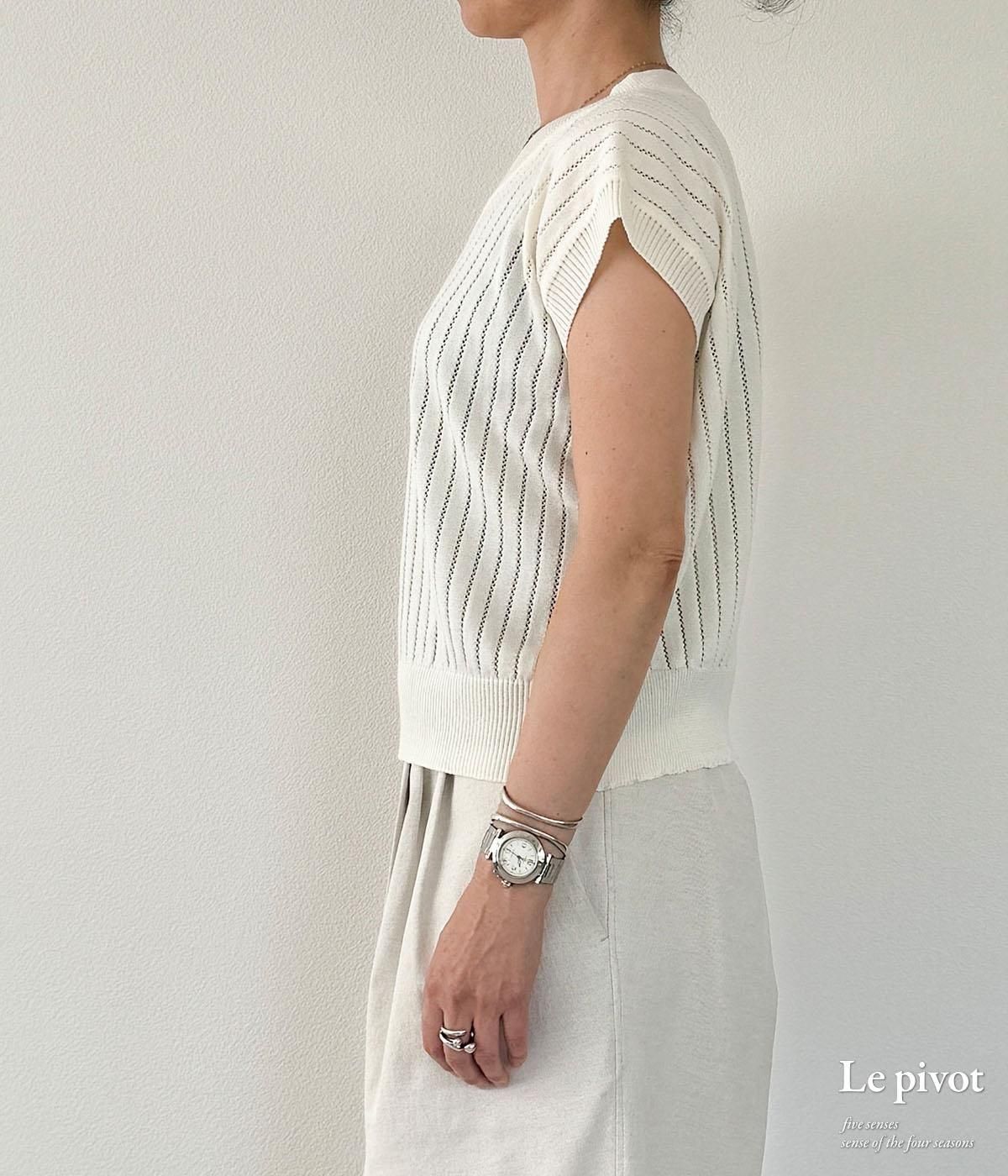 1枚でフレンチスリーブとしても、ベストとして重ね着しても良いサイズ感は、パンツにもスカーフにも合わせやすいバランス。春から夏にかけて活躍しそうな1枚です。