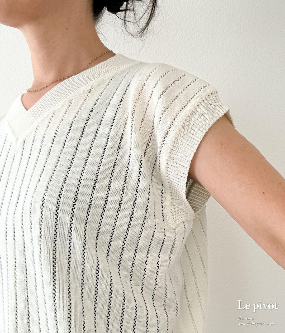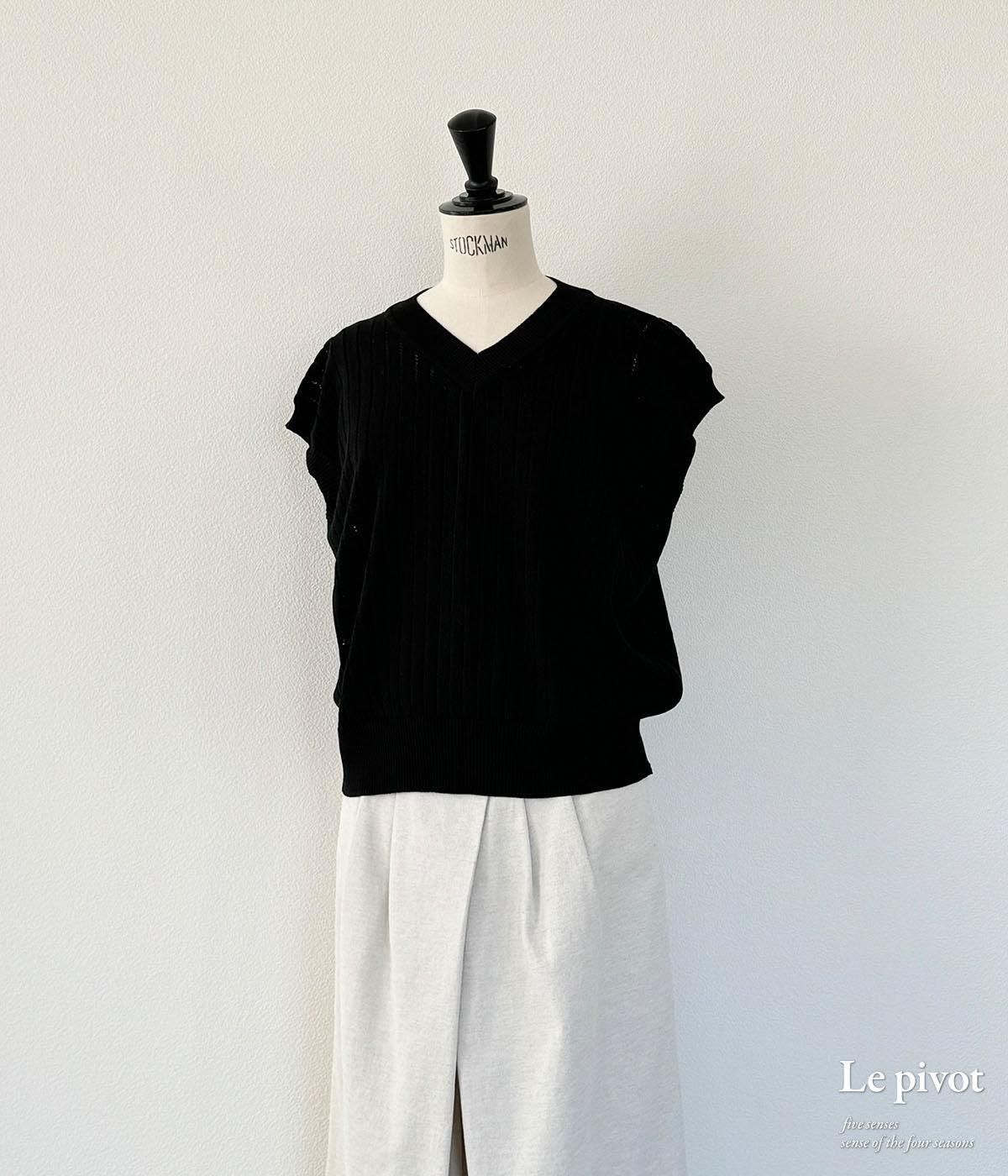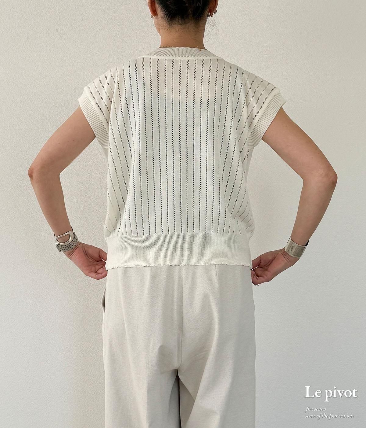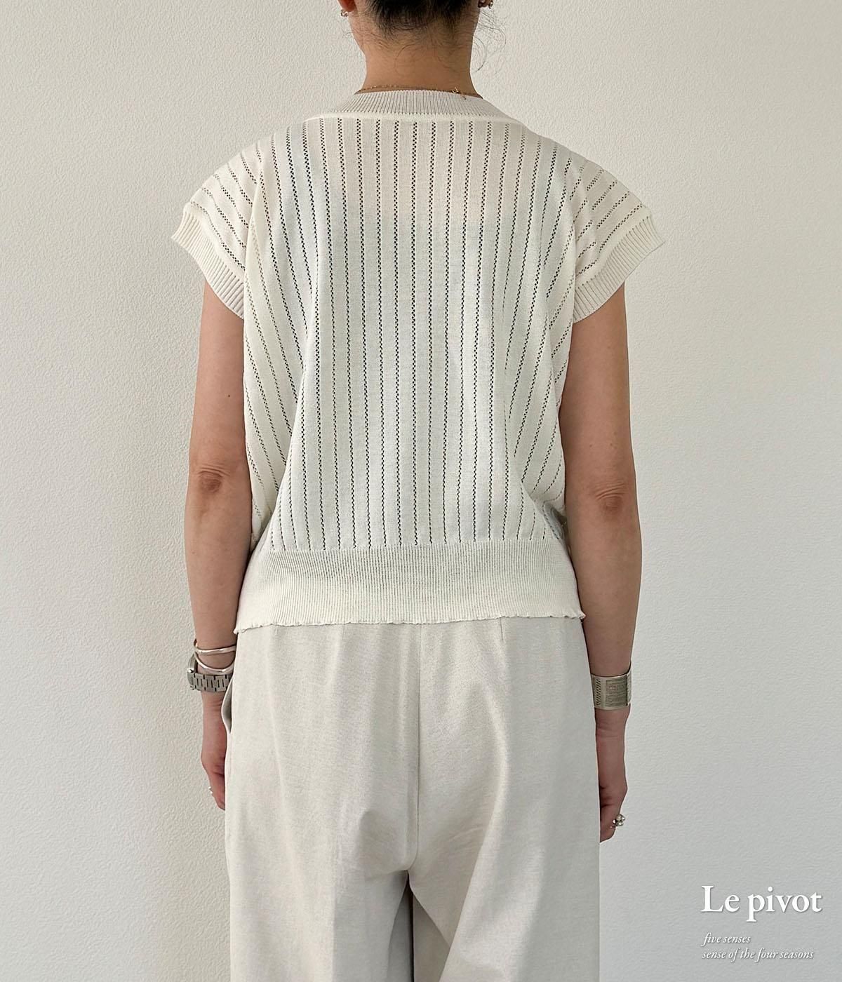 1枚でフレンチスリーブとしても、ベストとして重ね着しても良いサイズ感は、パンツにもスカーフにも合わせやすいバランス。春から夏にかけて活躍しそうな1枚です。