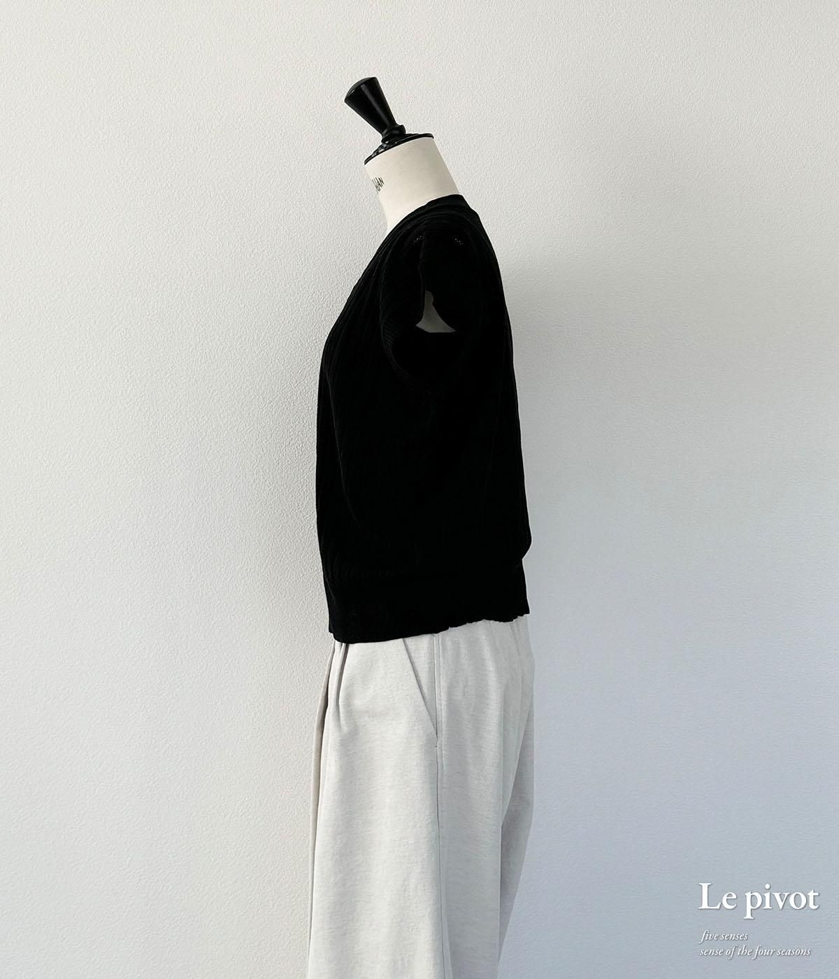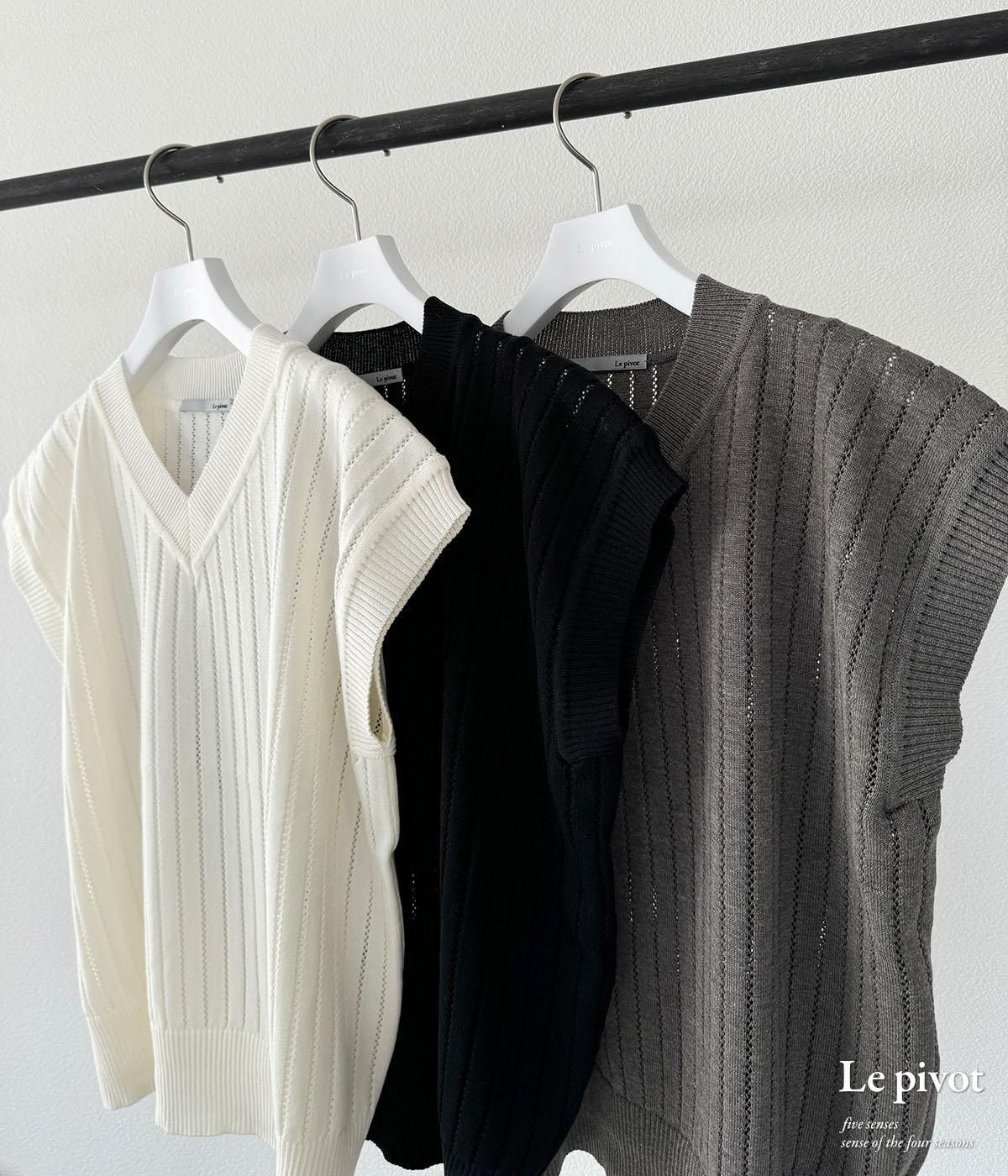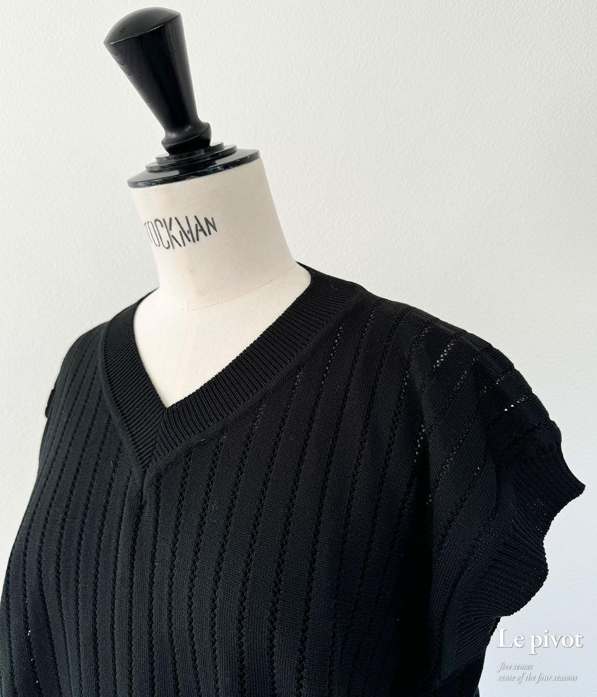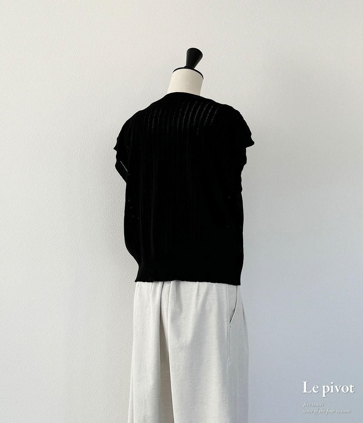 1枚でフレンチスリーブとしても、ベストとして重ね着しても良いサイズ感は、パンツにもスカーフにも合わせやすいバランス。春から夏にかけて活躍しそうな1枚です。