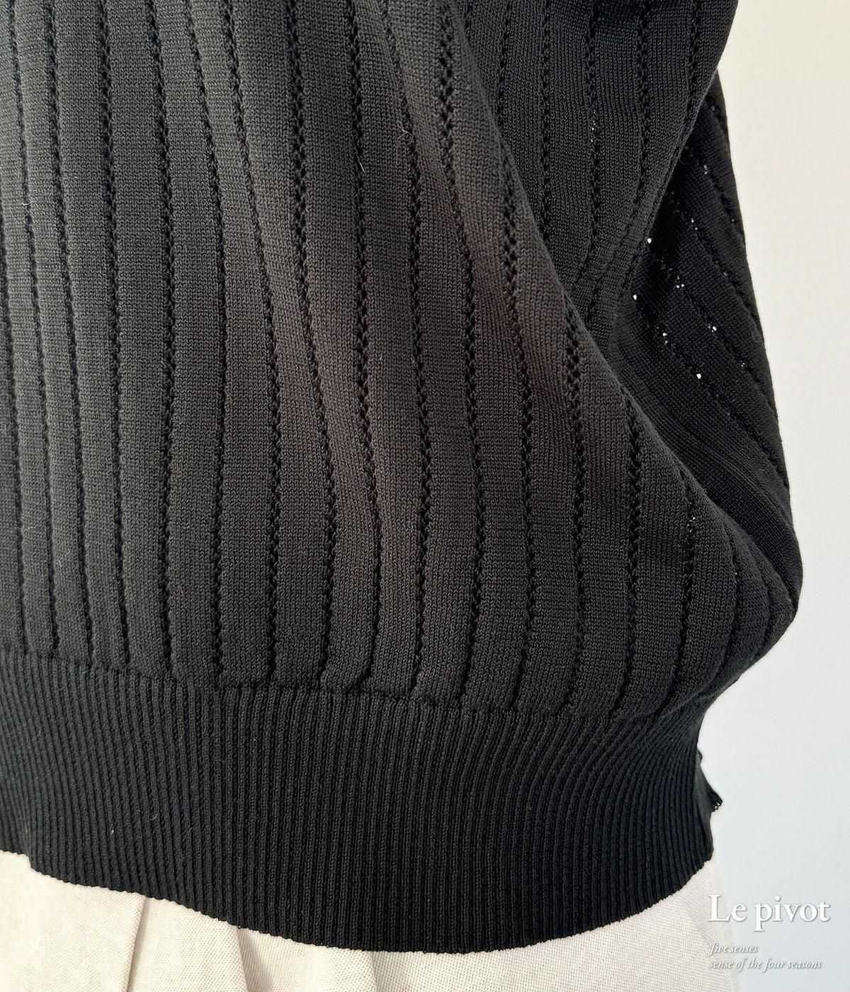 アイレット状に小さな穴が空いたような針抜きの編地は、リブのように伸縮性にも優れていて、コンパクトながら動きやすい着心地。