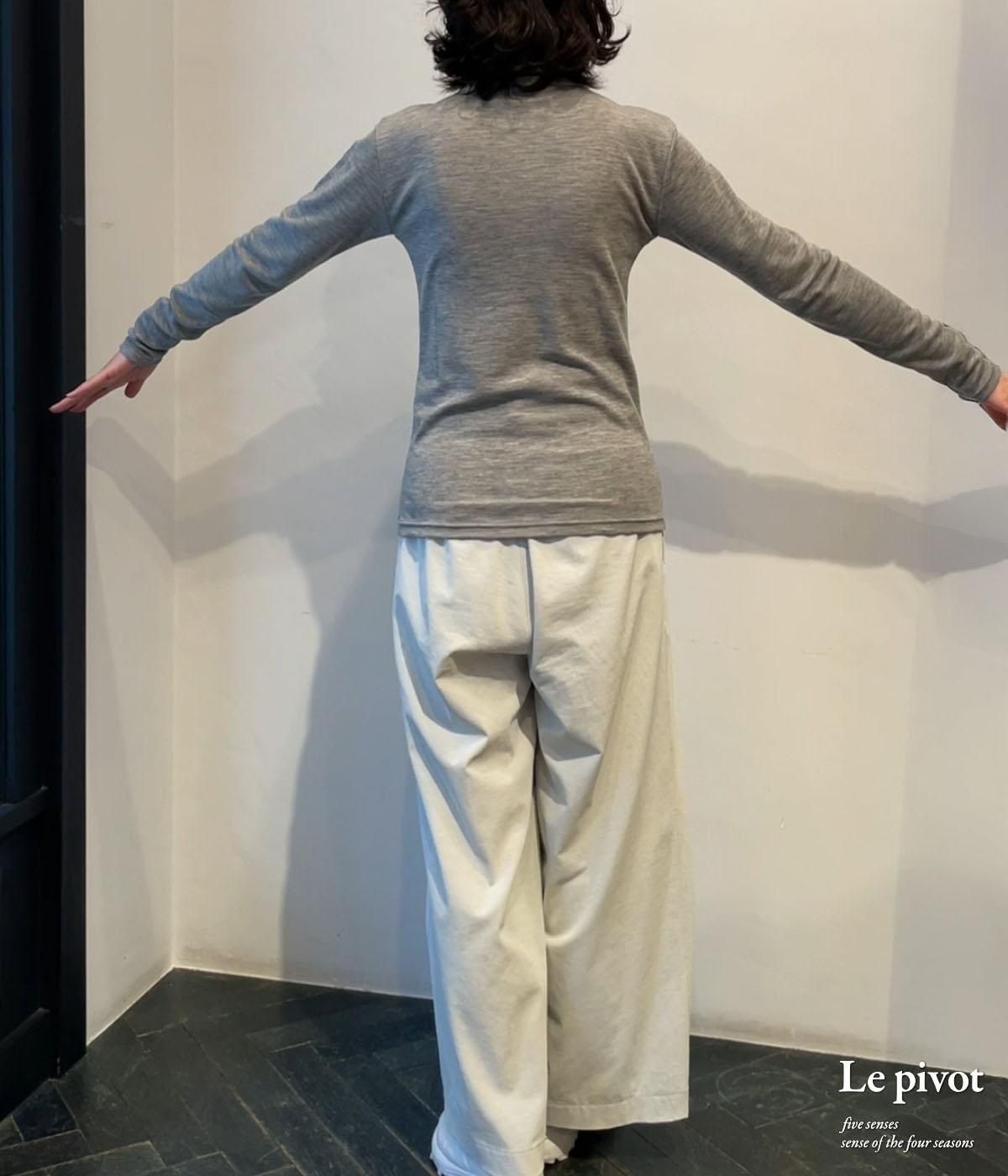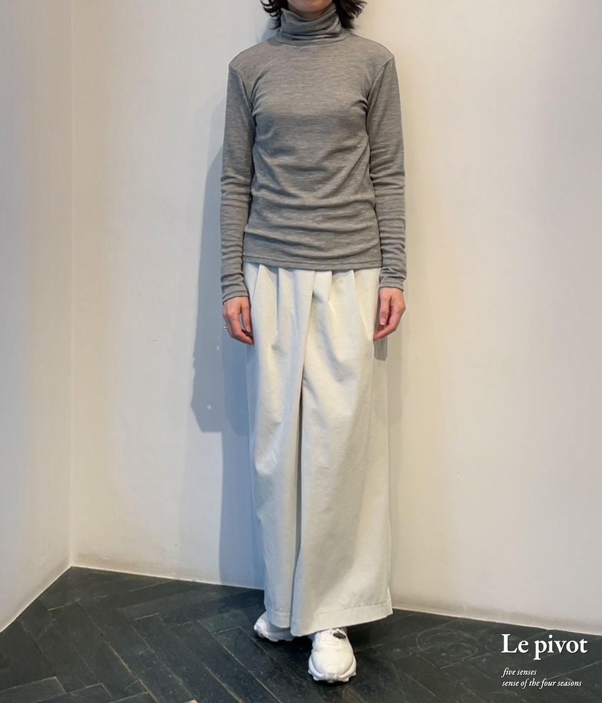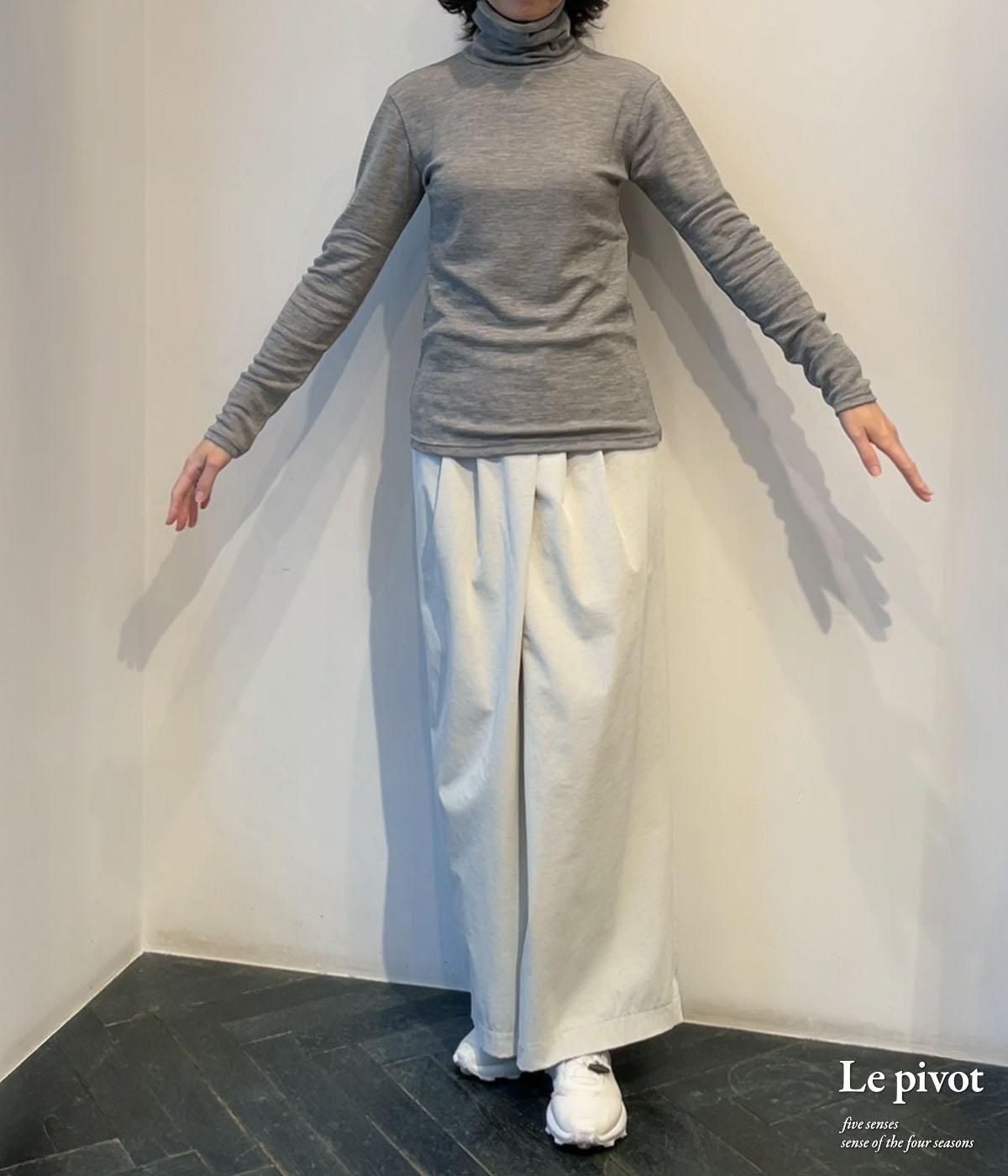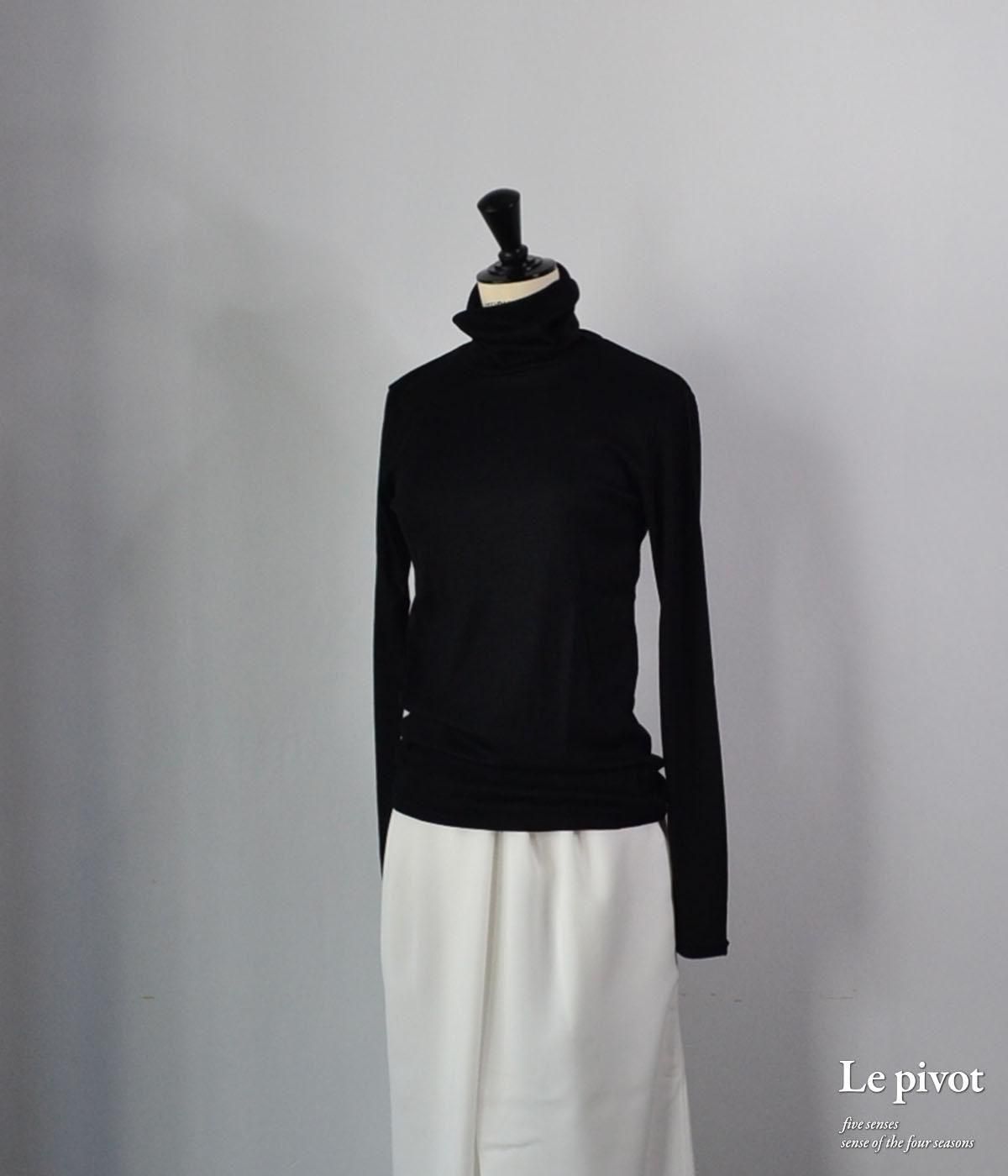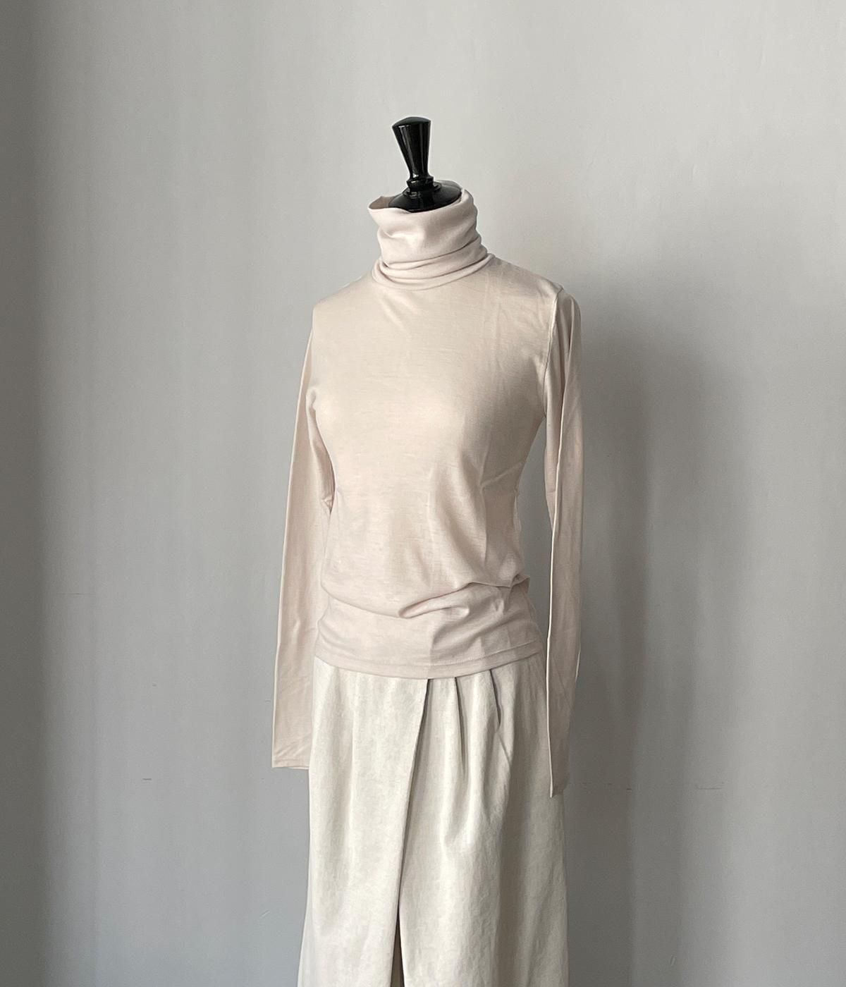 首周りに程よくフィットするテンションなので、タートル好きな方にはおすすめの1枚です。長めの衿はわからないくらいに、少しねじらせて付けています。2つ折りでも少し長め。 クシュクシュしても程よい長さです。 着丈が長いのもポイントです。
