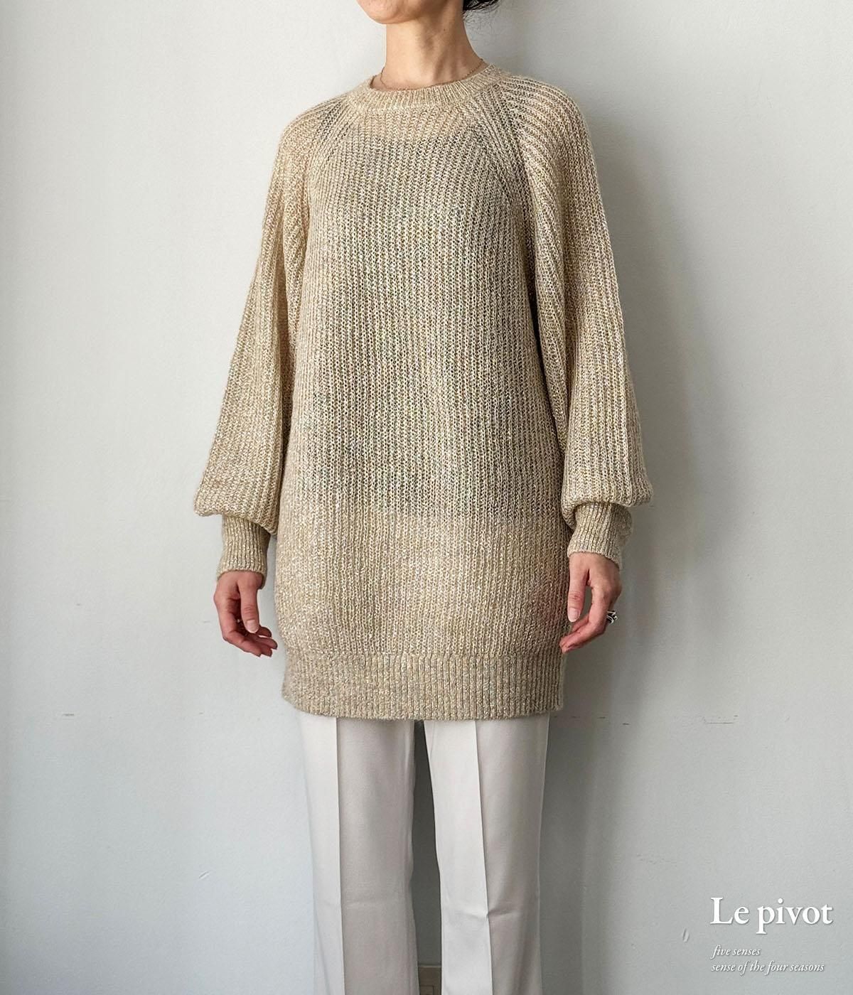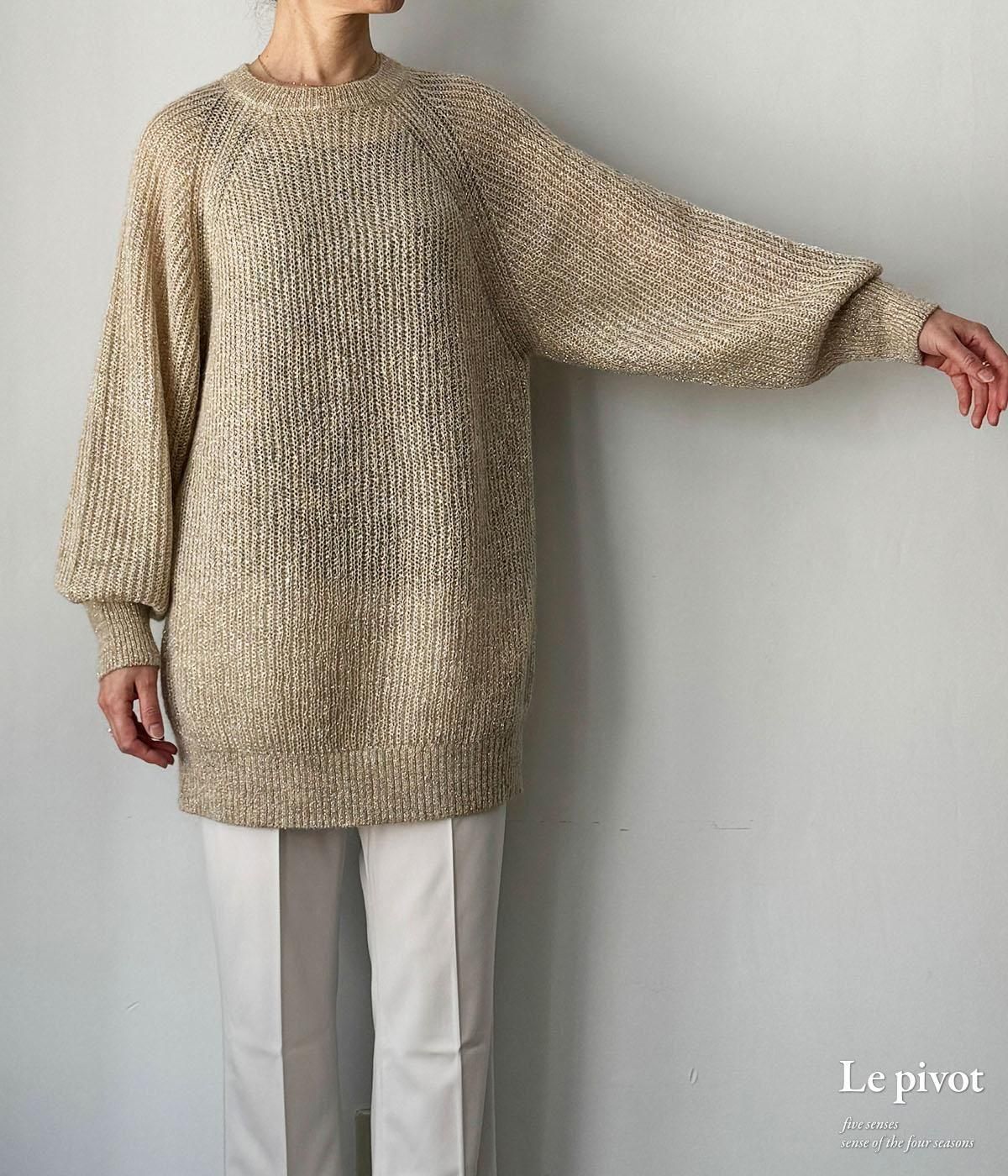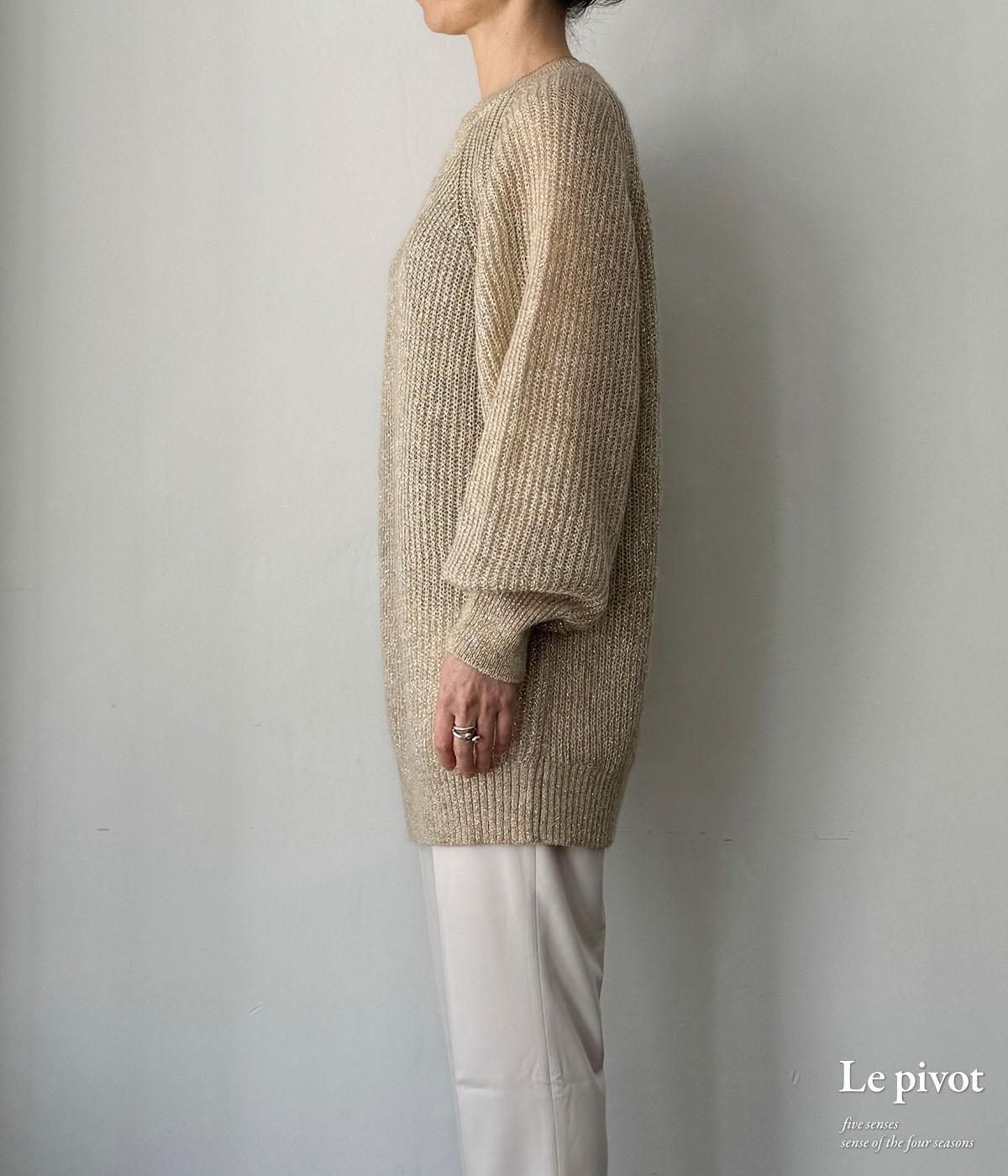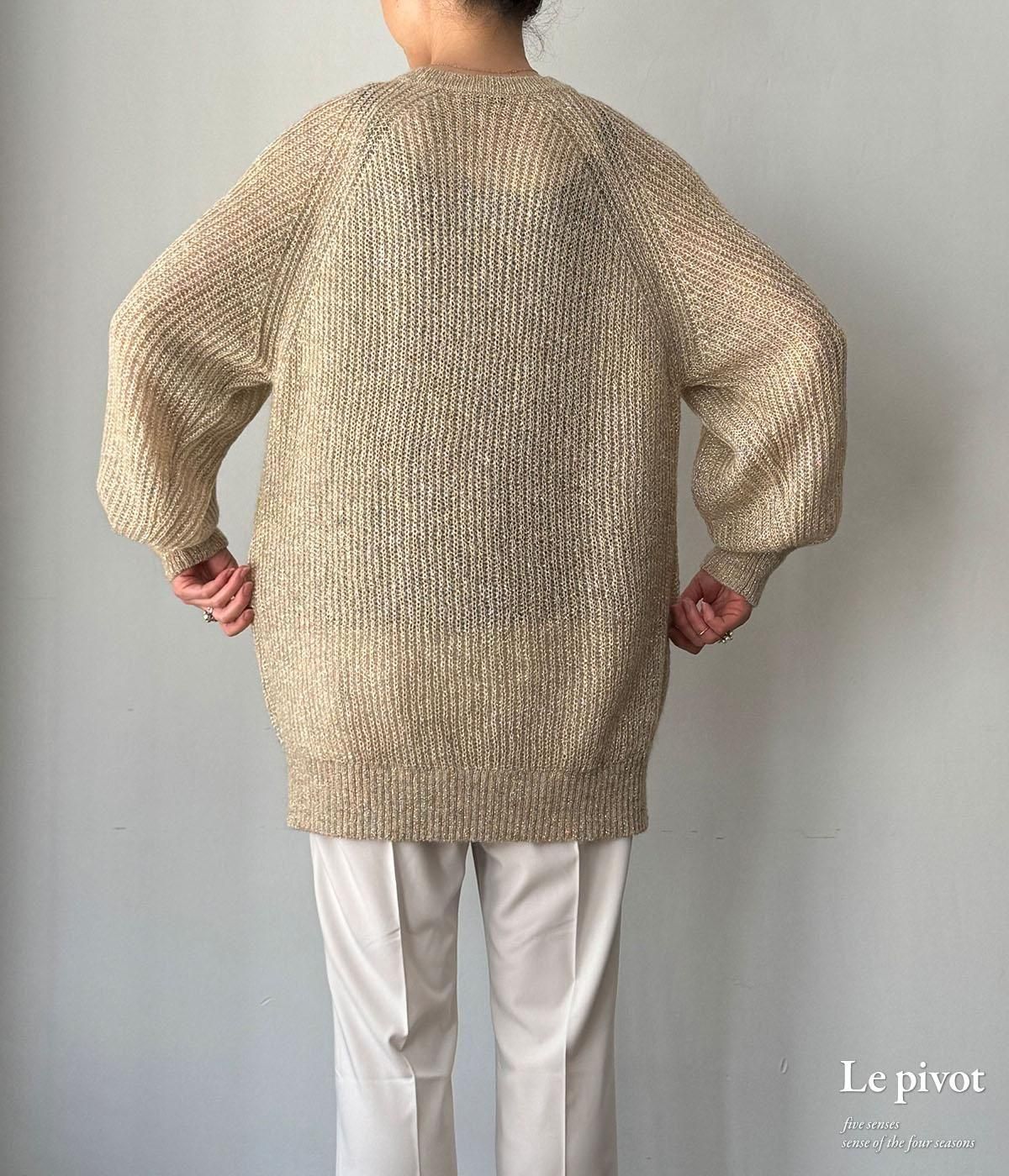 袖と裾口にたるみを持たせていて、広めのラグラン袖にしています。着た時のゆるりとした感じと袖のボリューム感が、キラキラと重なって気分が上がります。透け感があるので、インナーとのバリエーションも楽しめます。
