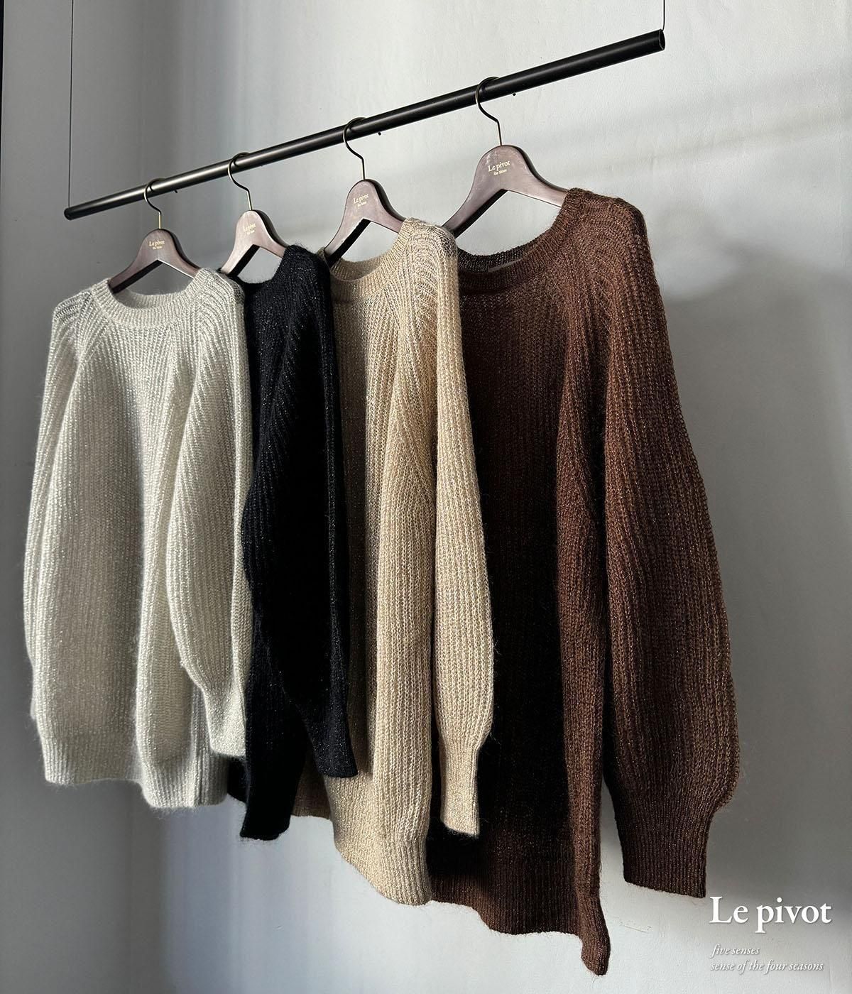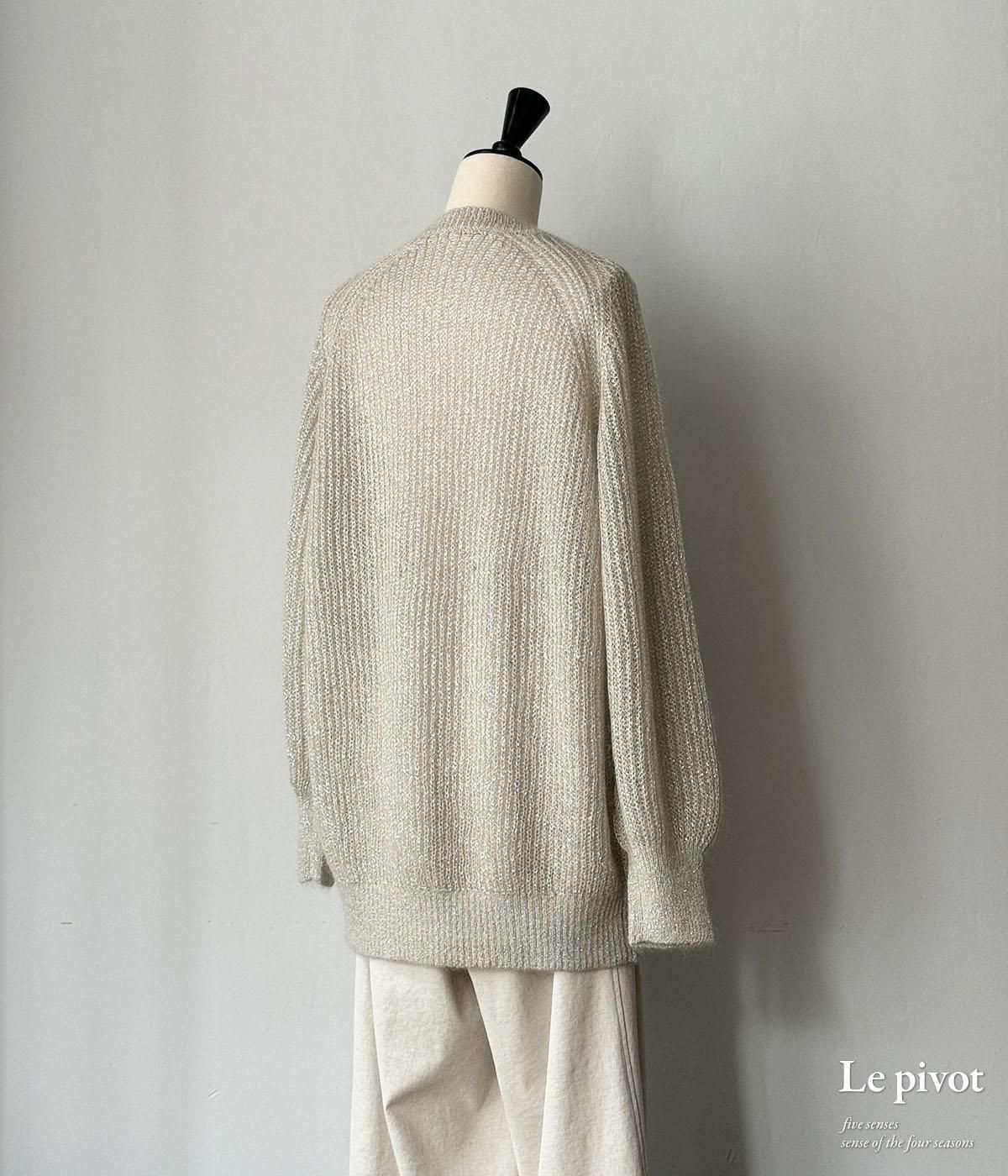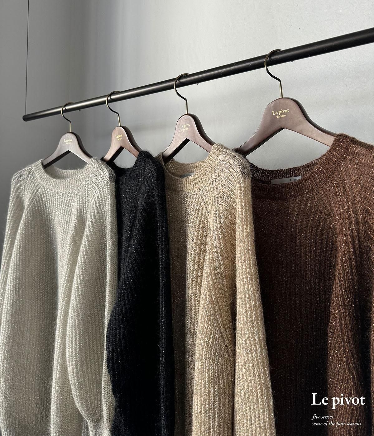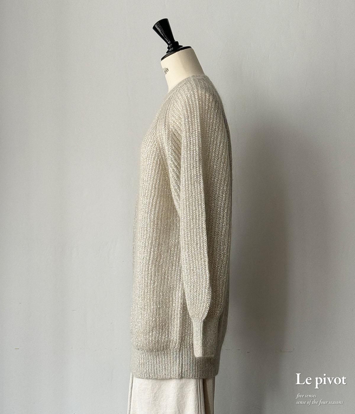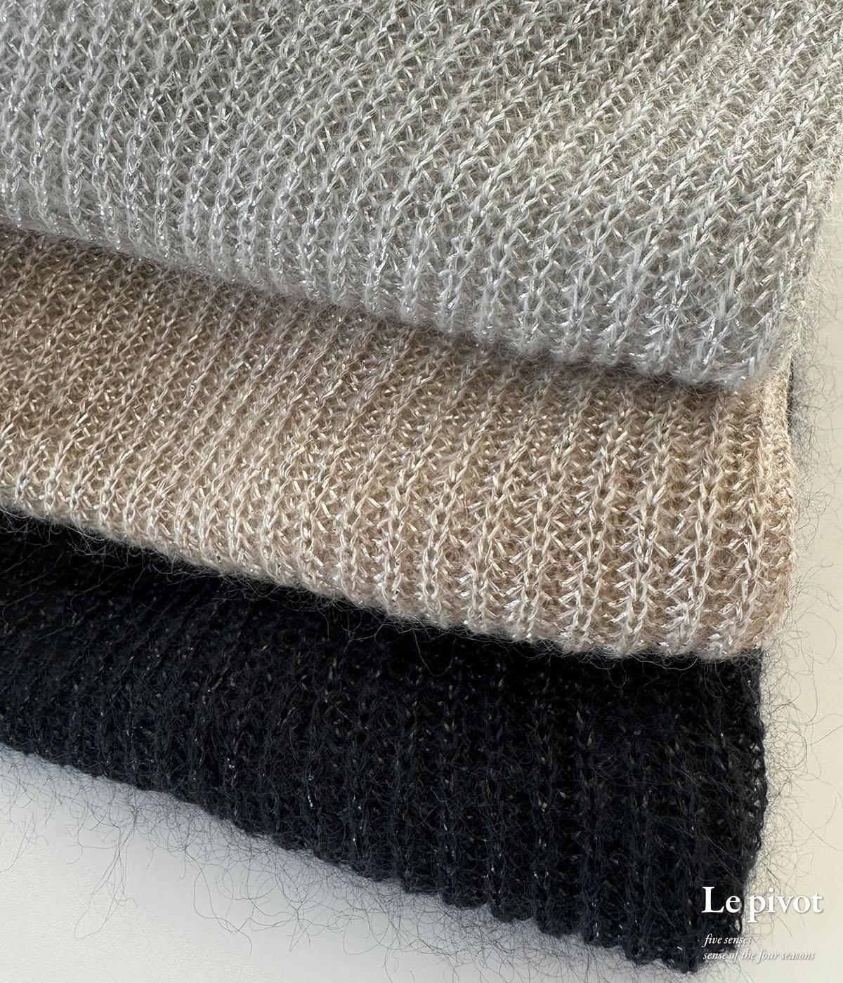 高品質のキッドモヘアにラメ糸をプラスして、ベーシックな形を新しくしています。編地の中に、同色系のラメ系を入れているのですが、色によって、表出しにしたり裏出しにして、あまり光らないように輝きを少し押さえています。