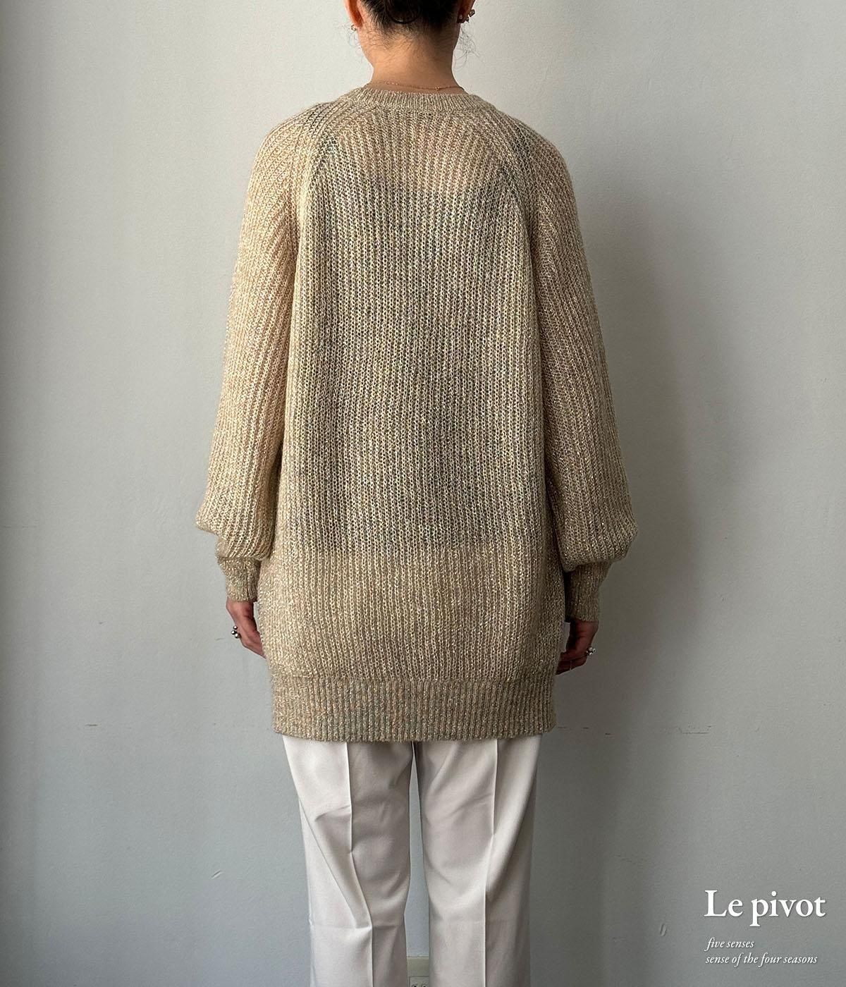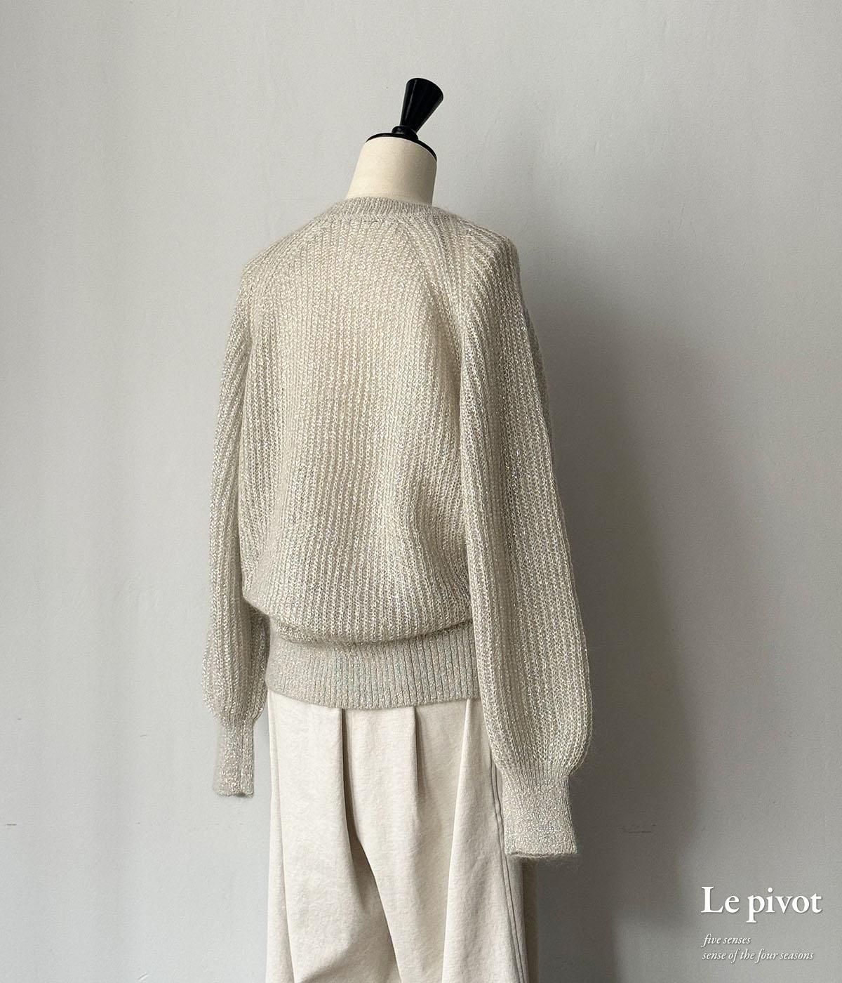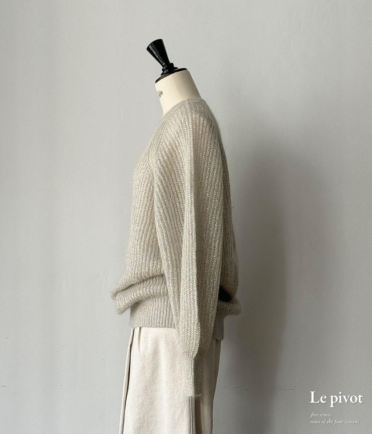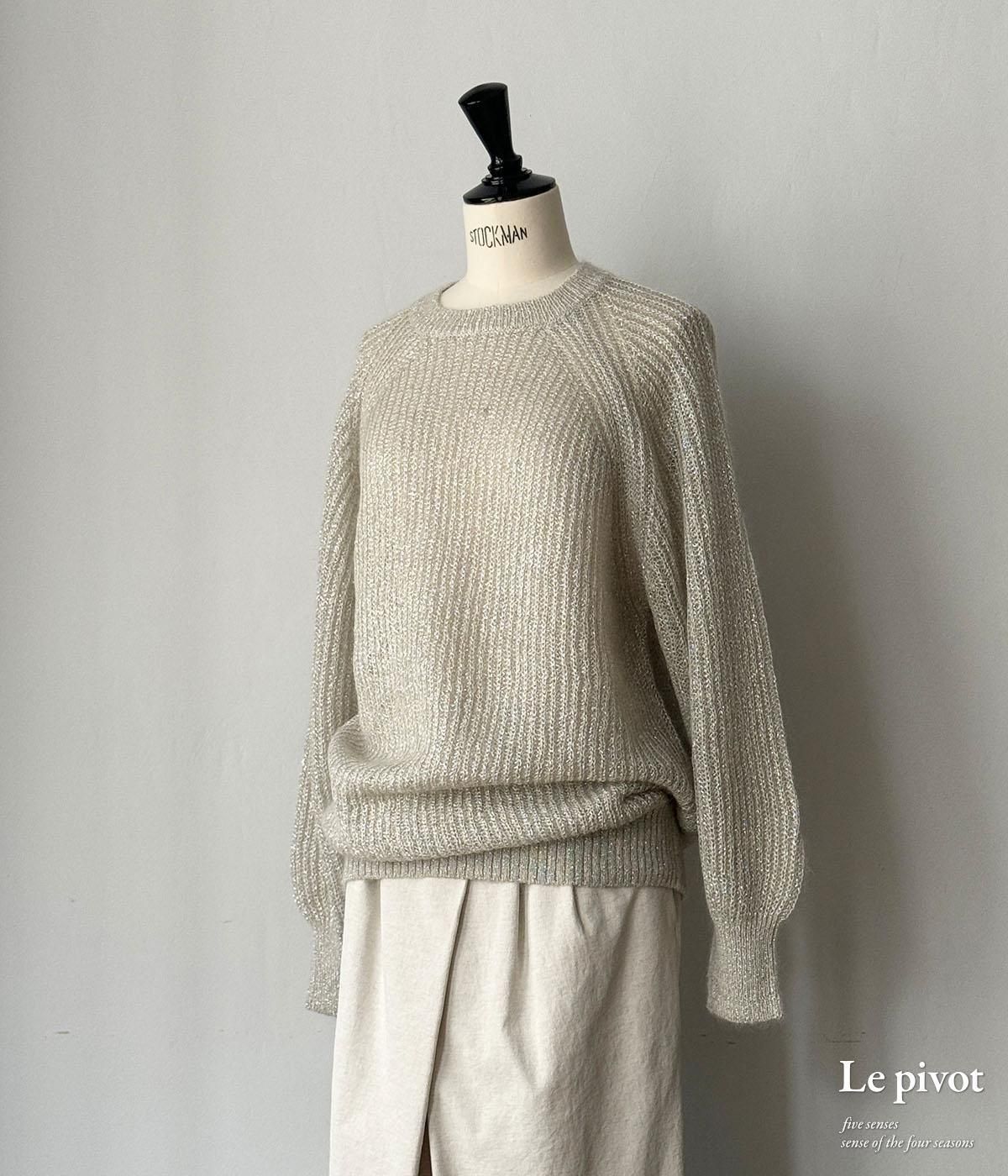 高品質のキッドモヘアにラメ糸をプラスして、ベーシックな形を新しくしています。編地の中に、同色系のラメ系を入れているのですが、色によって、表出しにしたり裏出しにして、あまり光らないように輝きを少し押さえています。
