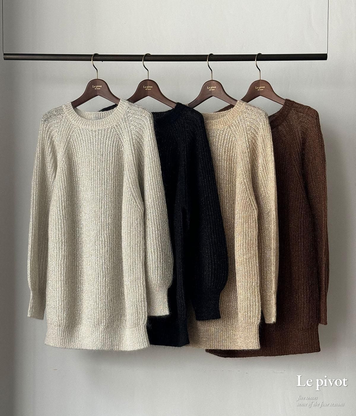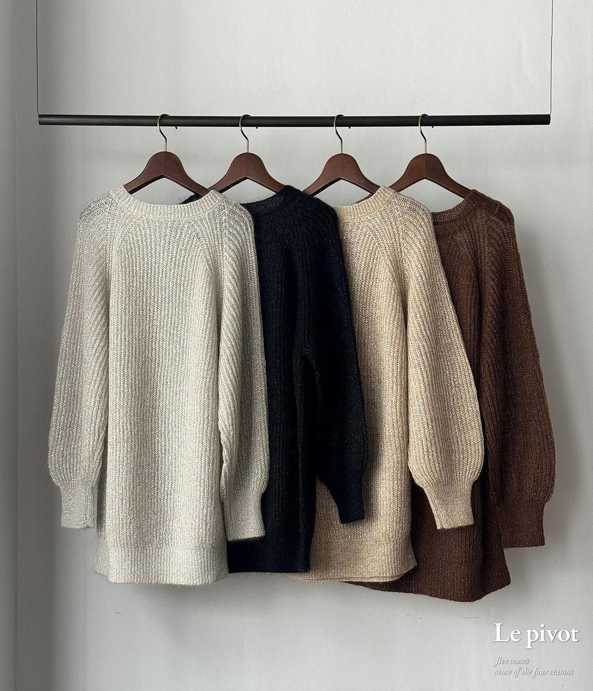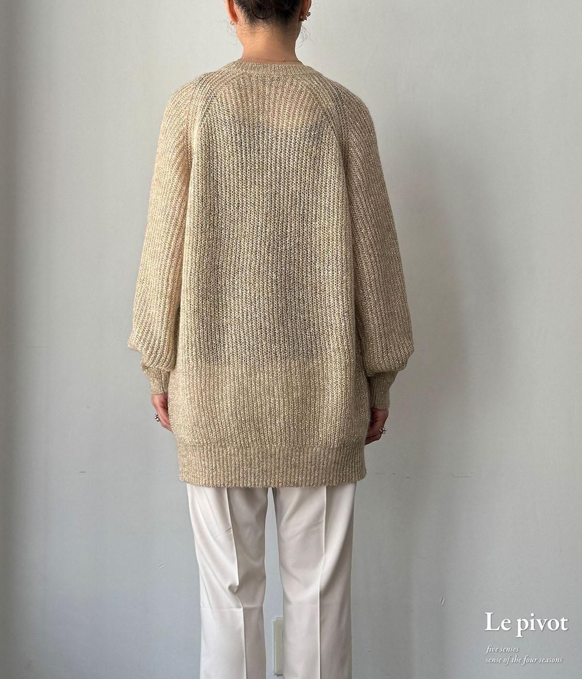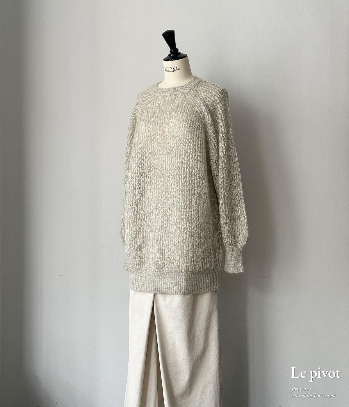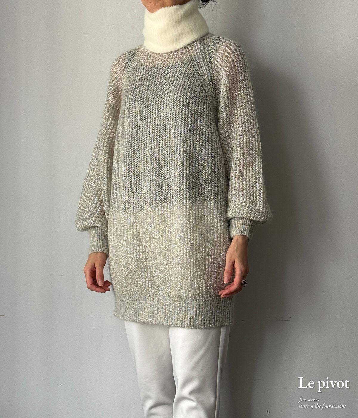 高品質のキッドモヘアにラメ糸をプラスして、ベーシックな形を新しくしています。編地の中に、同色系のラメ系を入れているのですが、色によって、表出しにしたり裏出しにして、あまり光らないように輝きを少し押さえています。