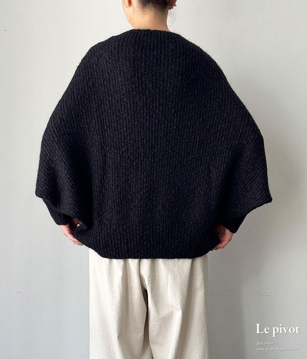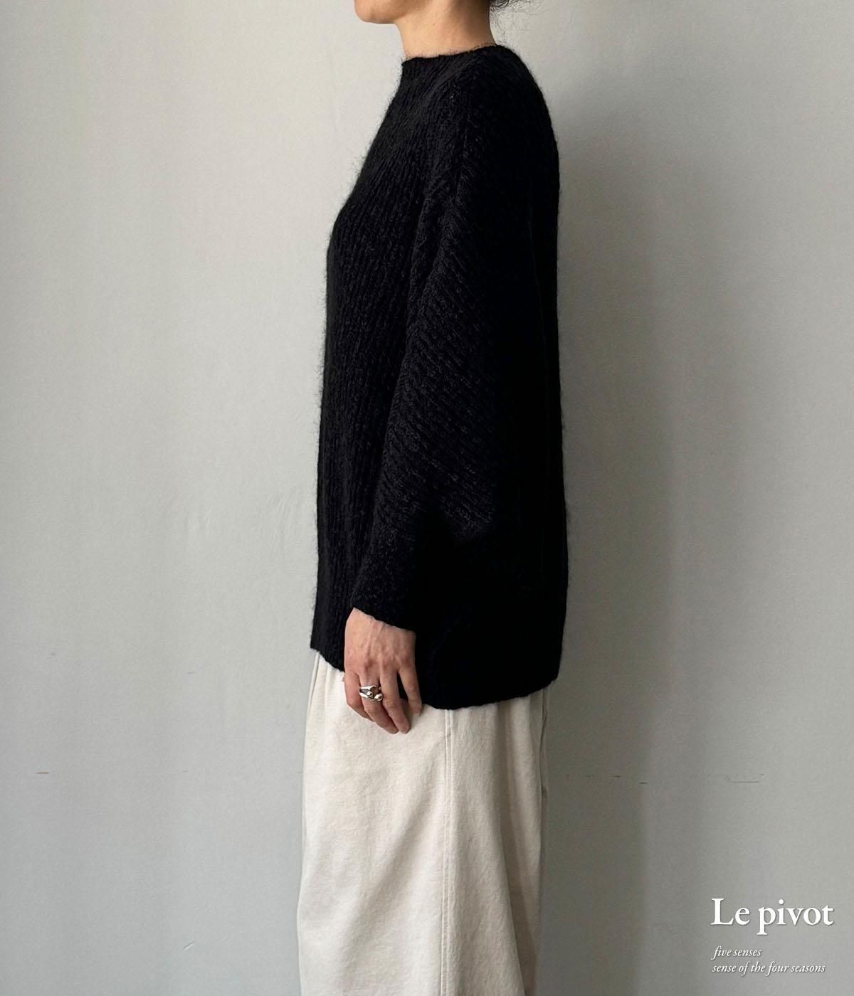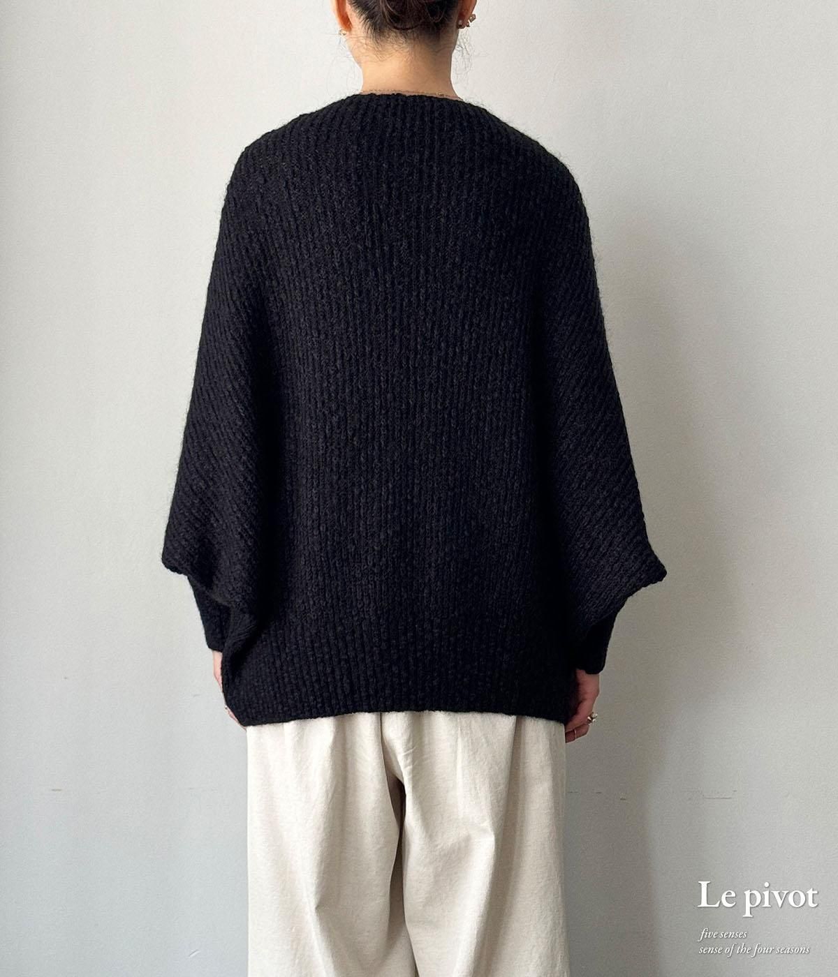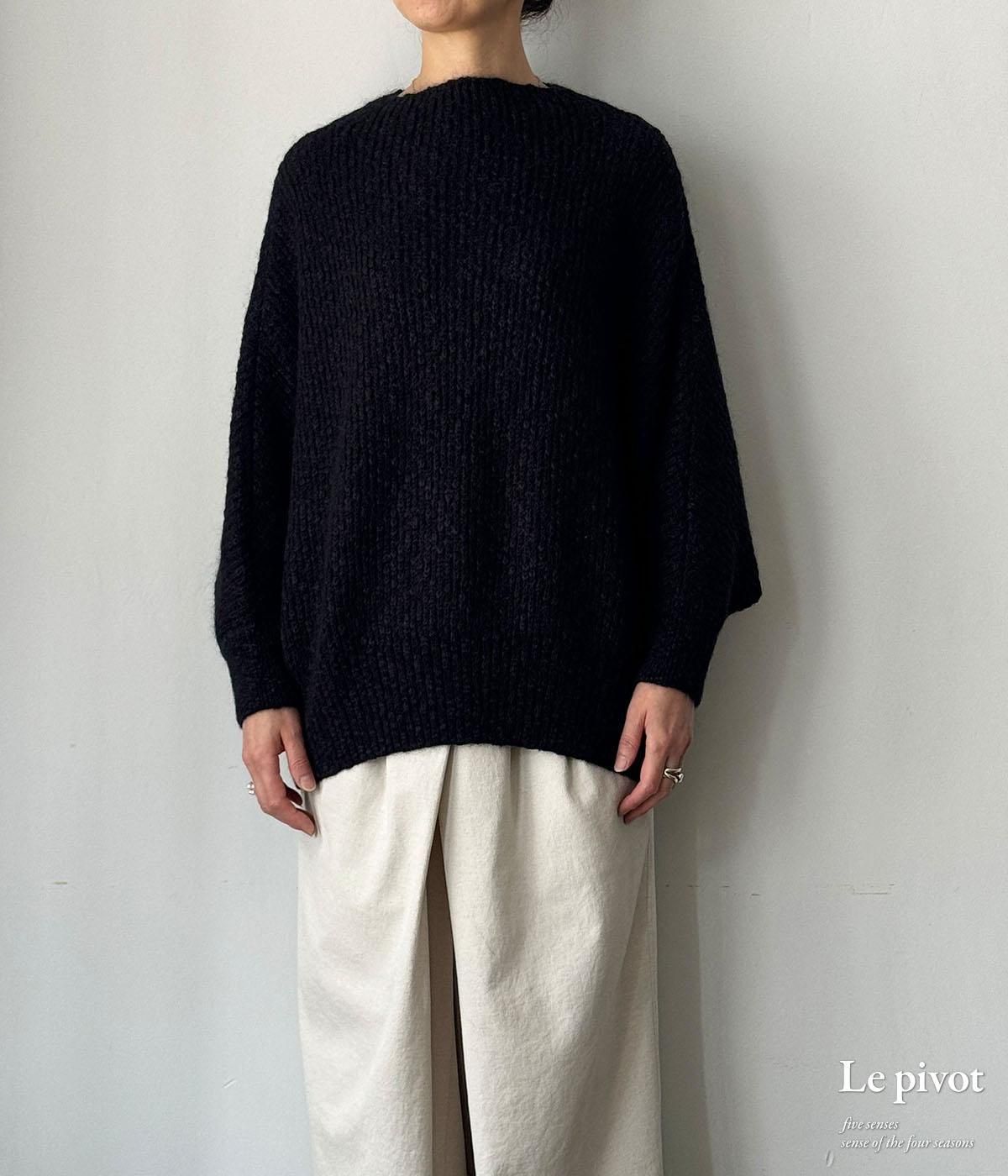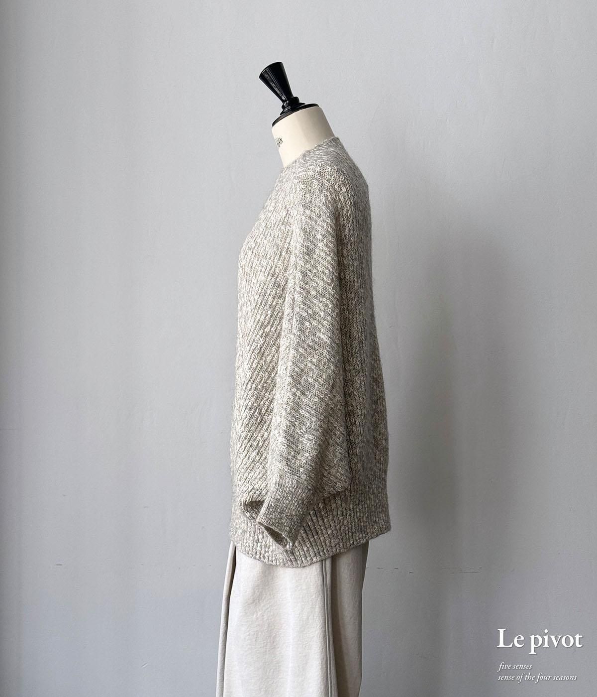 太いロービングの糸にキッドモヘアを入れています。ルーズなサイズ感で、ソフトな糸とのバランスが良く、袖のたるみなども着ると可愛いです。