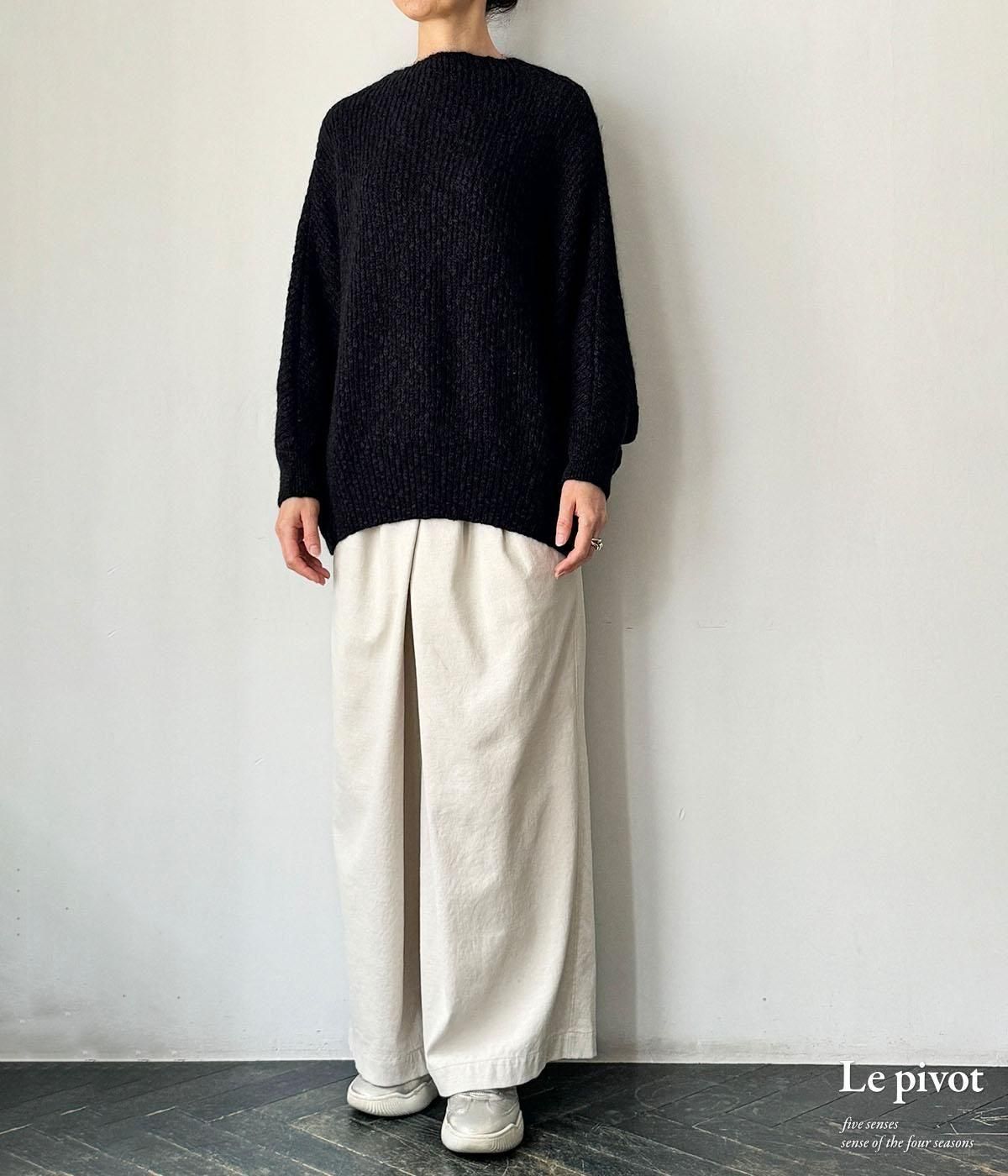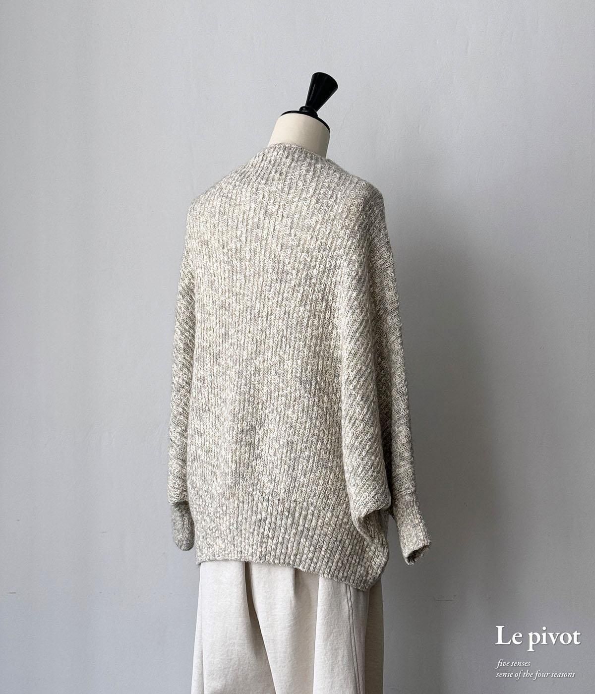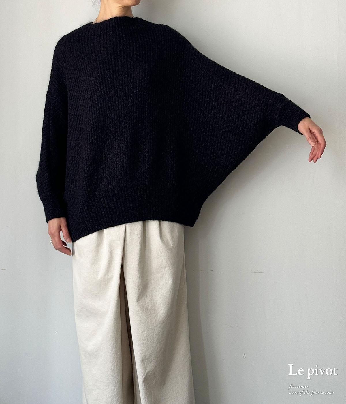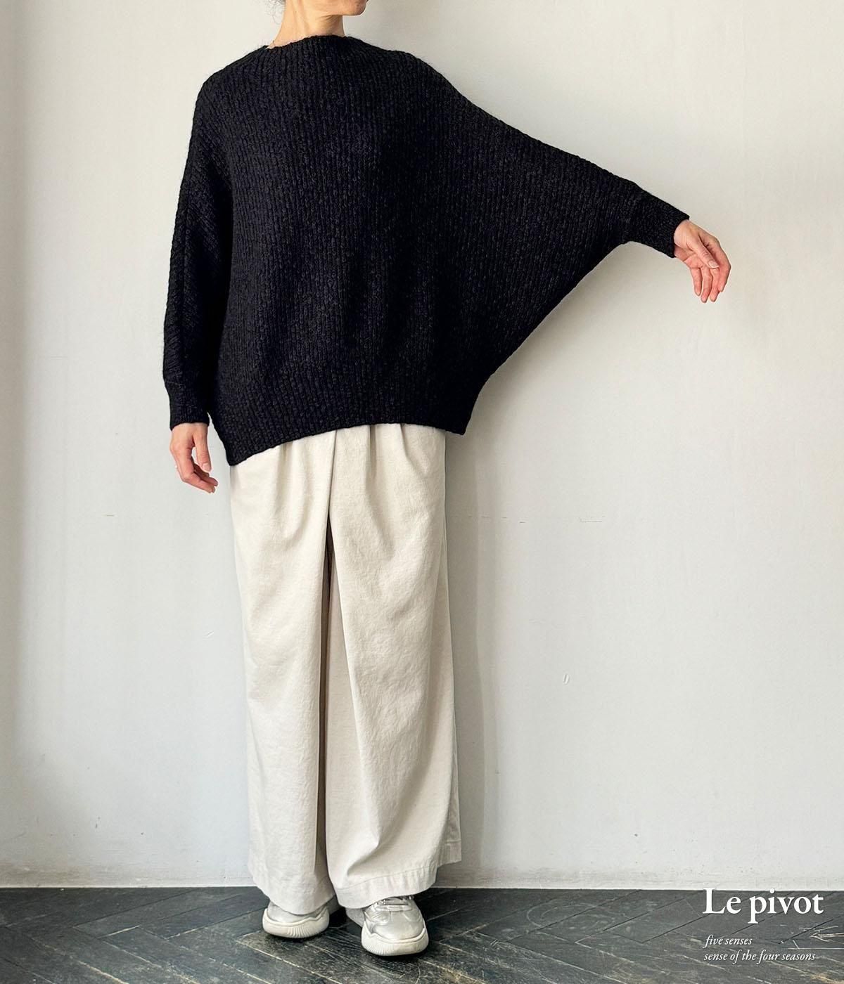 太いロービングの糸にキッドモヘアを入れています。ルーズなサイズ感で、ソフトな糸とのバランスが良く、袖のたるみなども着ると可愛いです。