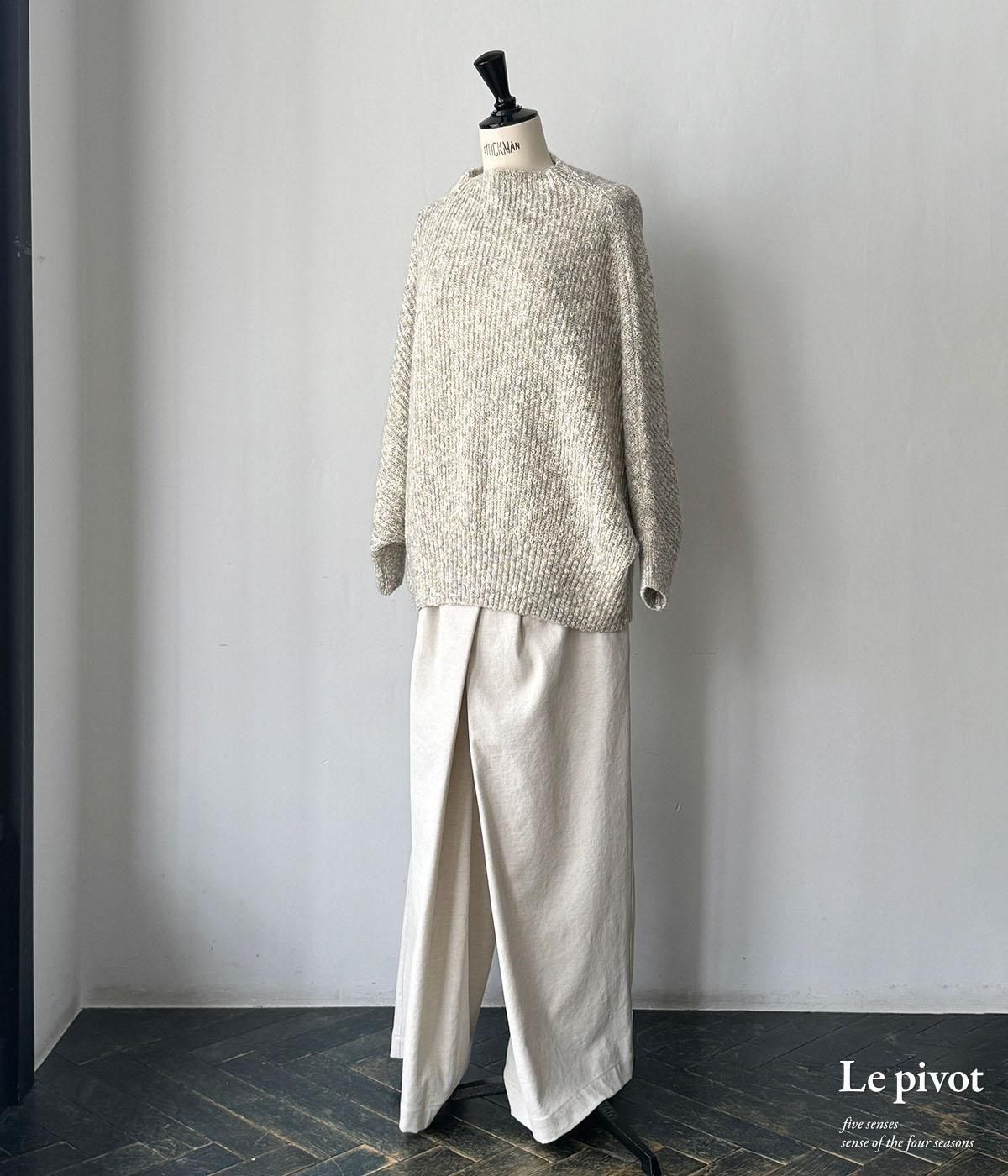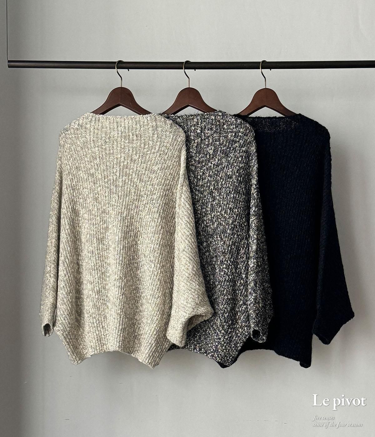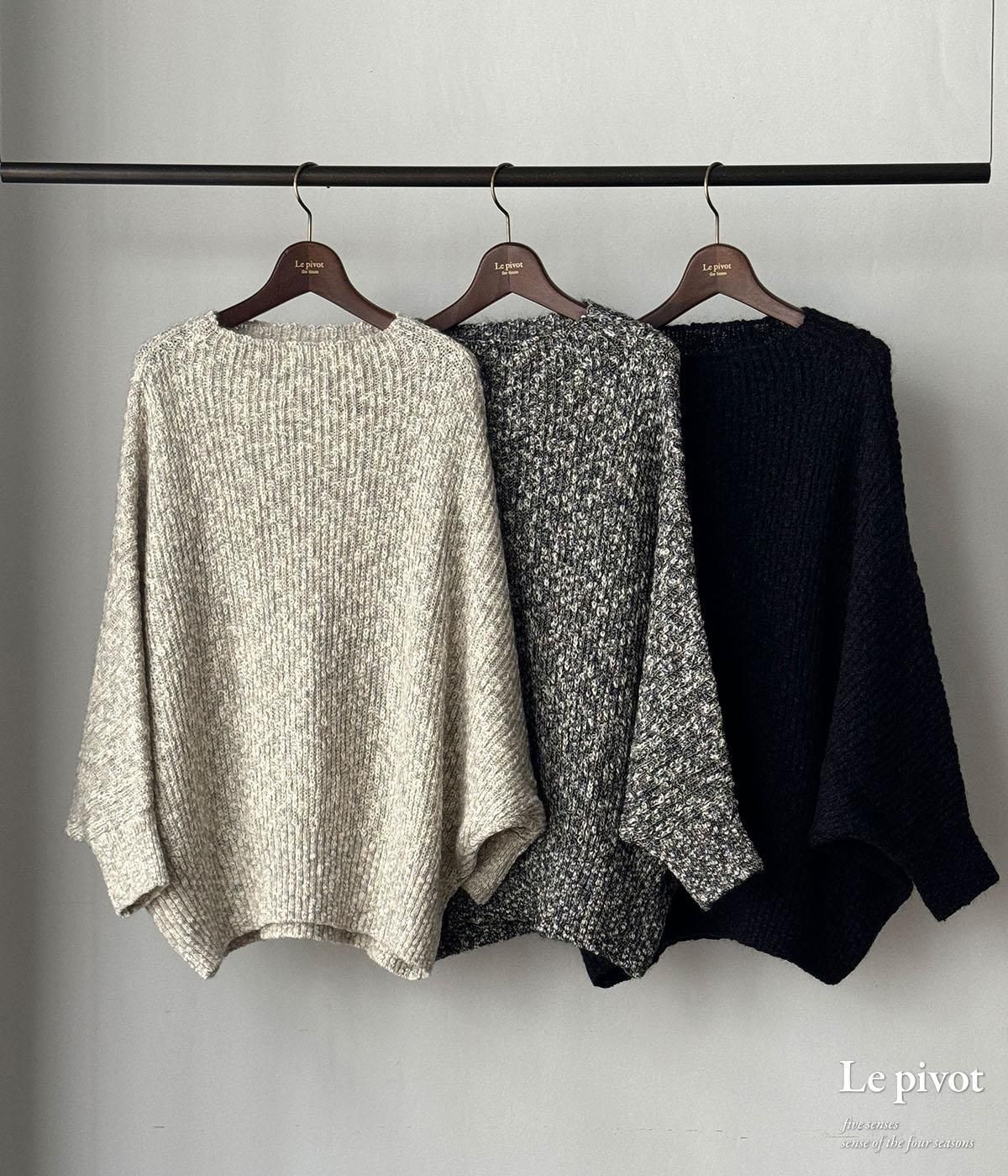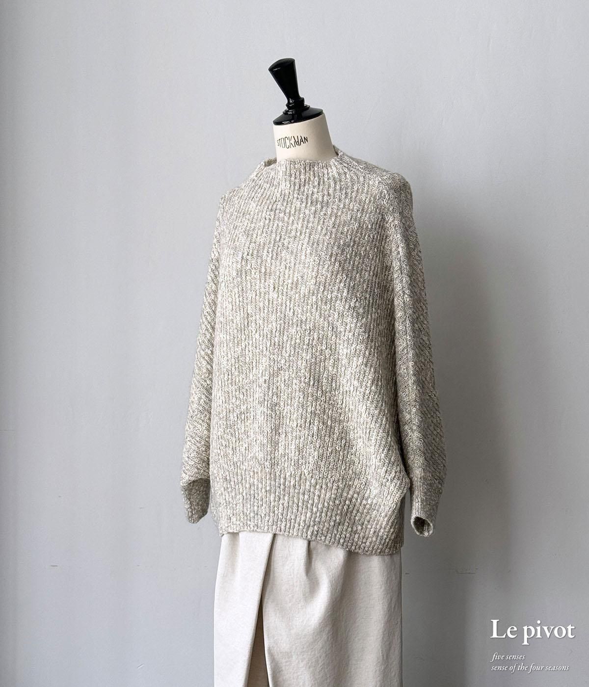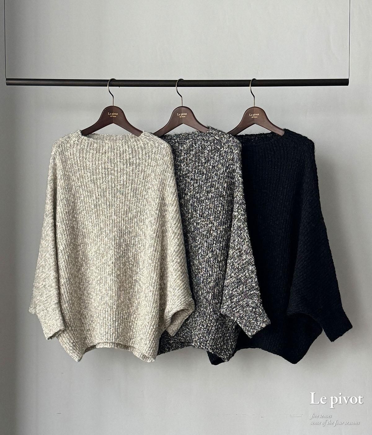 太いロービングの糸にキッドモヘアを入れています。ルーズなサイズ感で、ソフトな糸とのバランスが良く、袖のたるみなども着ると可愛いです。