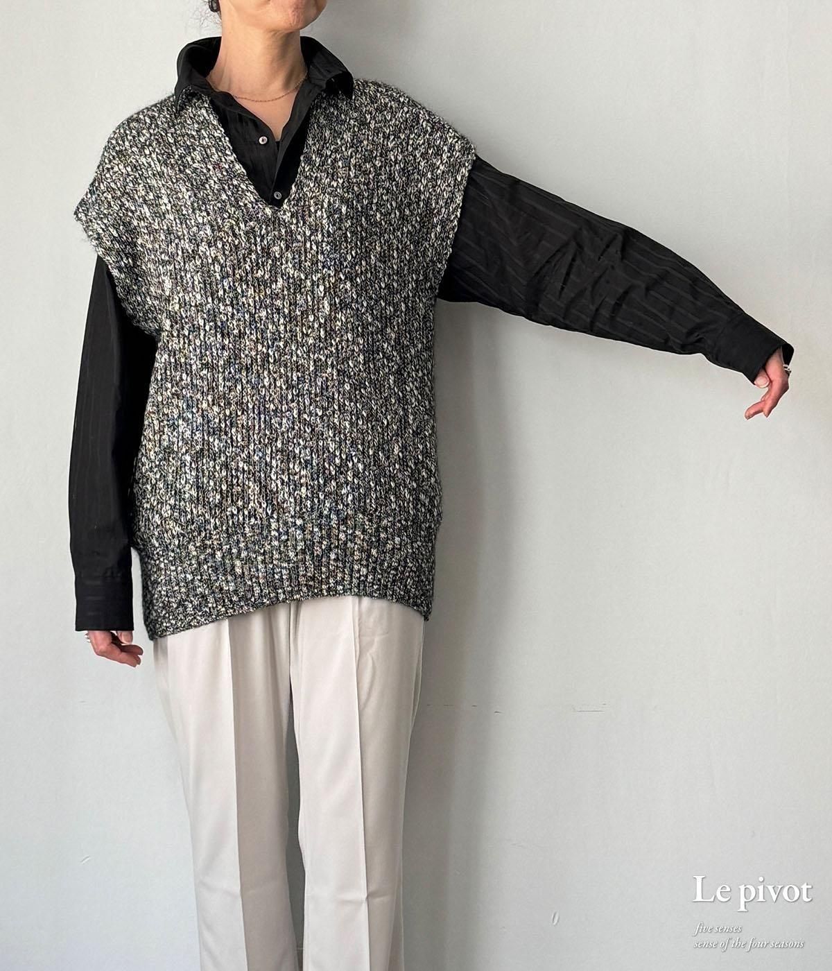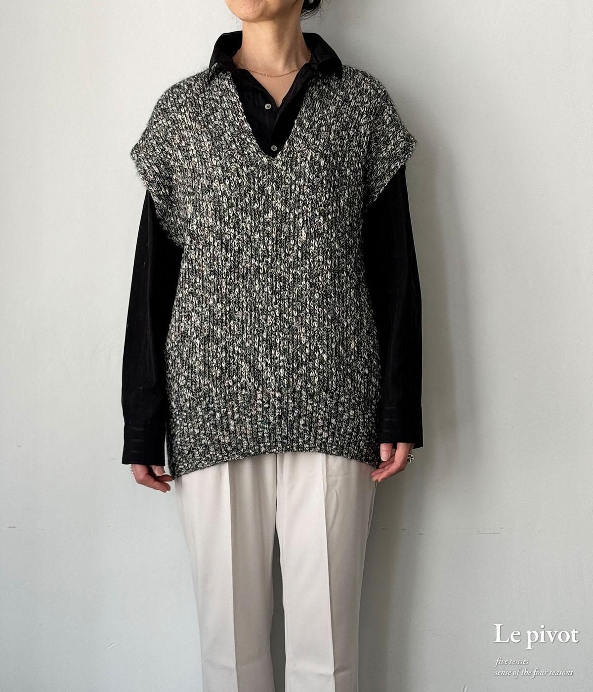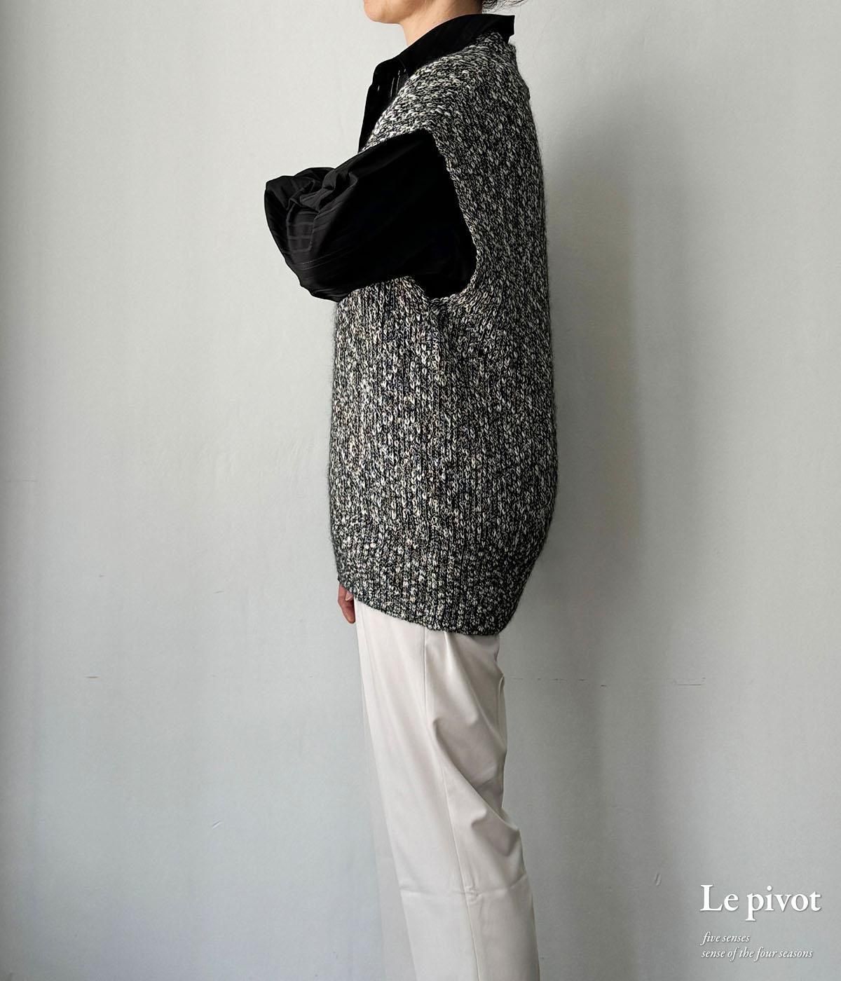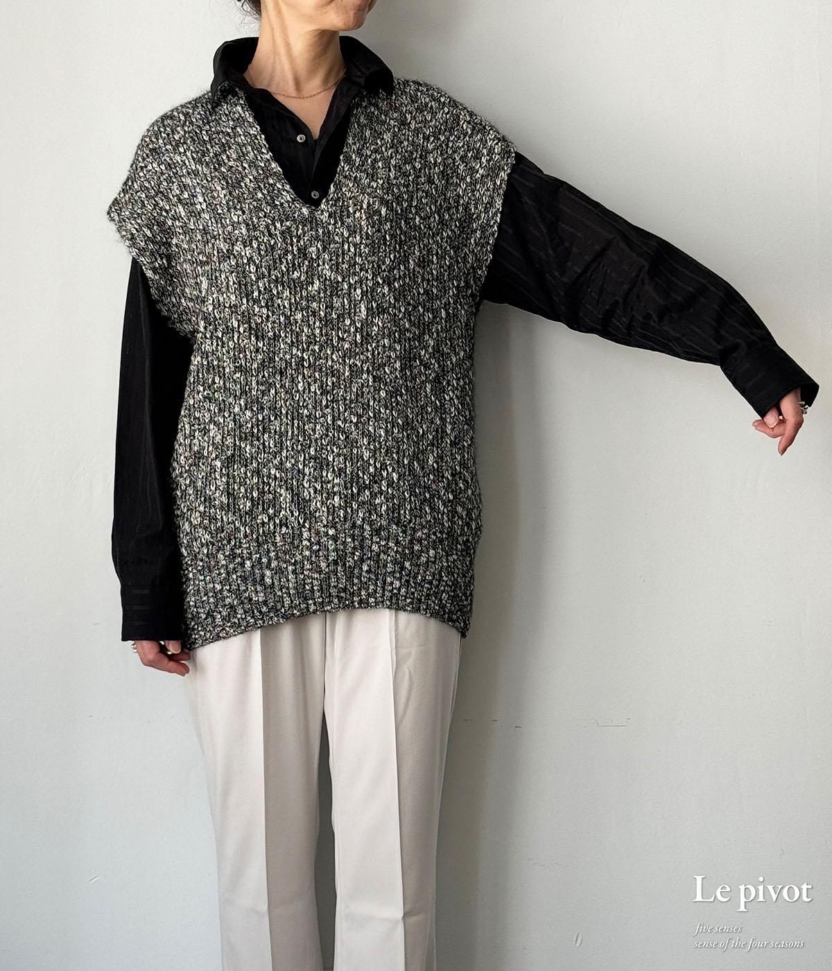 こちらは後ろ衿を高めにしたVネックベストです。 糸自体に表情があるので、合わせやすいようにシンプルな形のベストにしました。