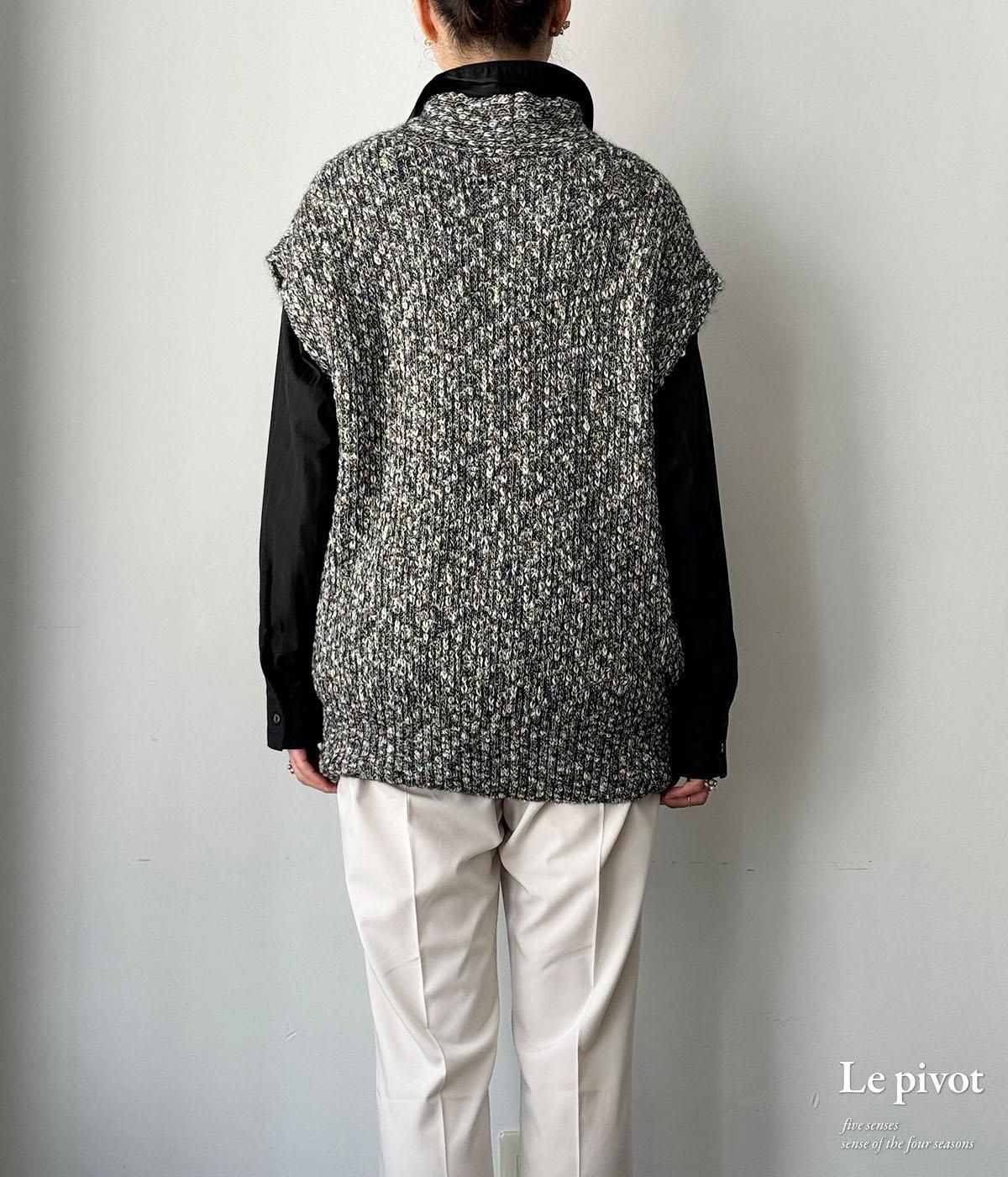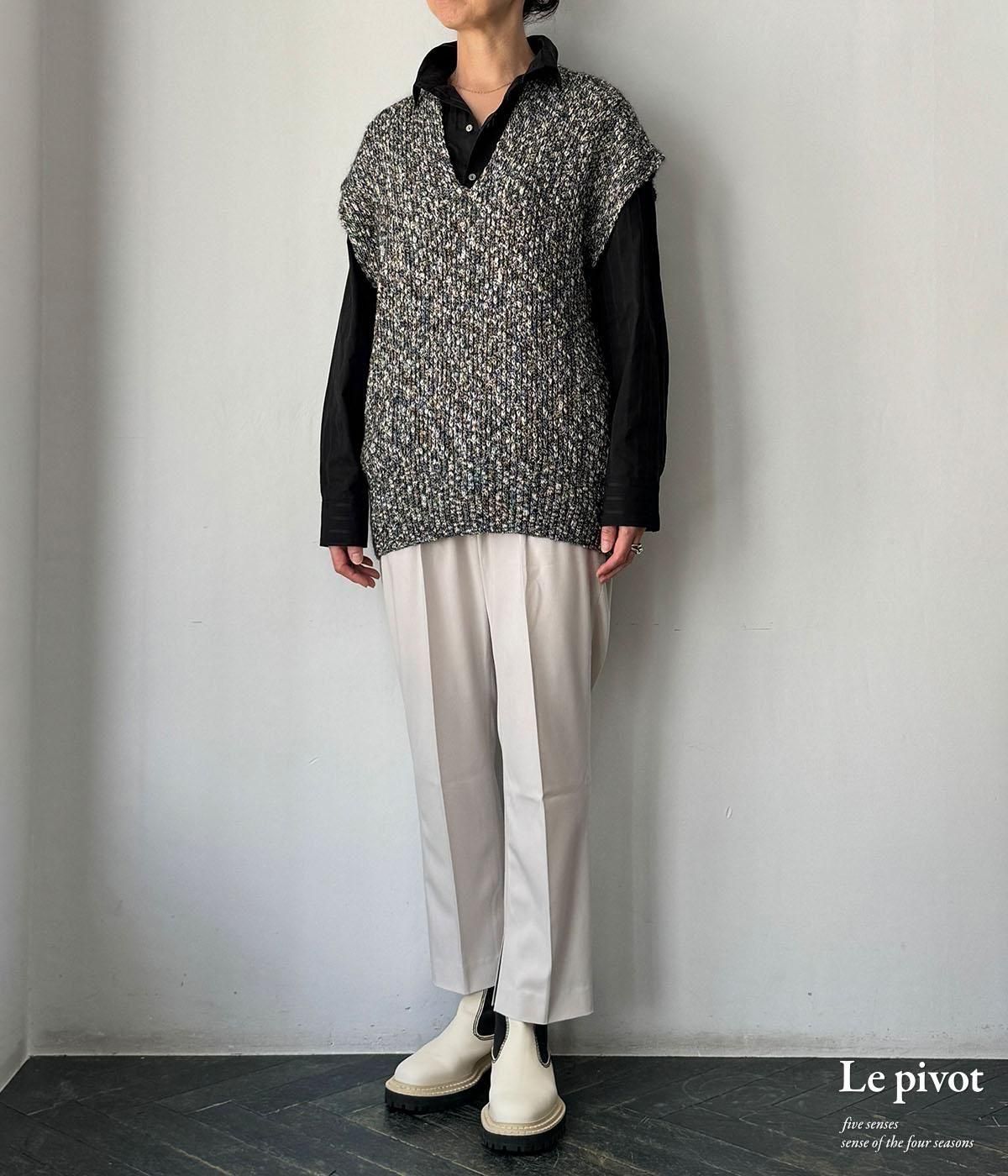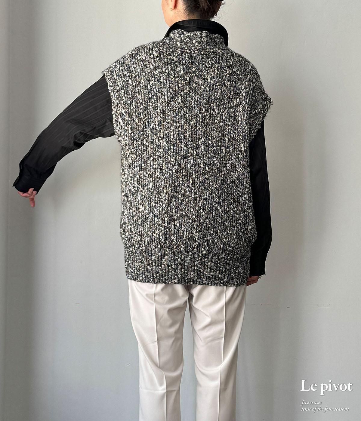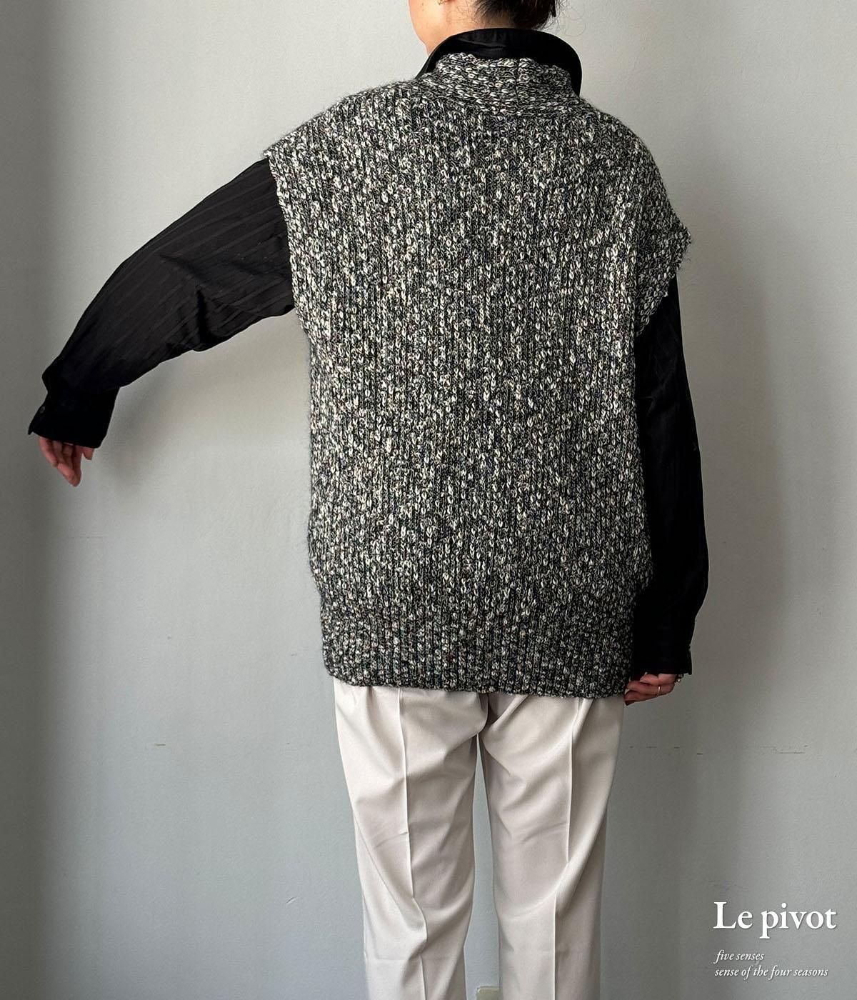 こちらは後ろ衿を高めにしたVネックベストです。 糸自体に表情があるので、合わせやすいようにシンプルな形のベストにしました。