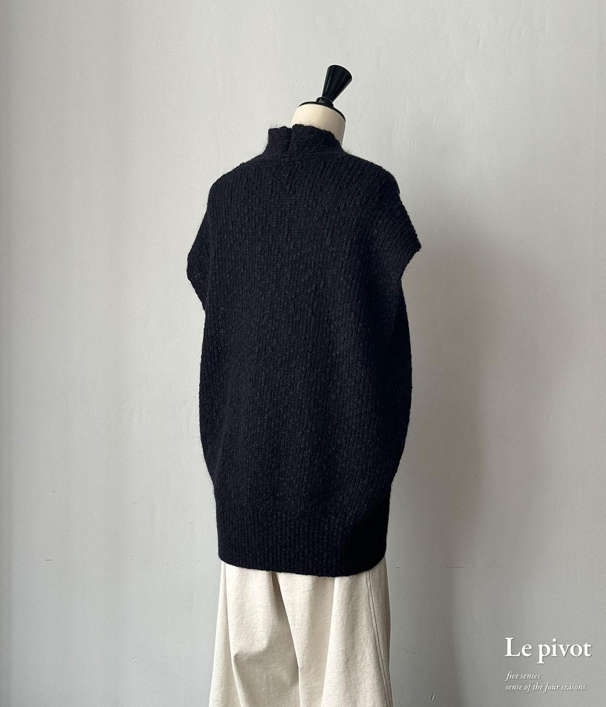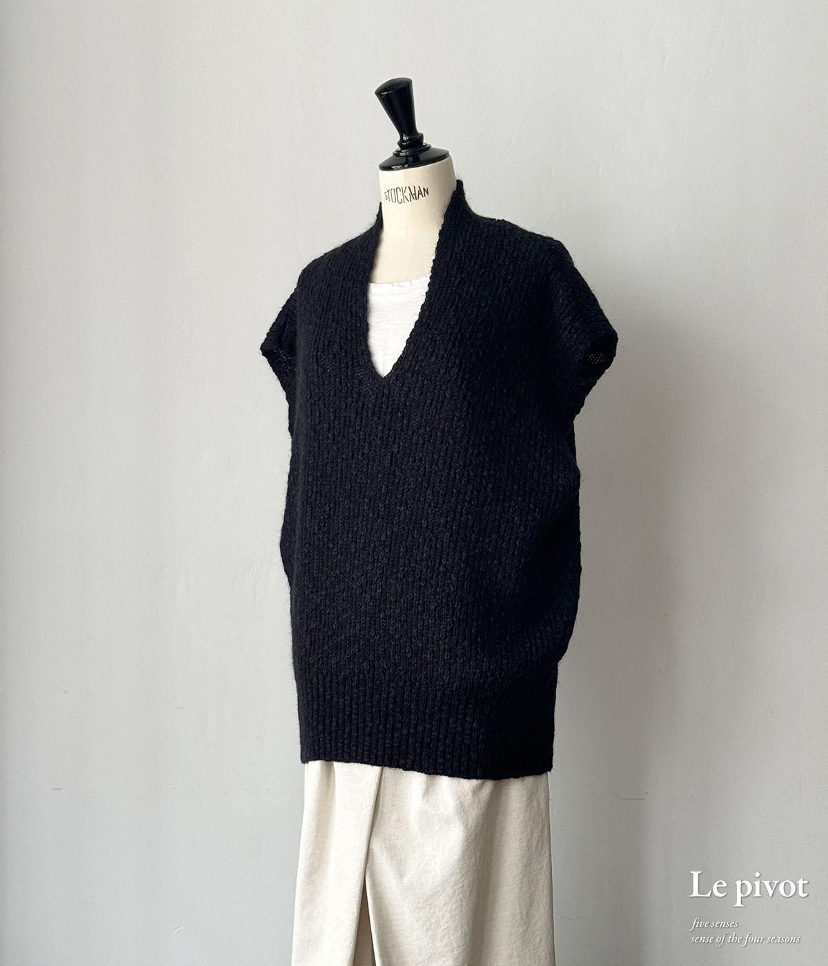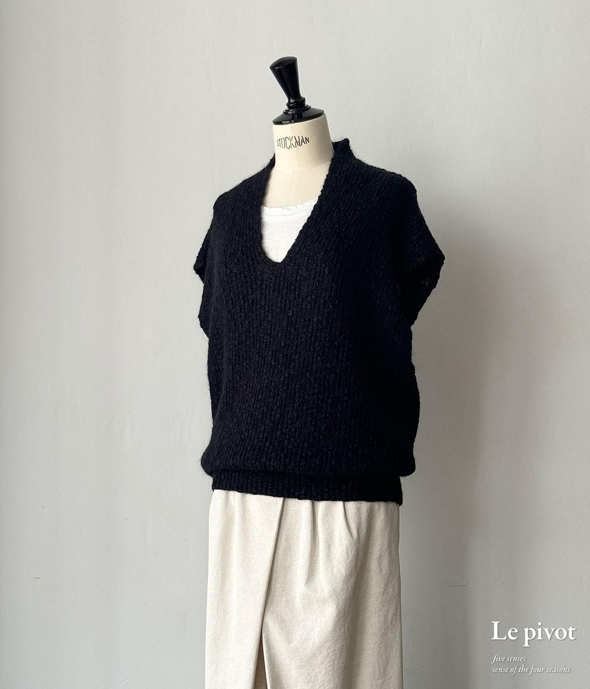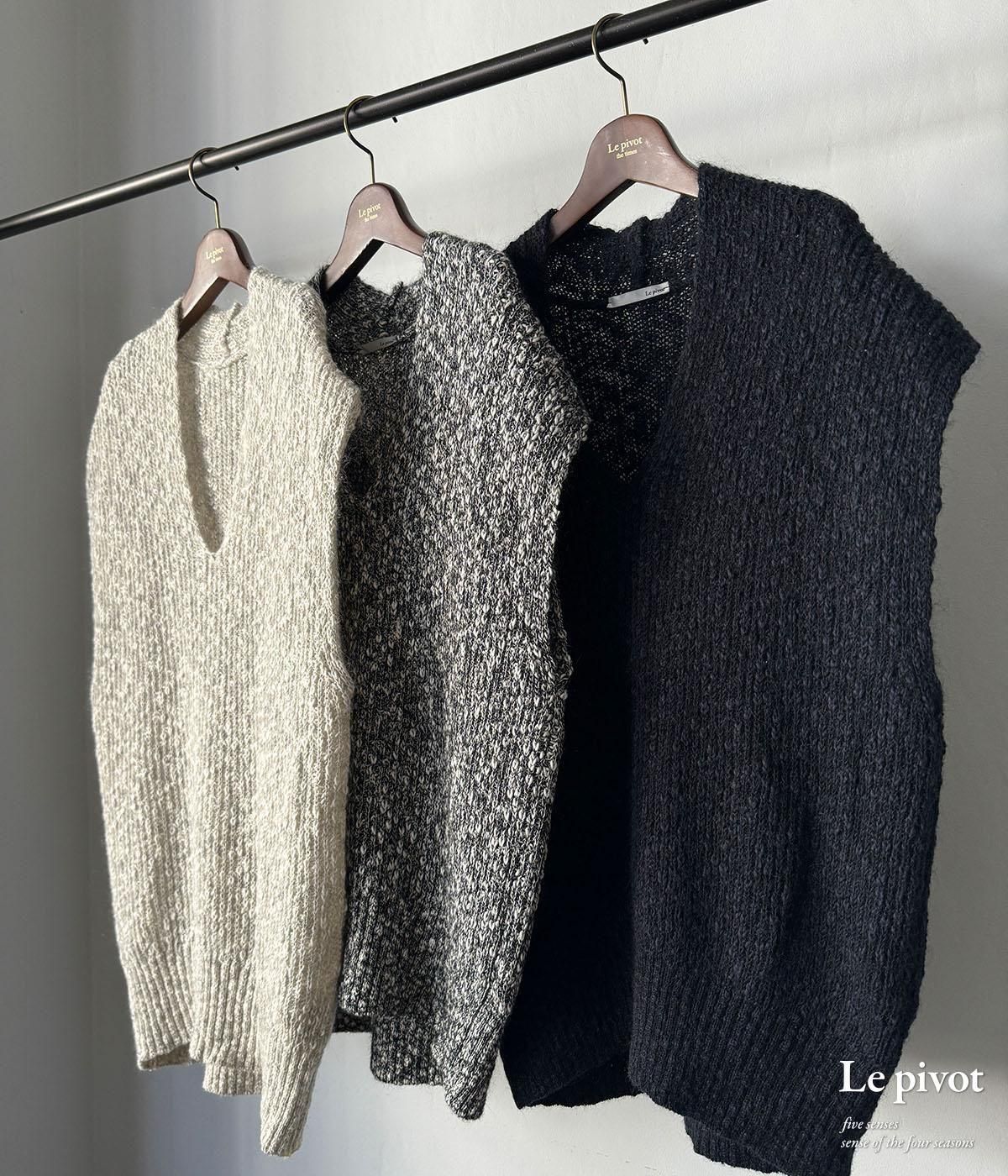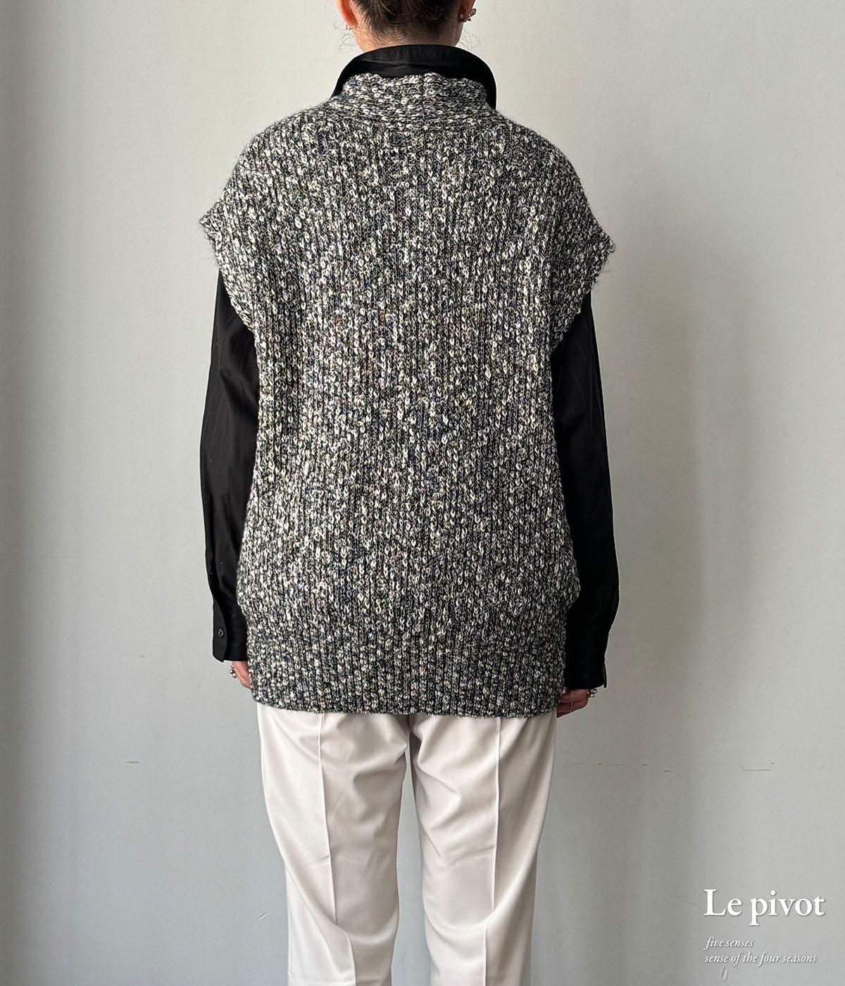 こちらは後ろ衿を高めにしたVネックベストです。 糸自体に表情があるので、合わせやすいようにシンプルな形のベストにしました。