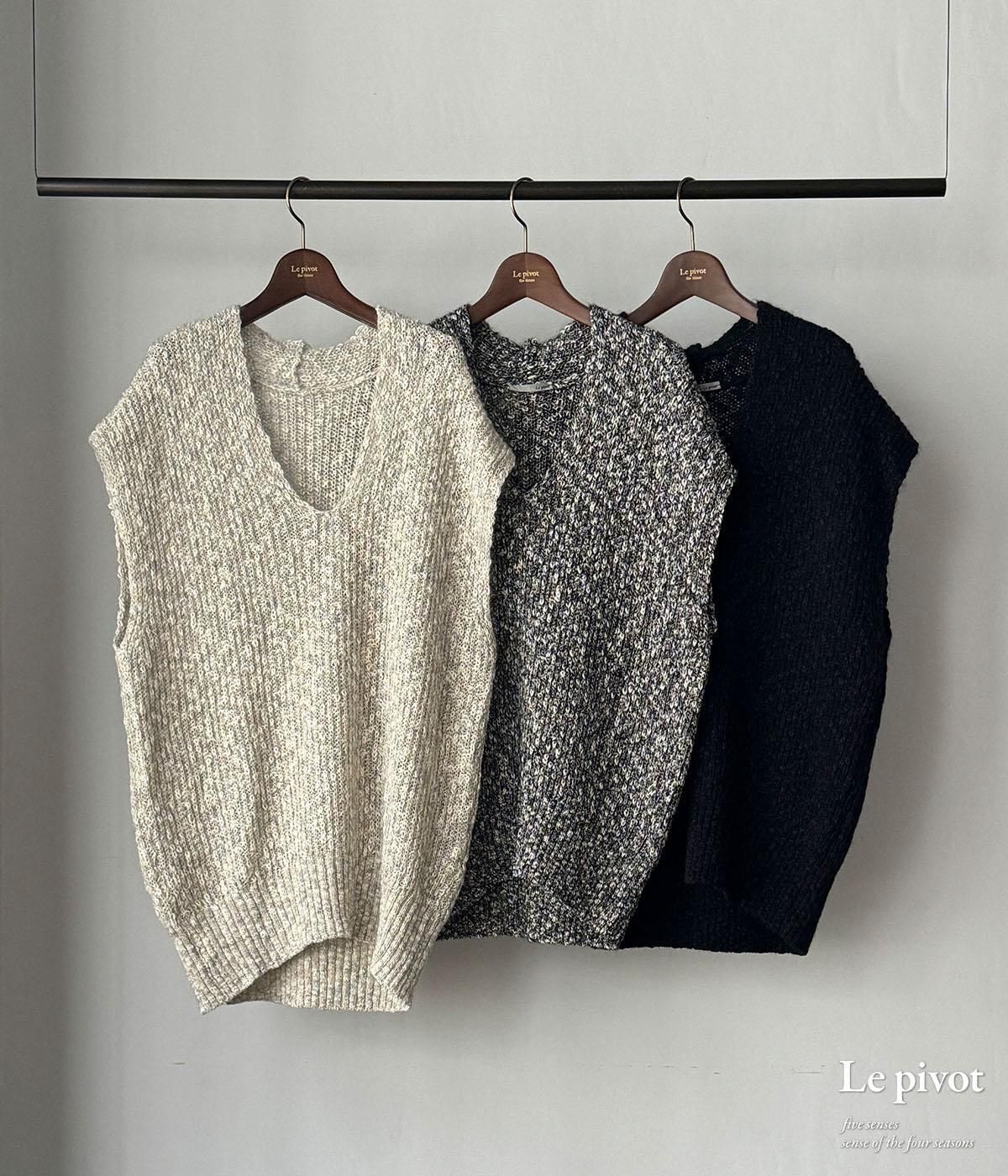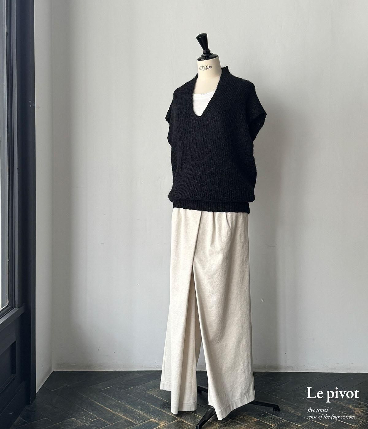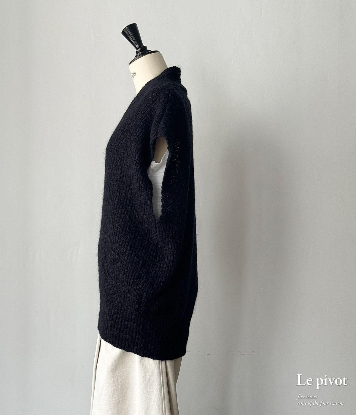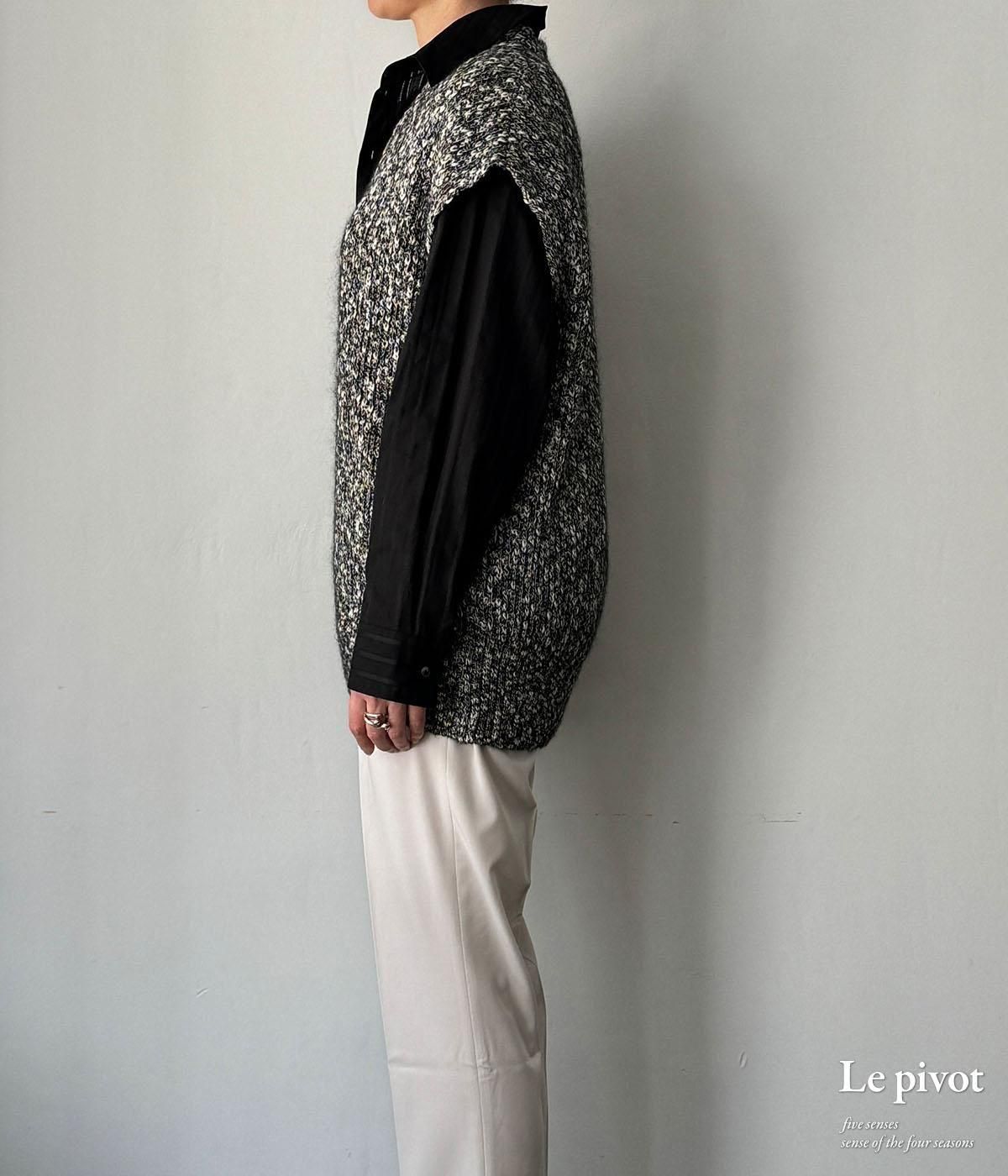 こちらは後ろ衿を高めにしたVネックベストです。 糸自体に表情があるので、合わせやすいようにシンプルな形のベストにしました。